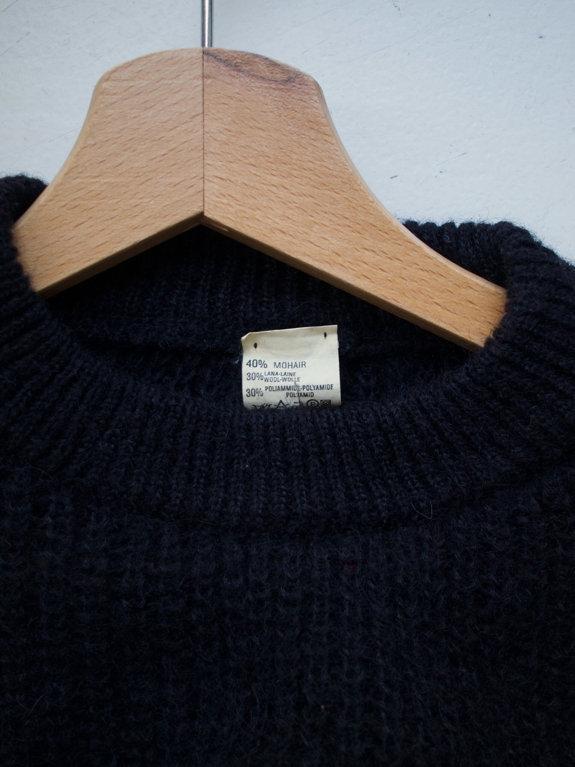 Unikatowy sweter vintage o luźnym fasonie. Wykonany z bardzo puszystej mieszanki moheru, wełny oraz poliamidu. Jest „gryzący”.