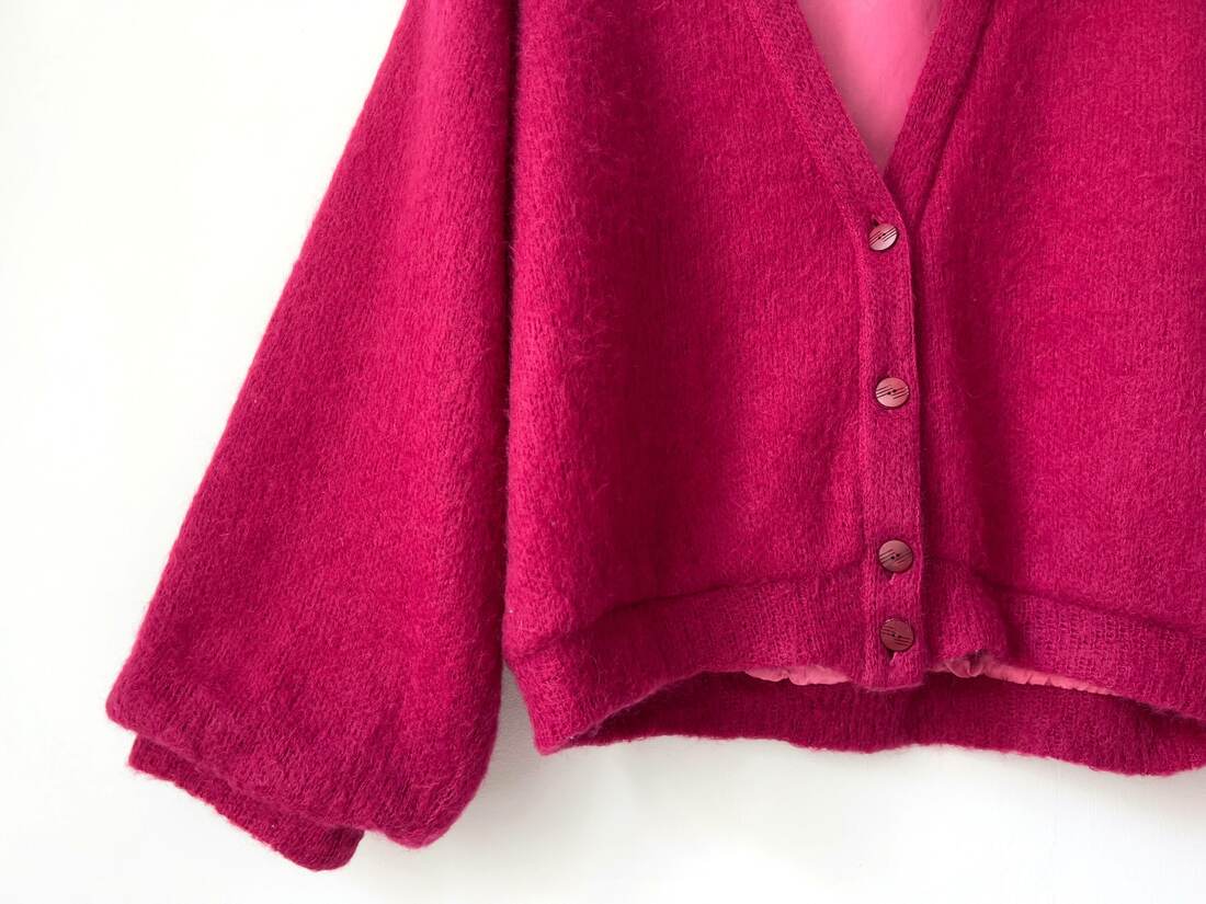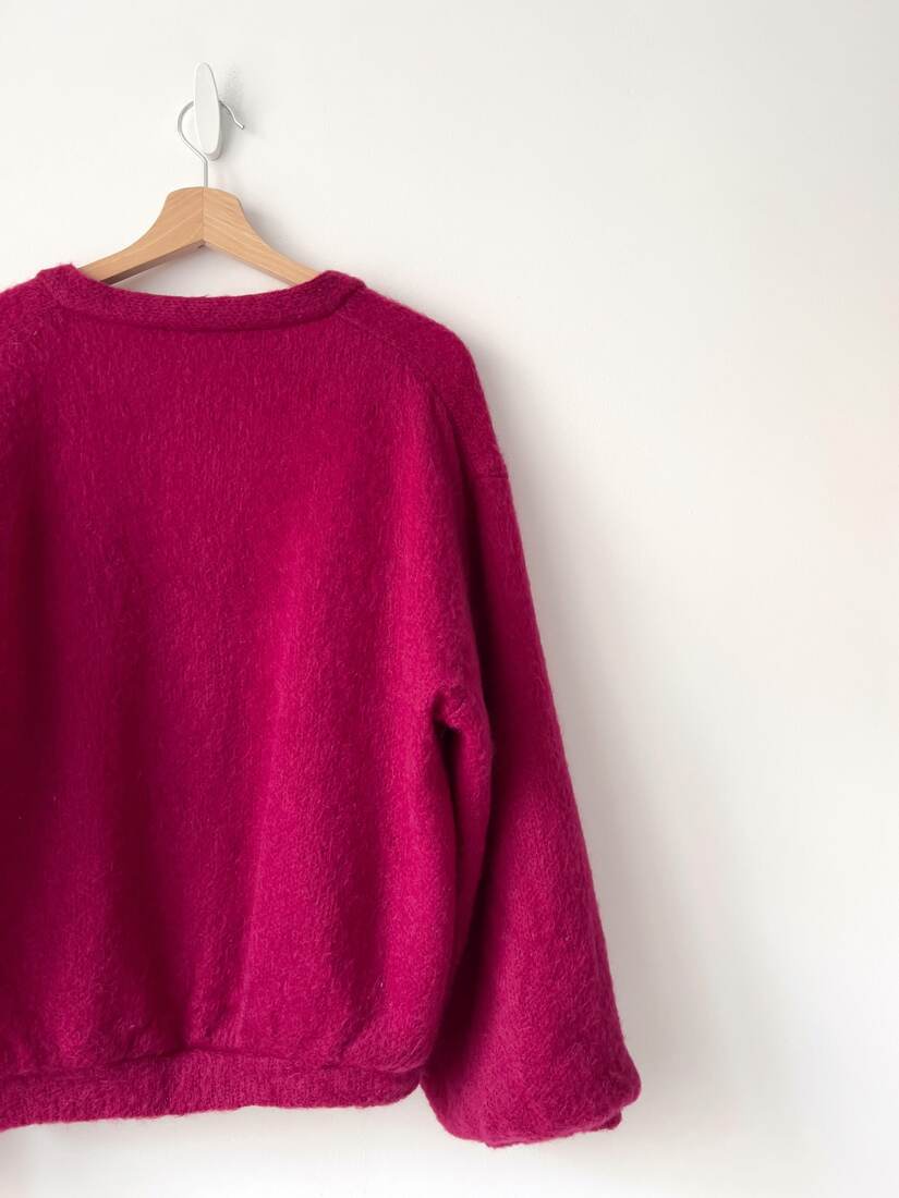Sweter o luźnym kroju, z mega bufiastymi rękawami. Brak metki ze składem, jest to moher. Sweter ma podszewkę i może być noszony jako kurtka. Zależnie od preferowanego dopasowania będzie pasować na S-M-L. Bardzo dobry stan.