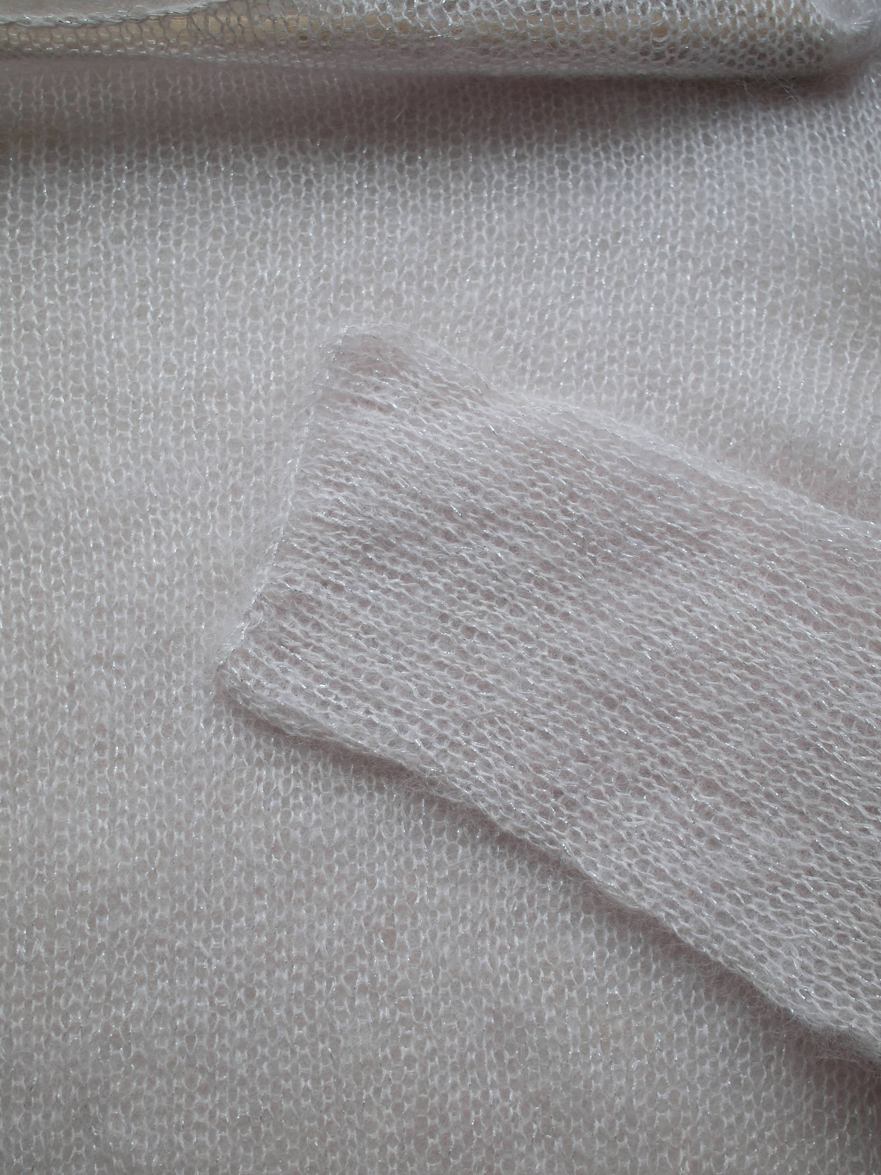 Ręcznie robiony sweter, wykonany z bardzo miłej i puszystej włoczki z małym dodatkiem nici metalizowanej.