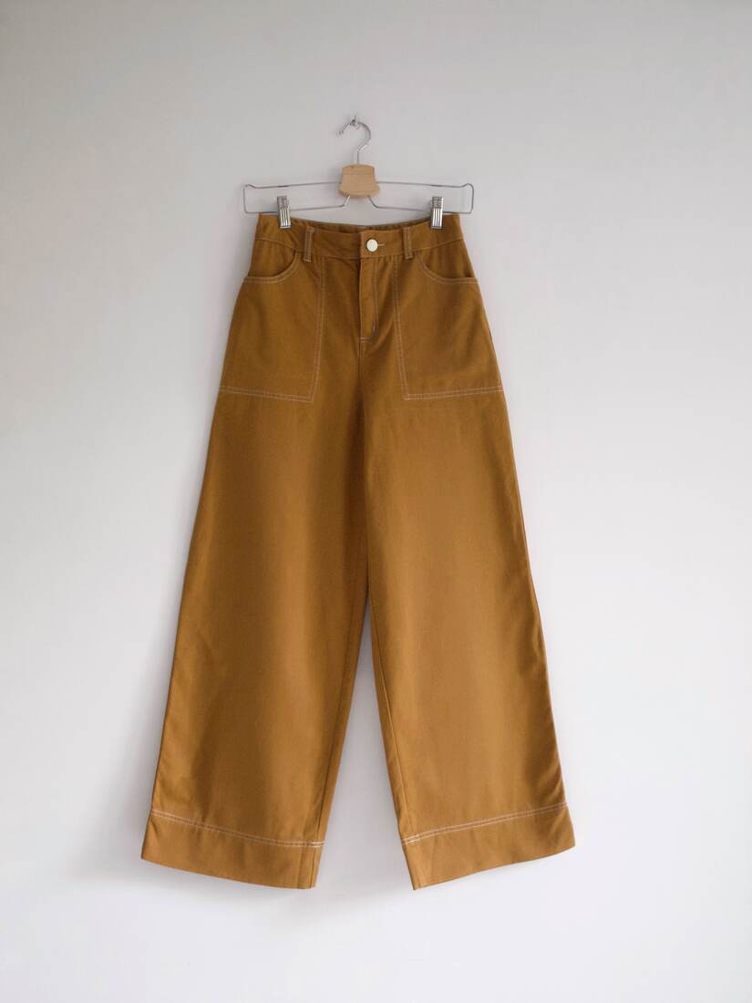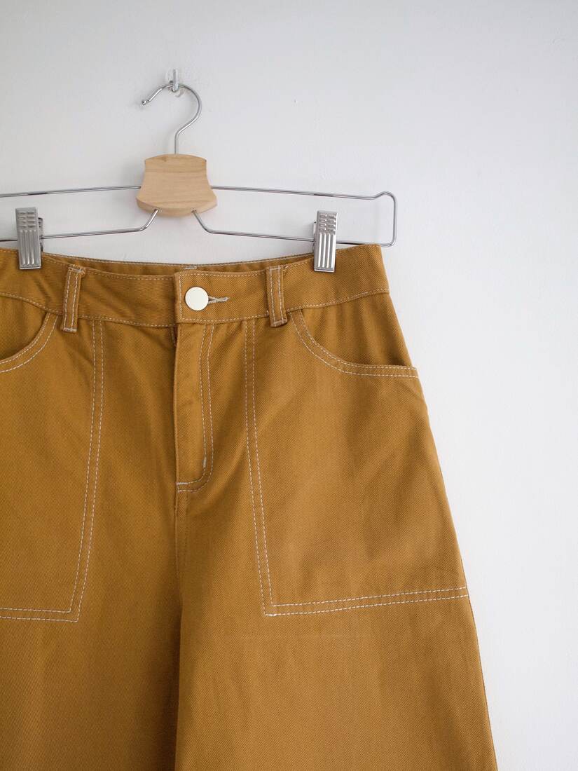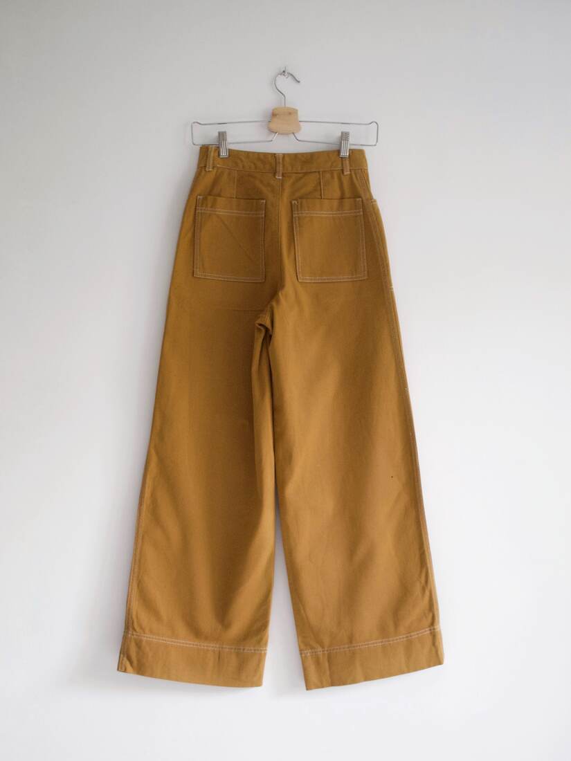 Wełniane spodnie vintage w kolorze camelowym. Zawężane w talii, dwie kieszeni, nogawki zawężane ku dołu, z tyłu małe elastyczne gumki. Rozmiar z metki 38, wymiary poniżej. Bez wad.