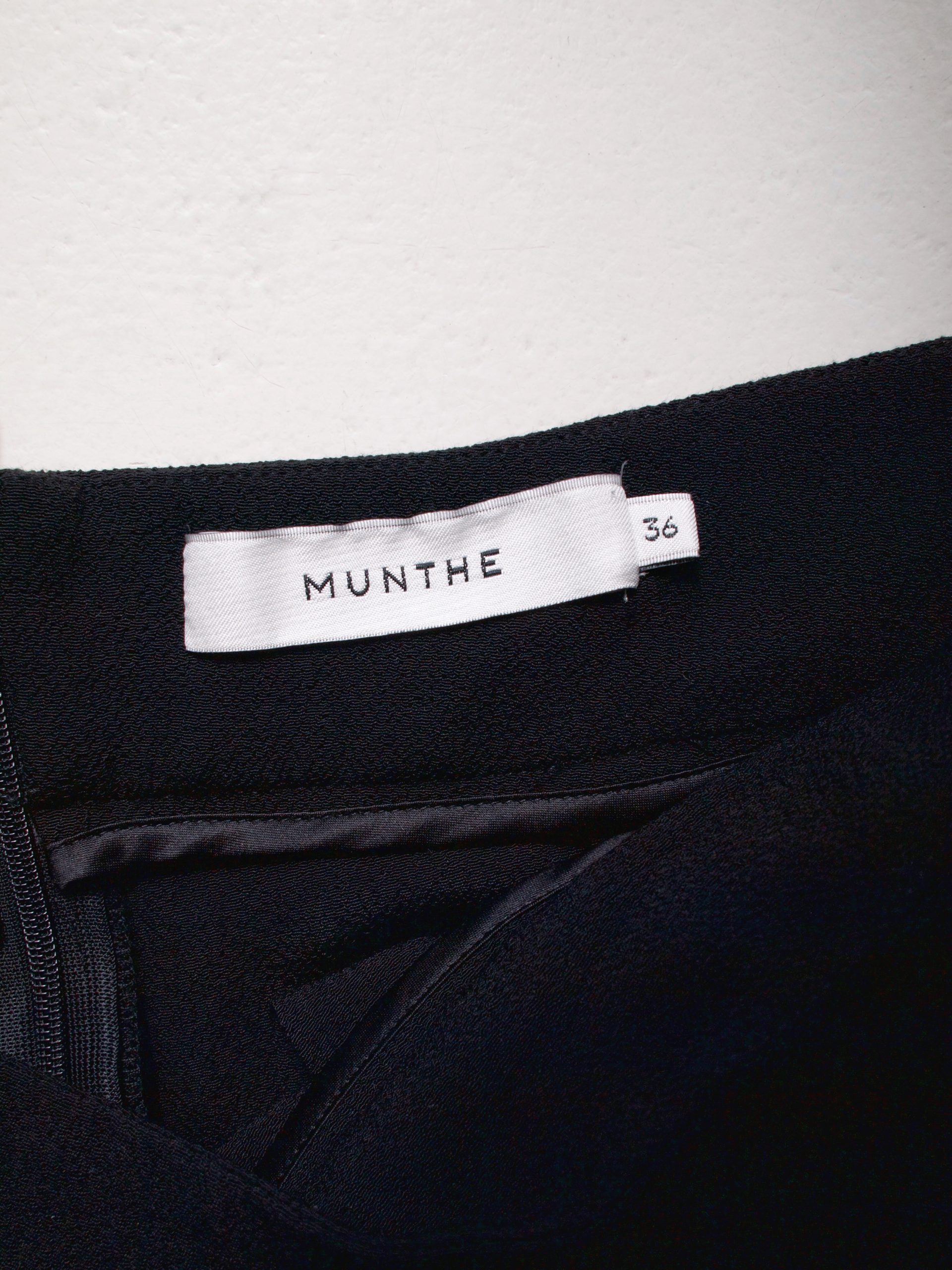 Spódnica o kroju A-line, z zaszewką i ukrytym zamkiem z tyłu. Ekskluzywna duńska marka Munthe. Rozmiar z metki: 36 Skład: 100% wiskoza Stan: bez wad Szerokość w pasie 36 cm Długość całkowita 72 cm