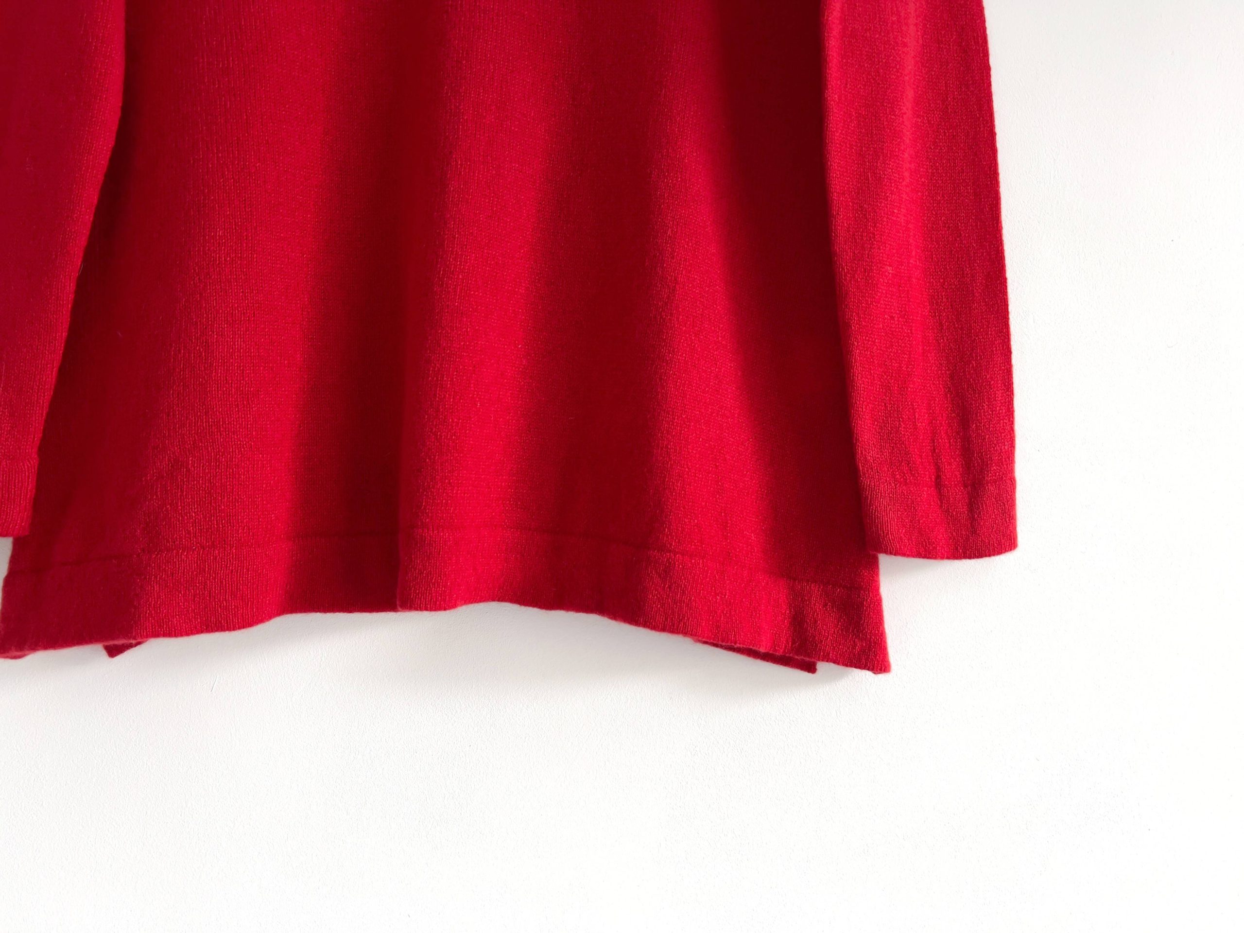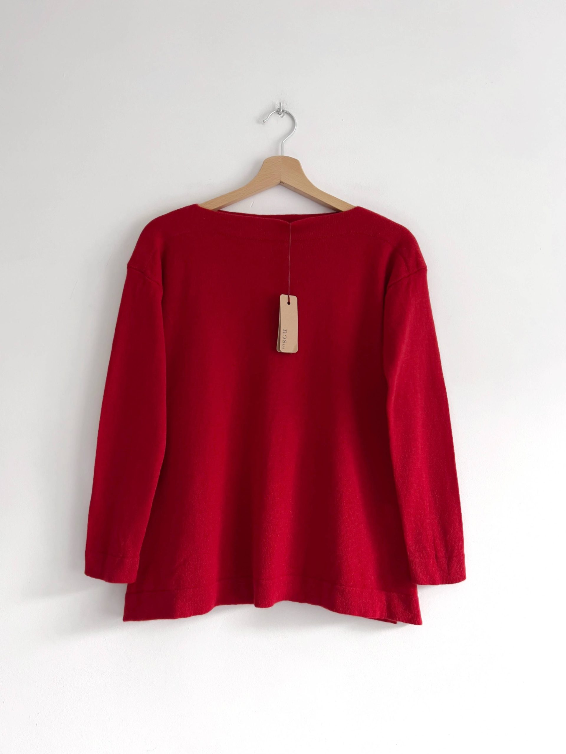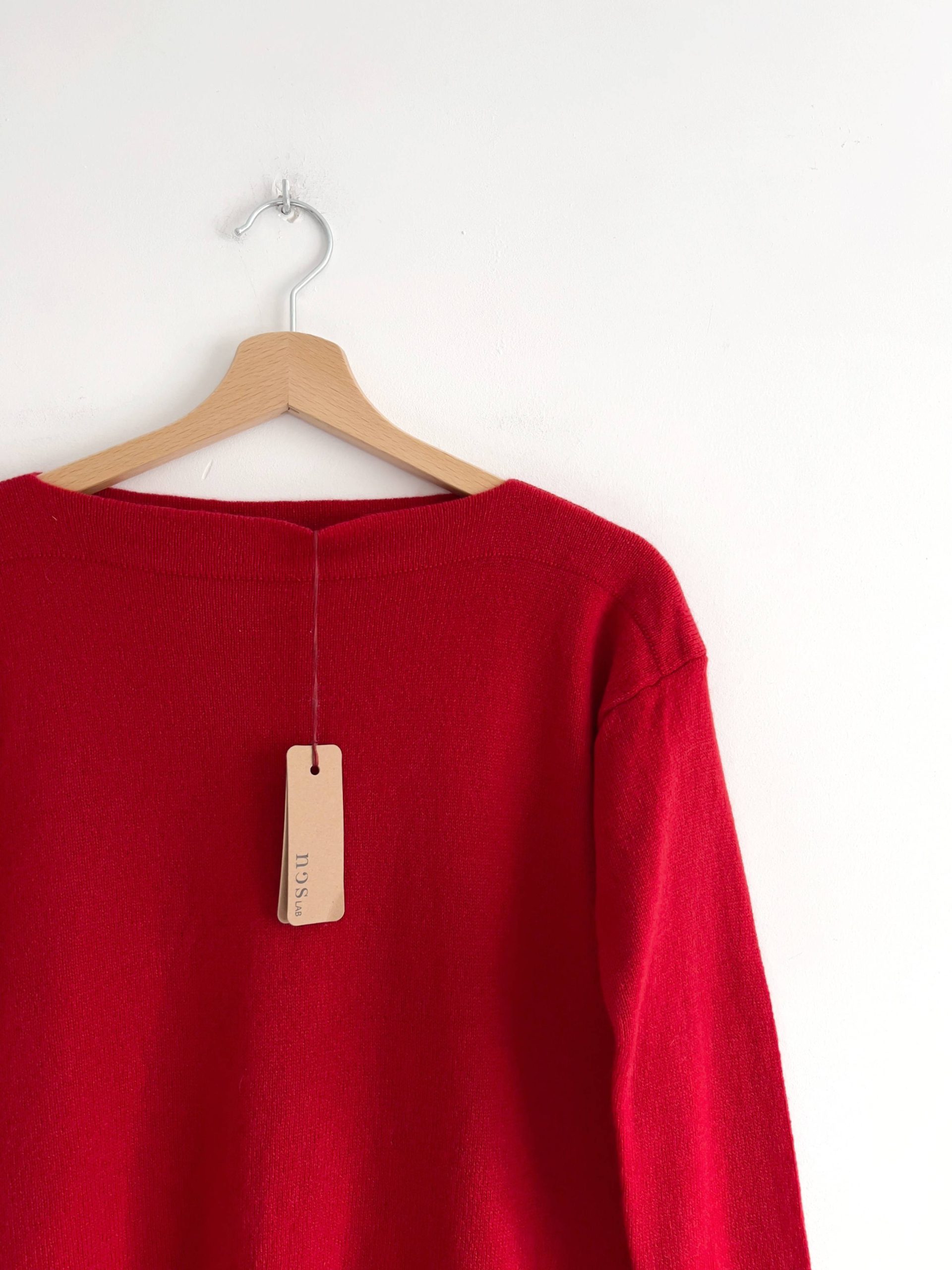 Kaszmirowy sweter o poszerzanym ku dołowi fasonie, z dekoltem w łódkę. Rozmiar z metki M, nowy z metką.