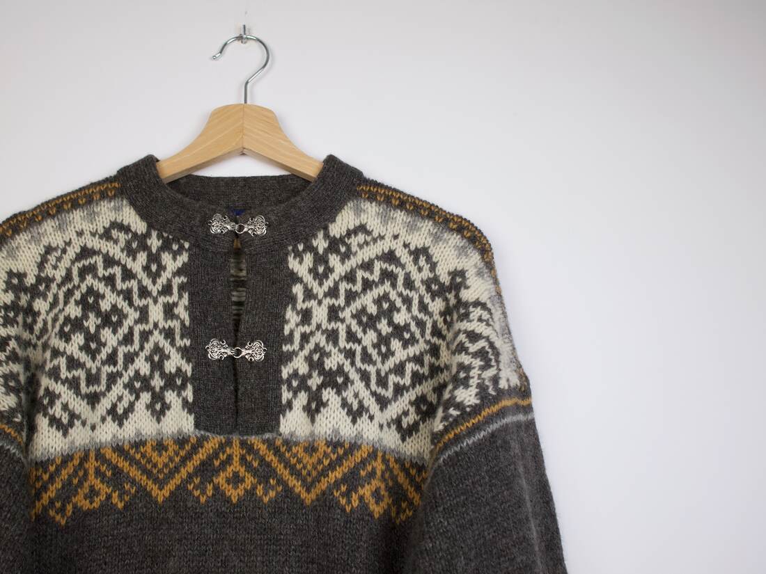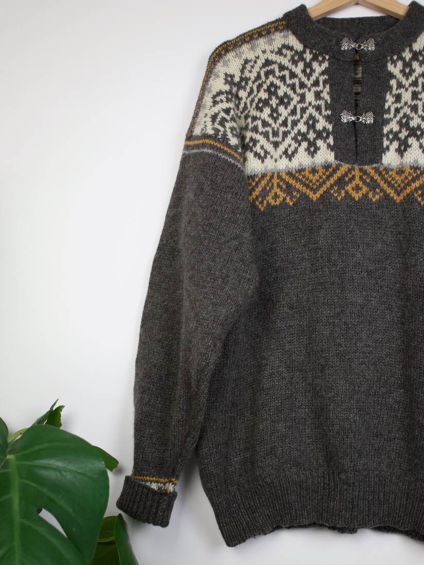 Norweski wełniany sweter we wzory. Luźny fason, zapinany na metalowe klamerki. Bez wad.