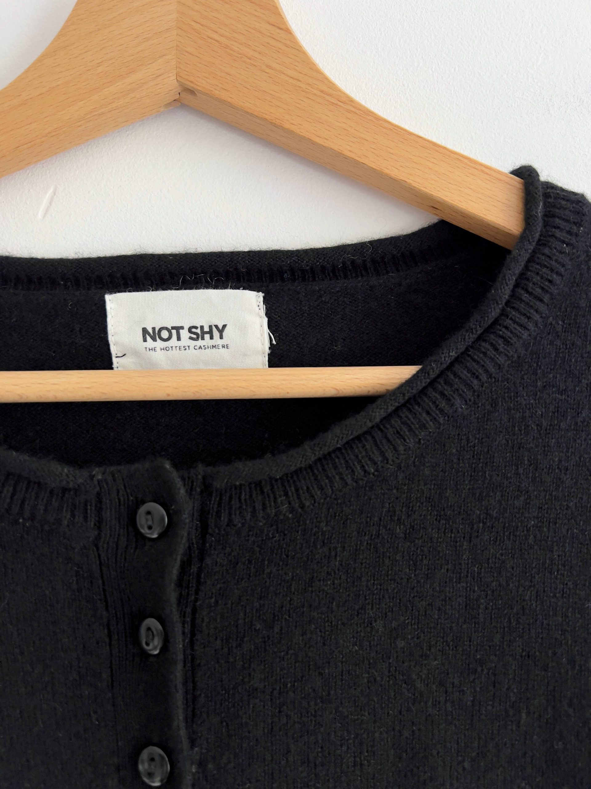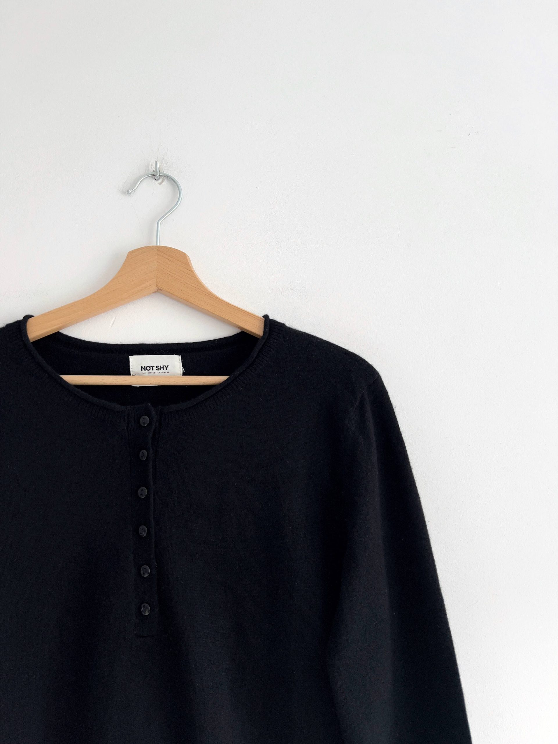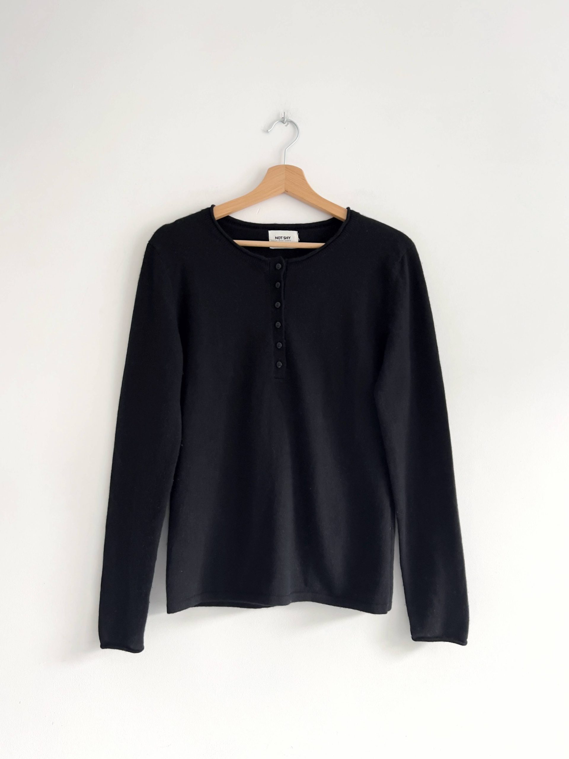 Kaszmirowy sweter ekskluzywnej francuskiej marki Not Shy, cena katalogowa ponad 200 euro. Prosty fason, dekolt zapinany na guziki. Polecam na XS-S, bez wad.