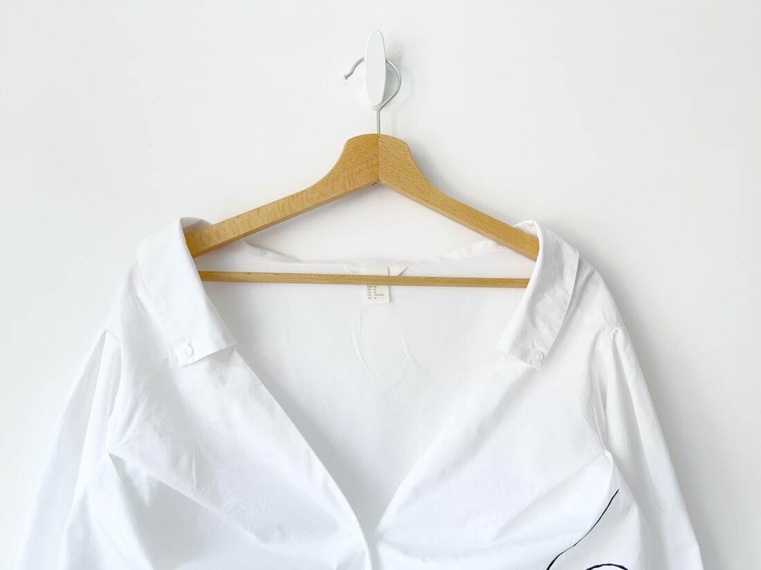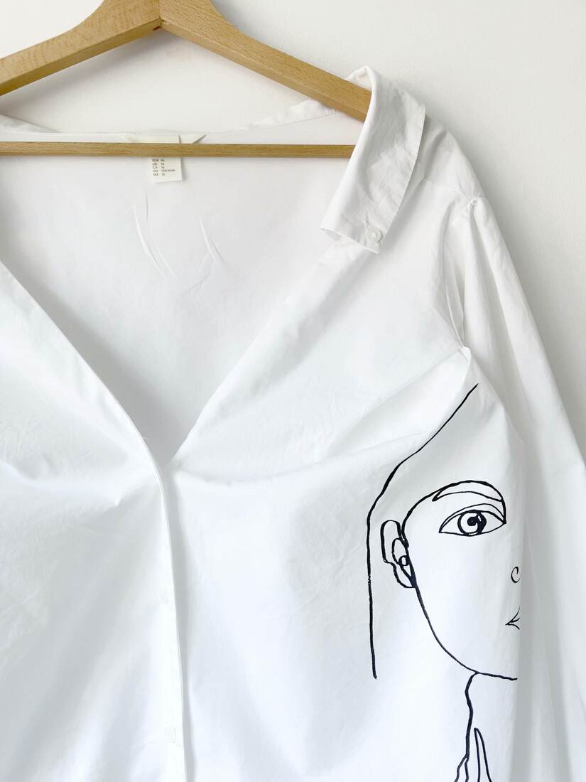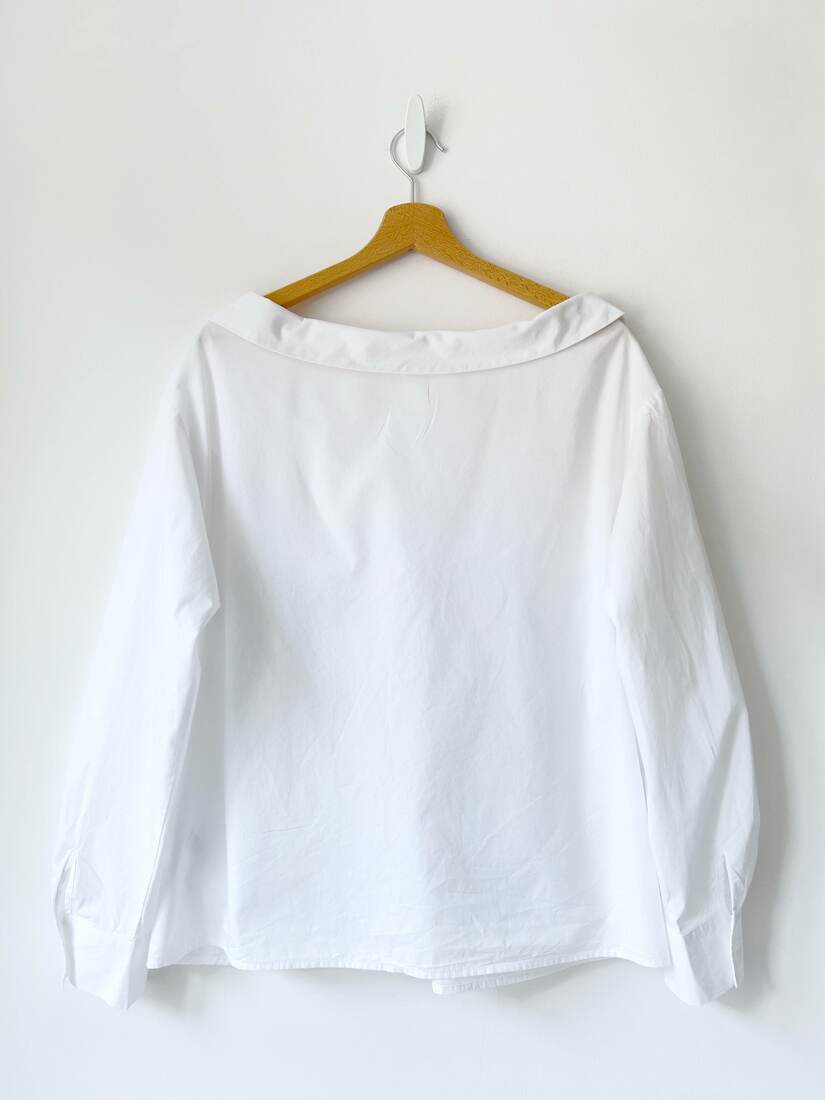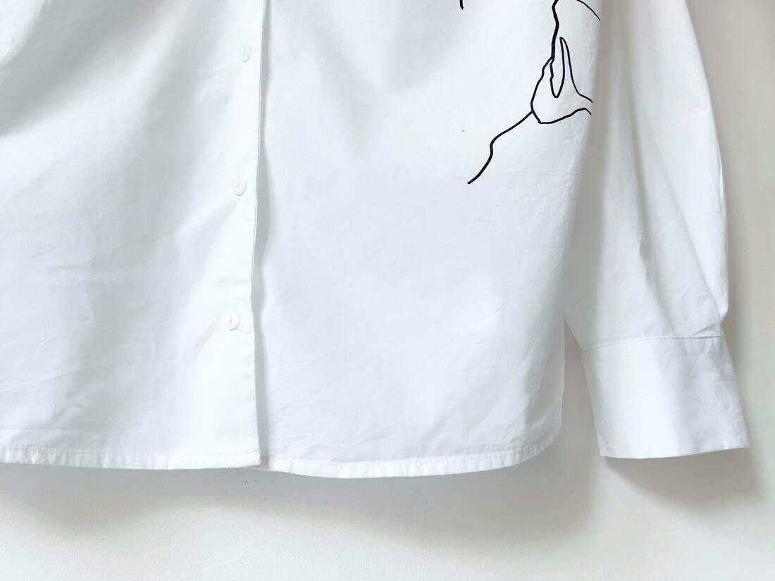 Bawełniana koszula z minimalistycznym nadrukiem. Dekolt off shoulder odsłaniający ramiona. Rozmiar z metki 46, bez wad.