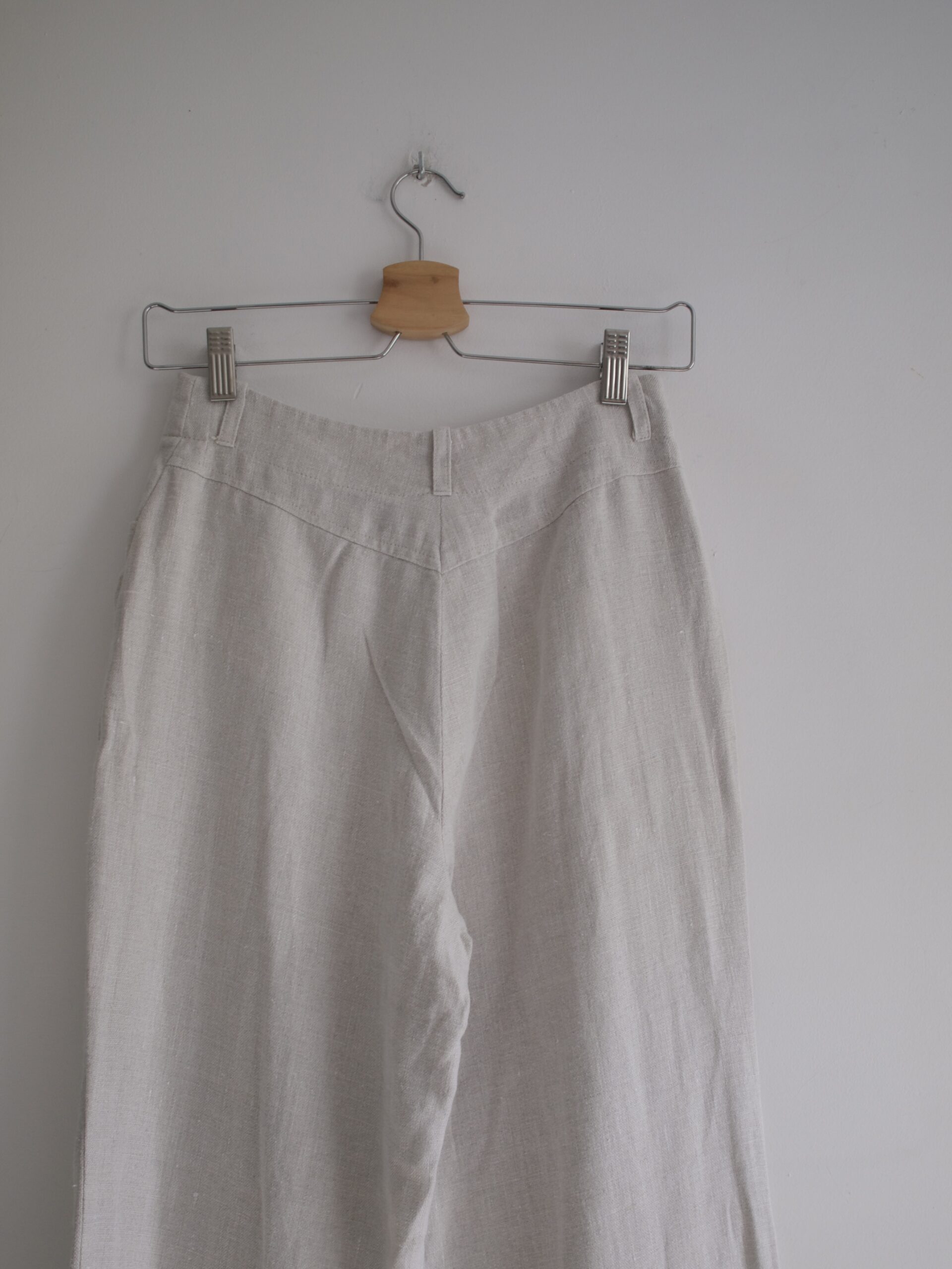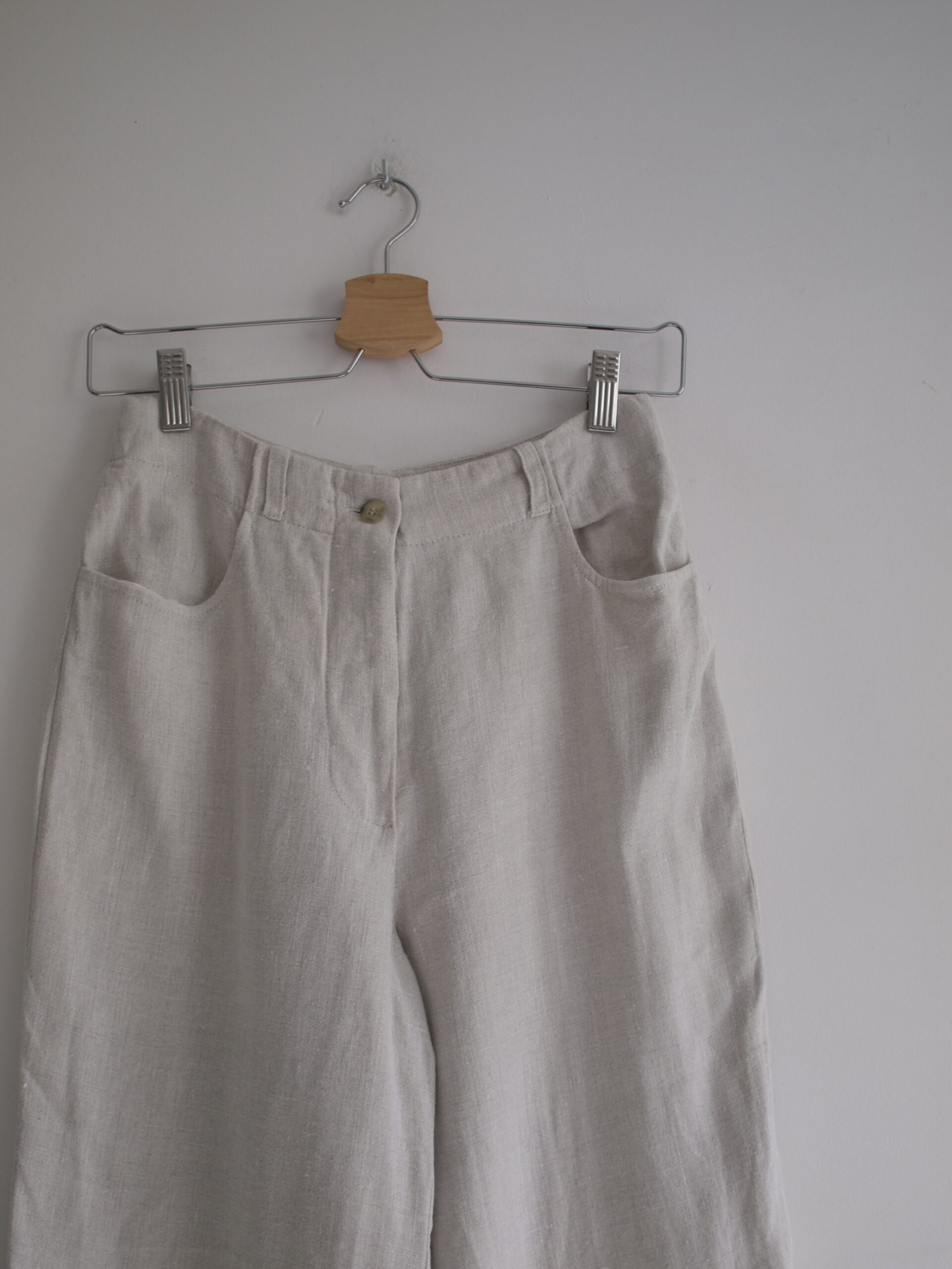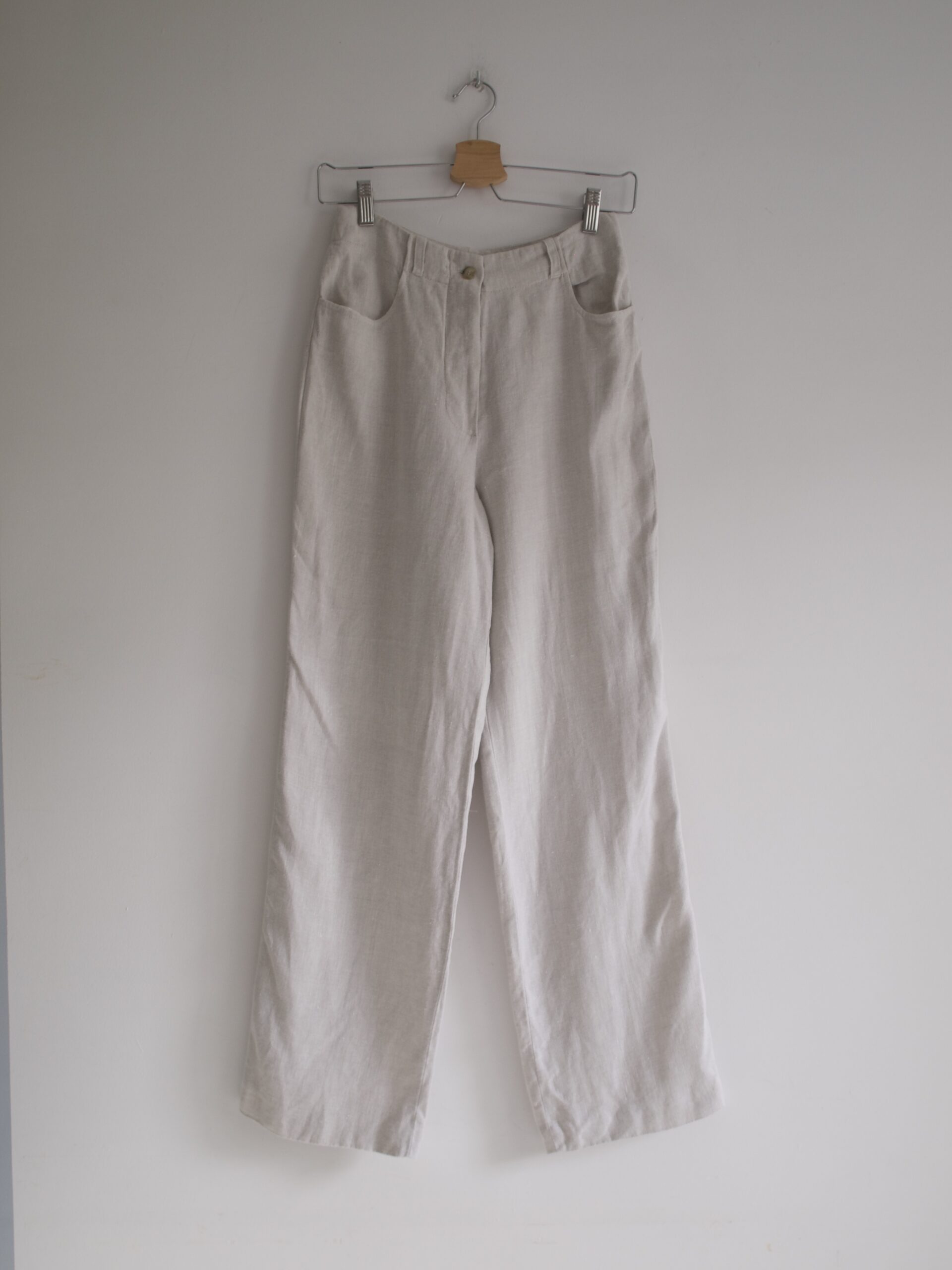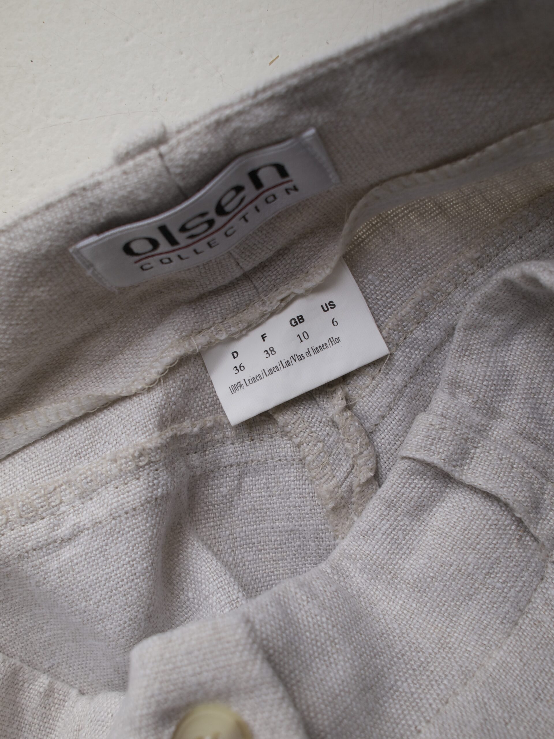 Spódnica wykonana z materiału z dużym dodatkiem lnu. Na całej długości zapinana na guziki, w pasie gumka, dwie kieszenie. Rozmiar z metki M, będzie dobra także na S. Wymiary poniżej, bez wad.