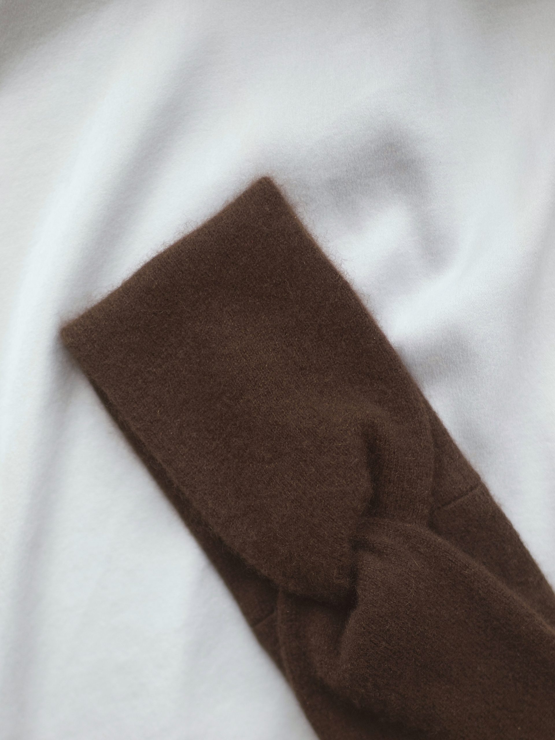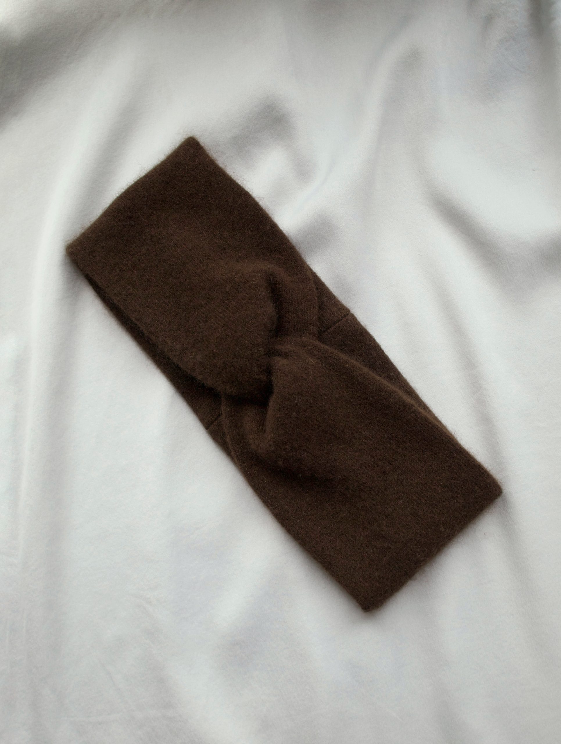 Ciepła opaska na głowę w kolorze brązowym. W 100% szyta z kaszmiru z odzysku. Rozmiar uniwersalny. Skład: 100% kaszmir.