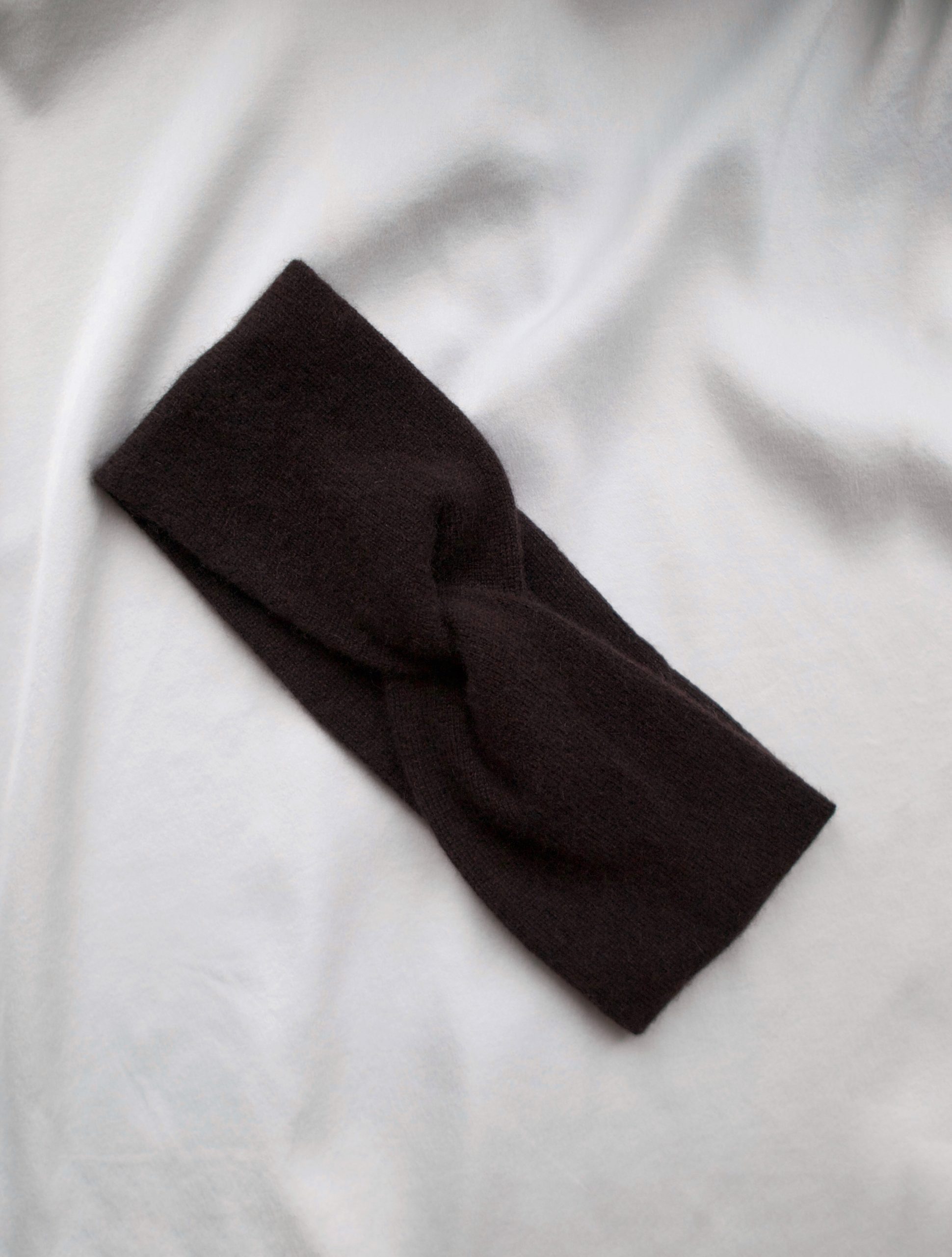 Ciepła opaska na głowę w kolorze ciemnej czekolady. W 100% szyta z kaszmiru z odzysku. Rozmiar uniwersalny. Skład: 100% kaszmir.
