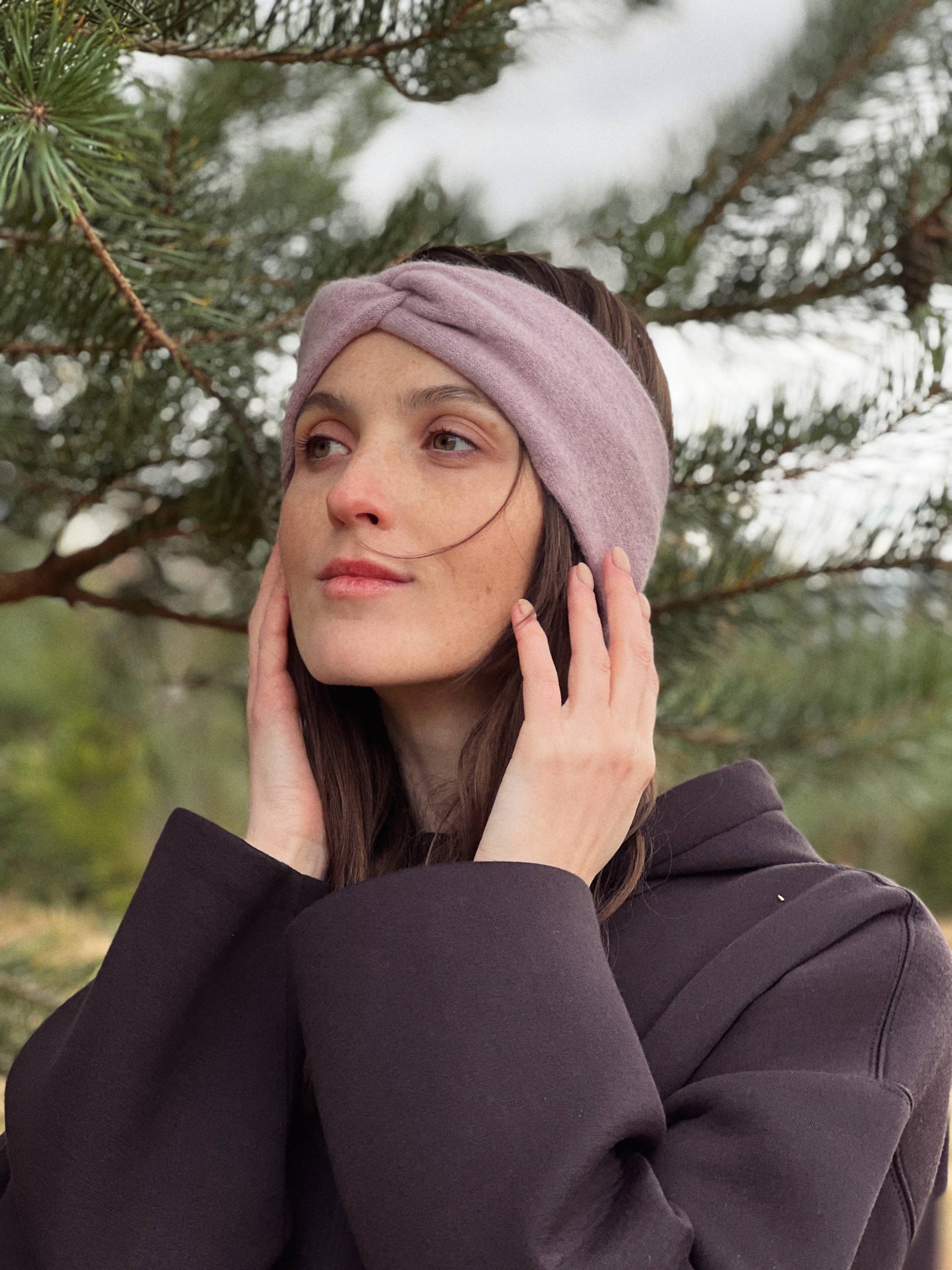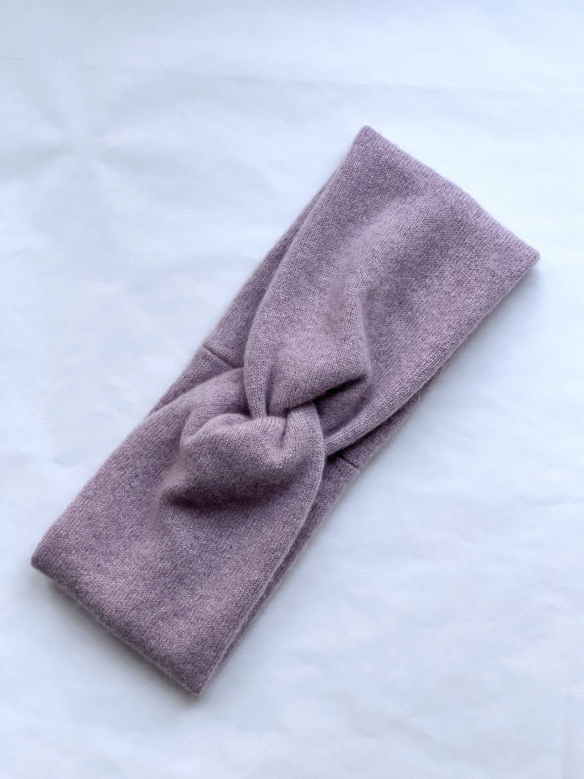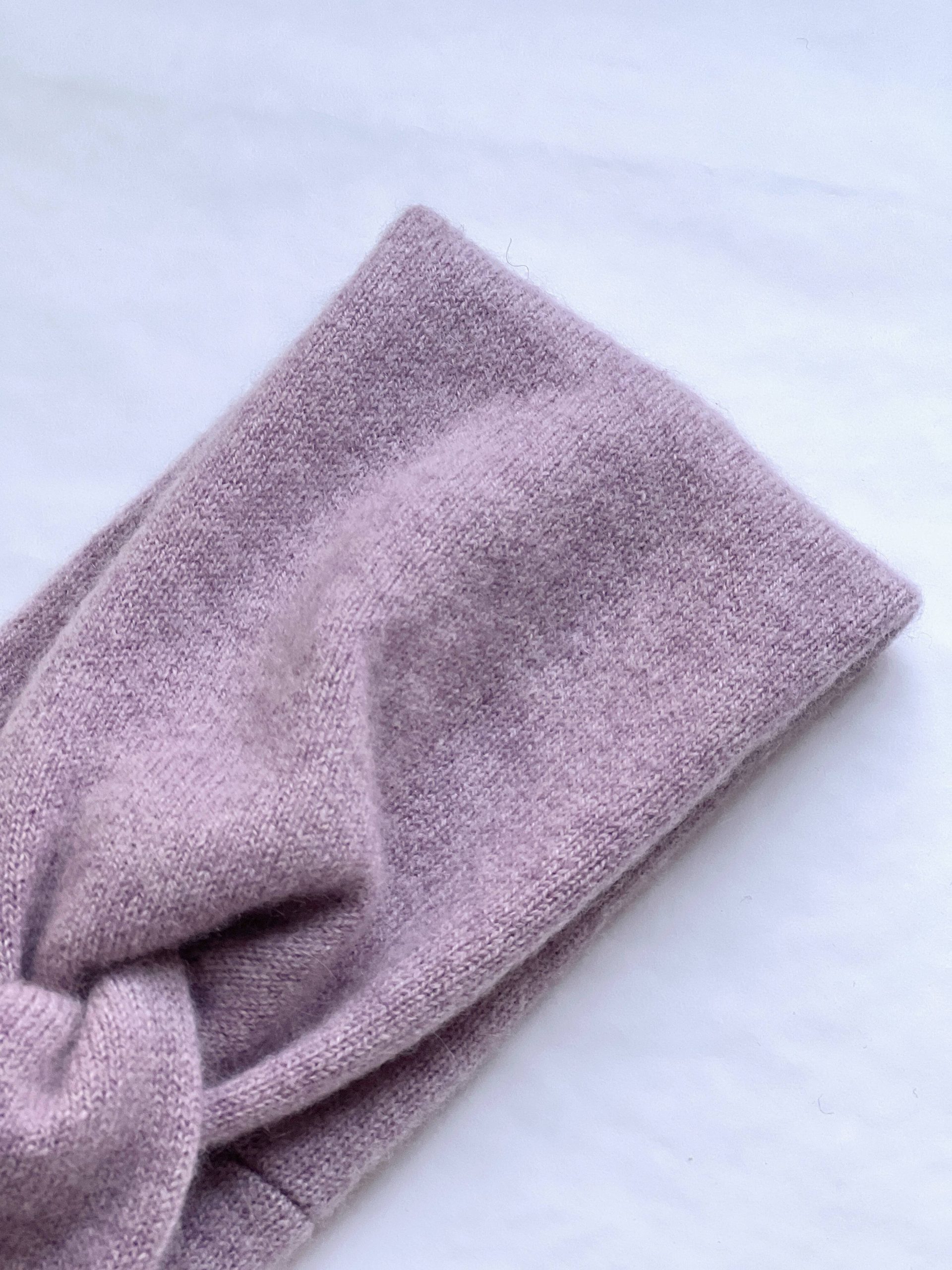 Ciepła opaska na głowę w kolorze liliowym. W 100% szyta z kaszmiru z odzysku. Szerokość 10 cm, średnica około 19 cm. Skład: 100% kaszmir