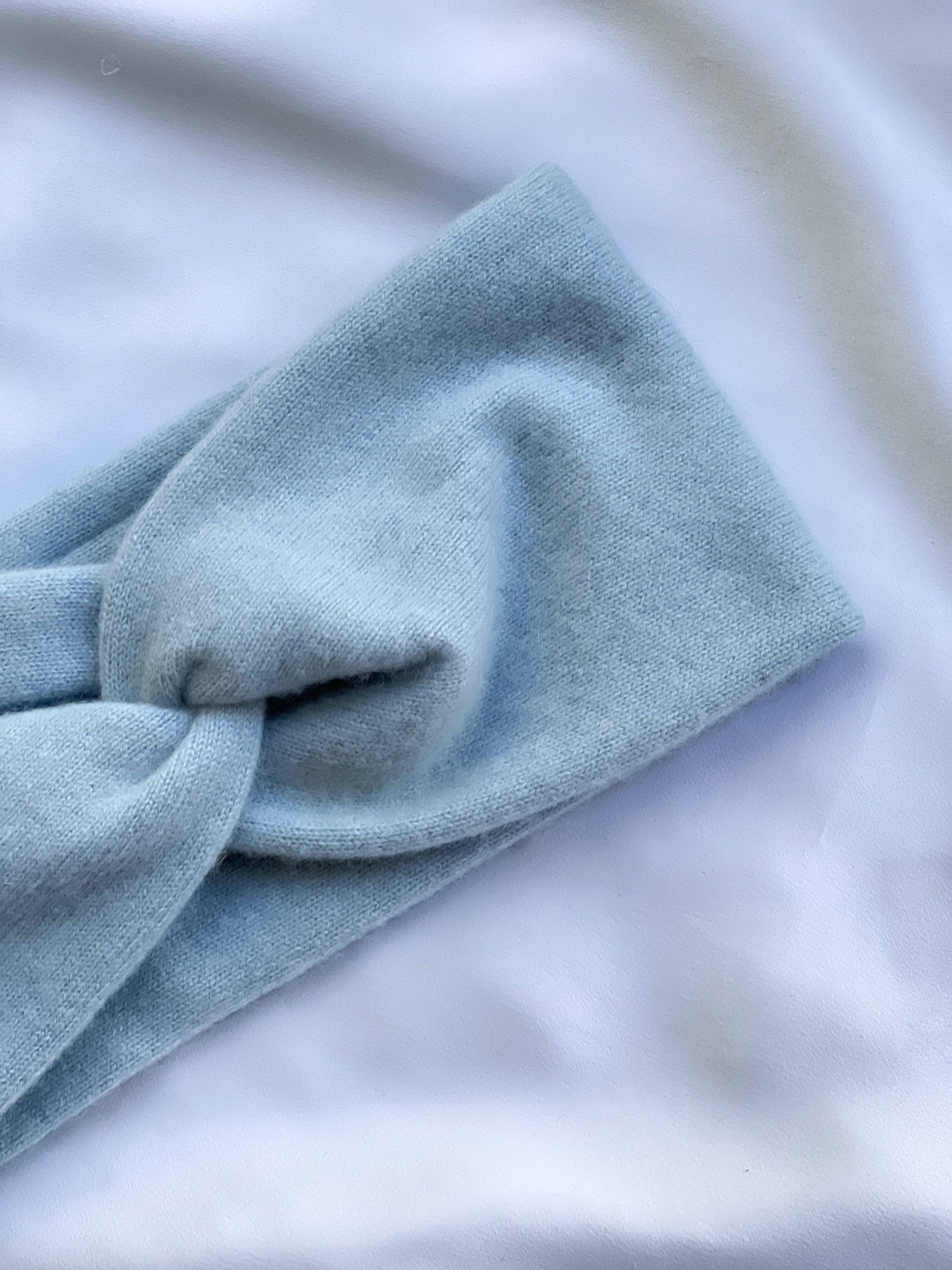 Ciepła opaska na głowę w 100% szyta z kaszmiru z odzysku. Kolor to pastelowy jasnoniebieski, rozmiar uniwersalny.
