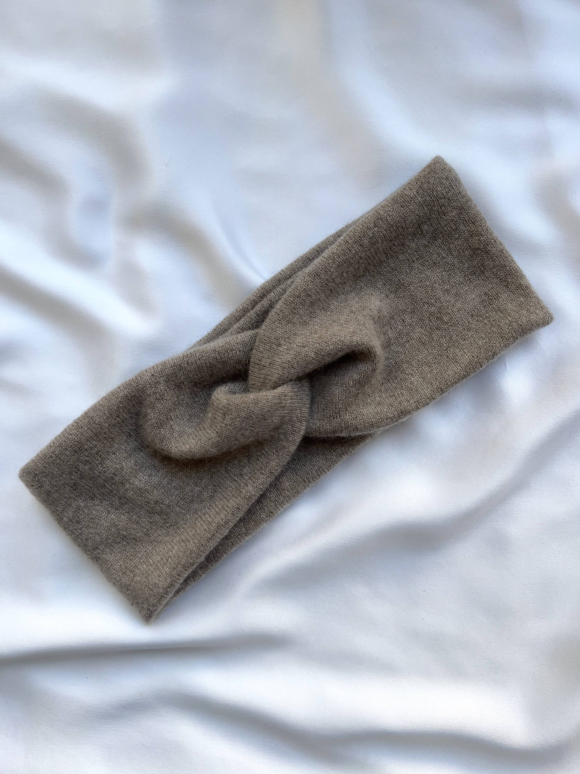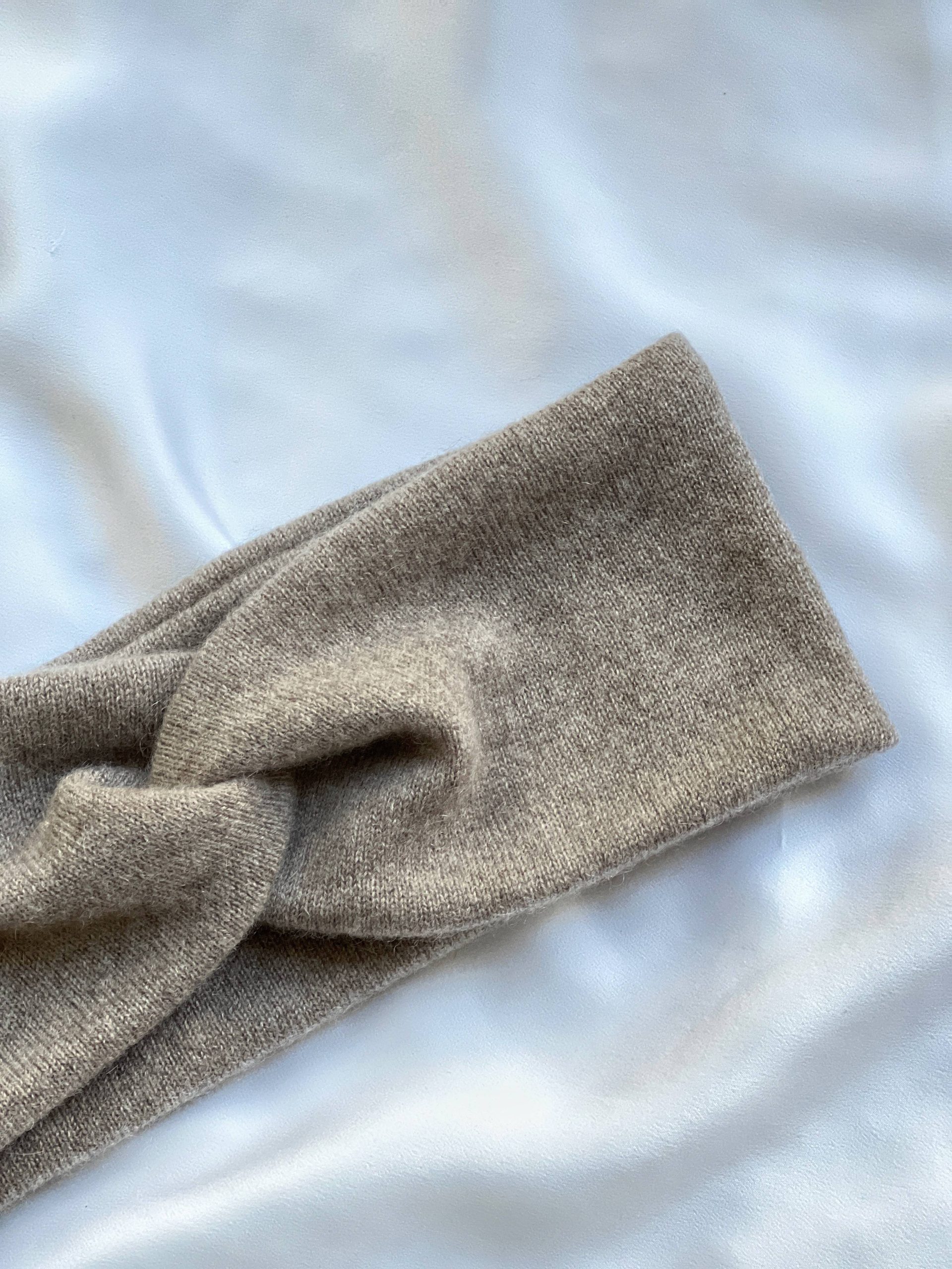 Ciepła opaska na głowę w kolorze szarobeżowym. W 100% szyta z kaszmiru z odzysku.