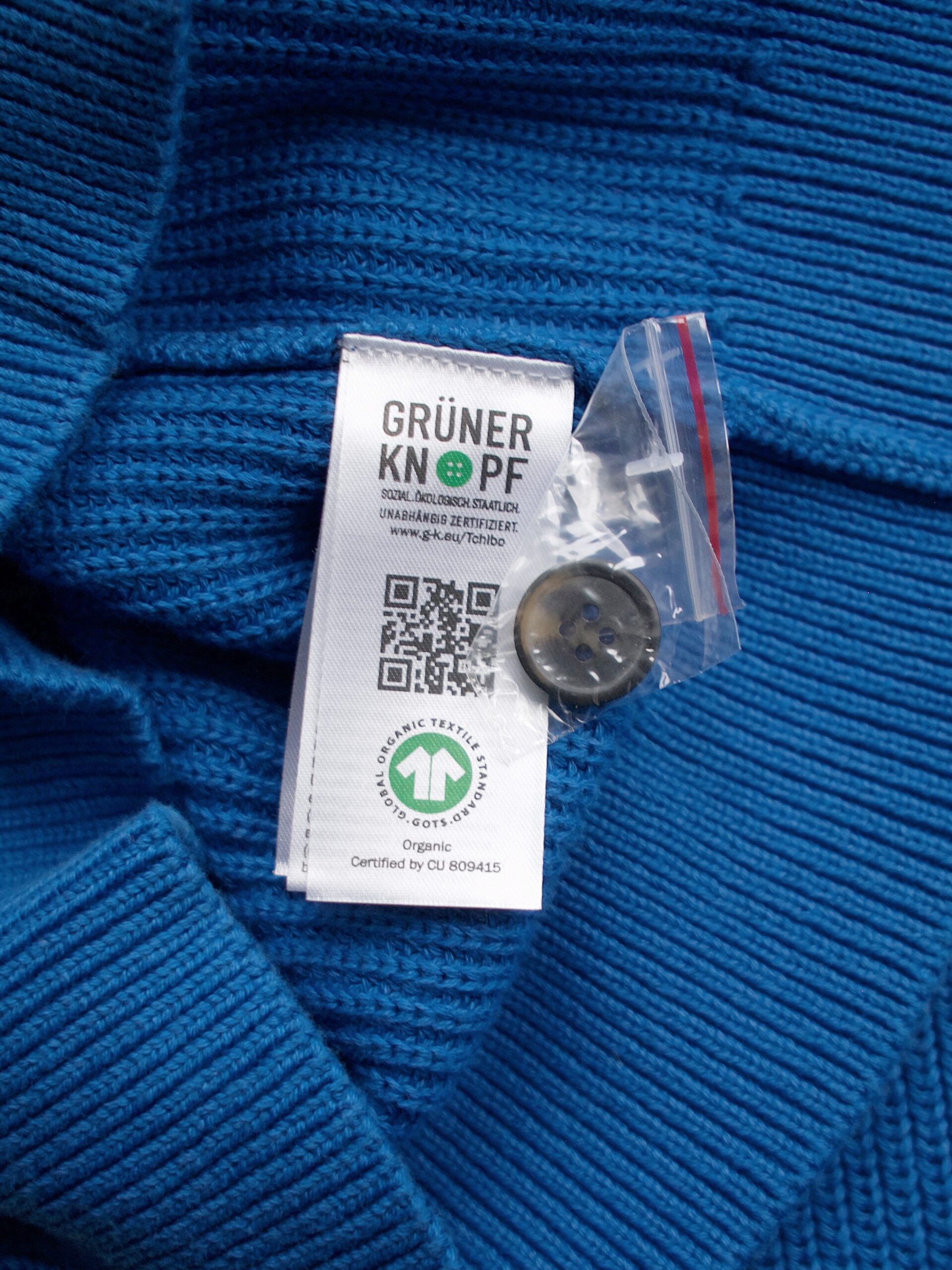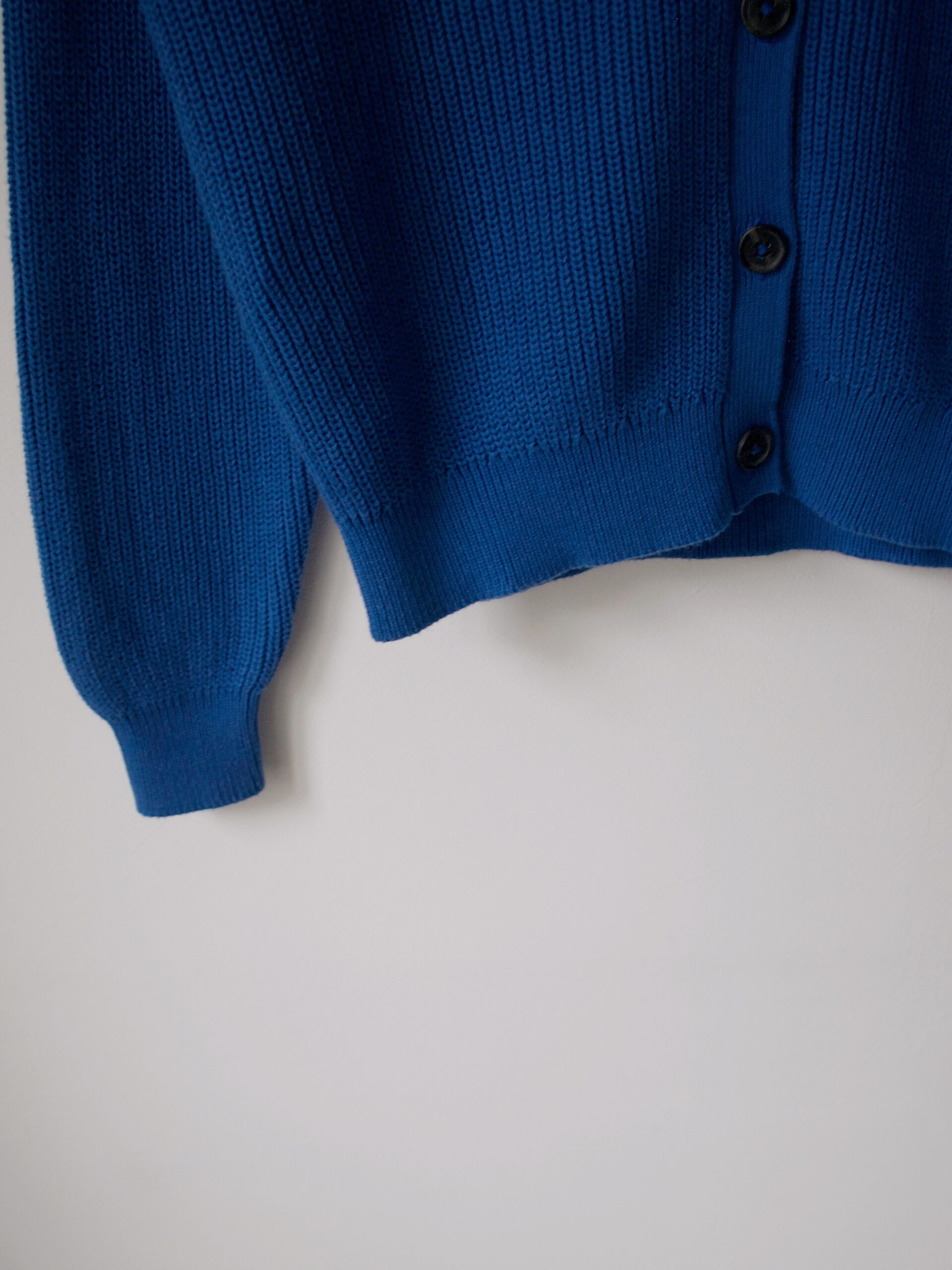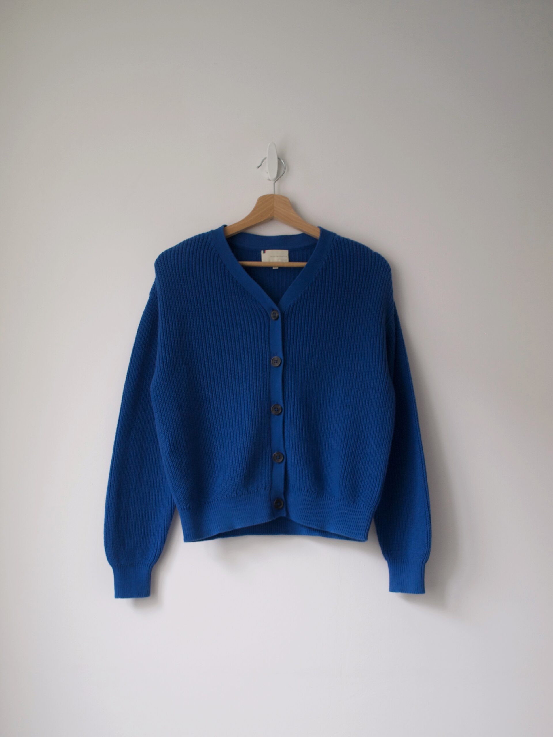 Chabrowy kardigan, w 100% wykonany z bawełny organicznej. Krótszy fason, idealny do spodni z wysokim stanem.