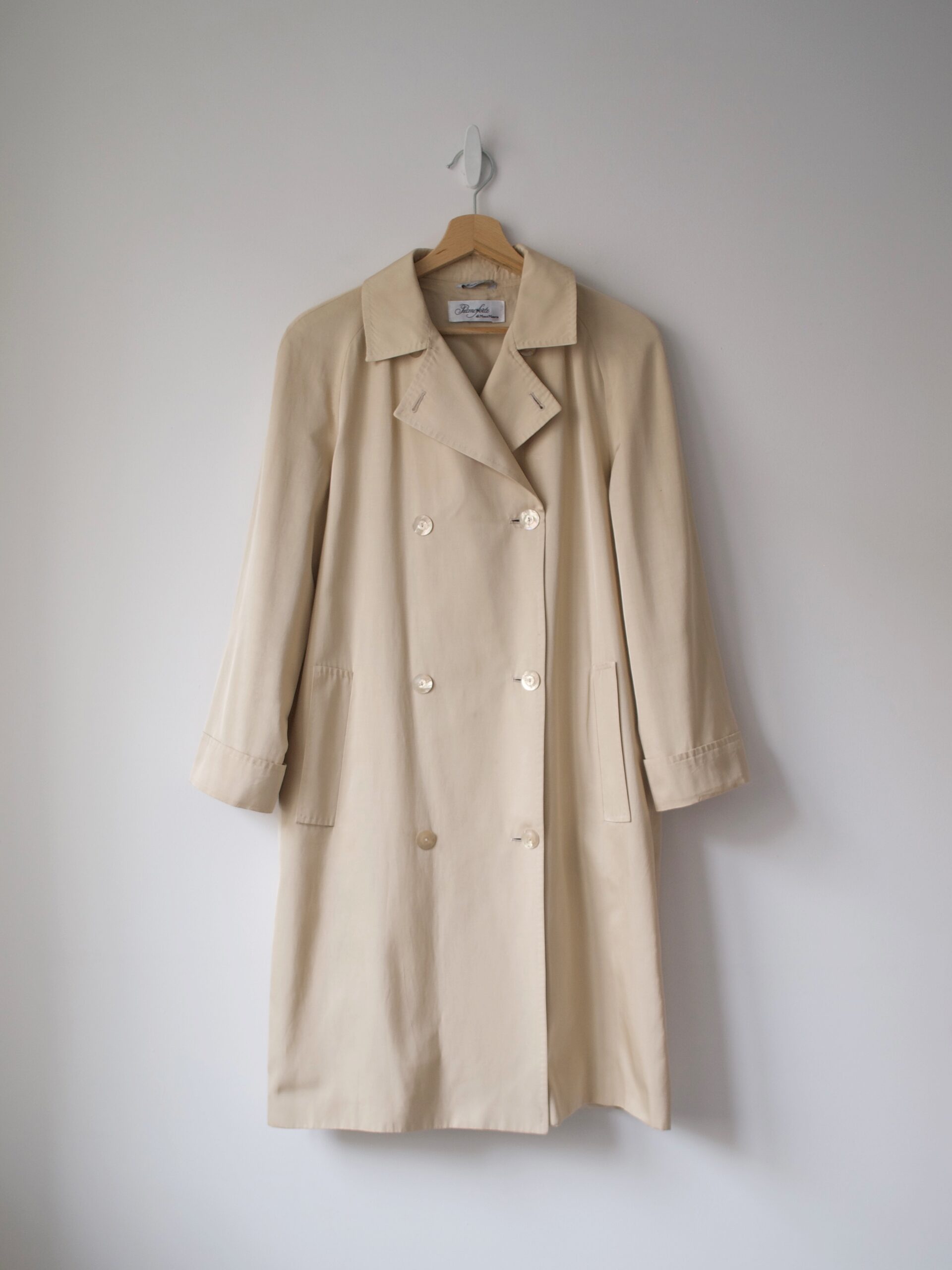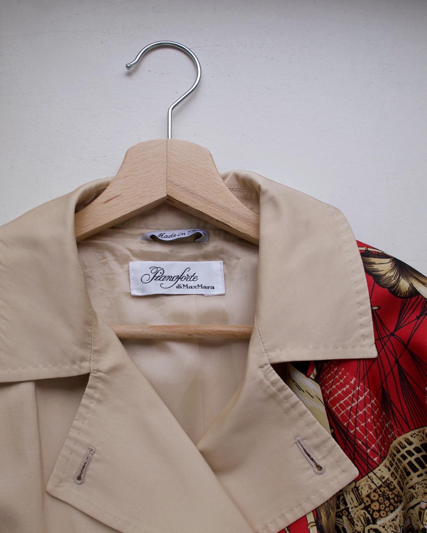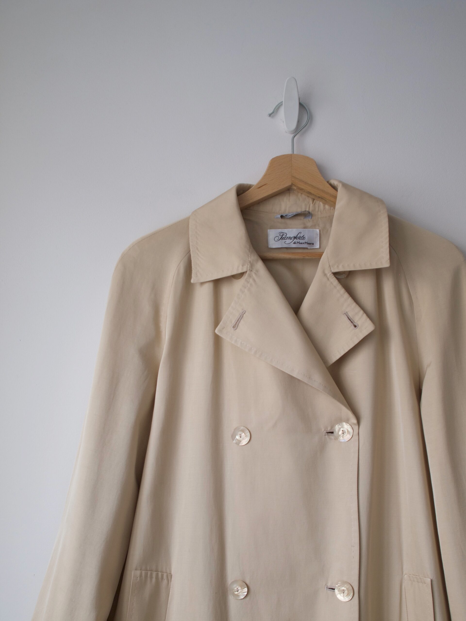 Płaszcz luksusowej marki Max Mara, wyprodukowany we Włoszech. Linia Pianoforte dla rynku japońskiego. Materiał w złocistym kolorze, o delikatnym połysku. Zapinany na guziki z naturalnej muszli. Luźny fason. Po czyszczeniu chemicznym.