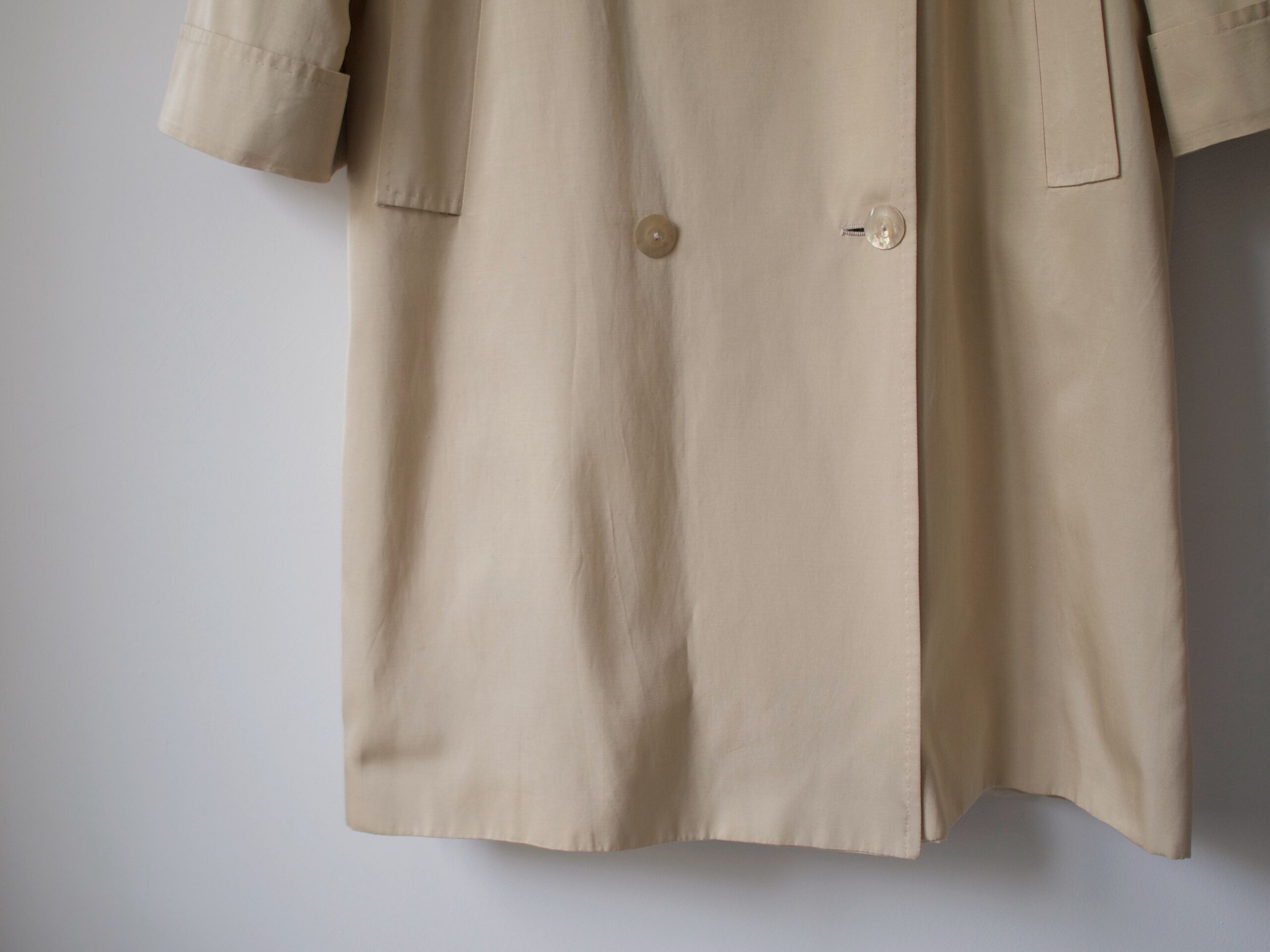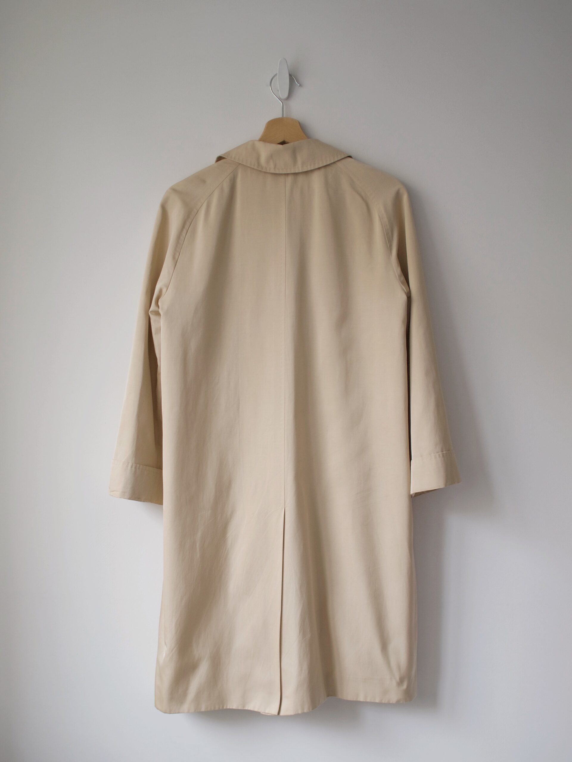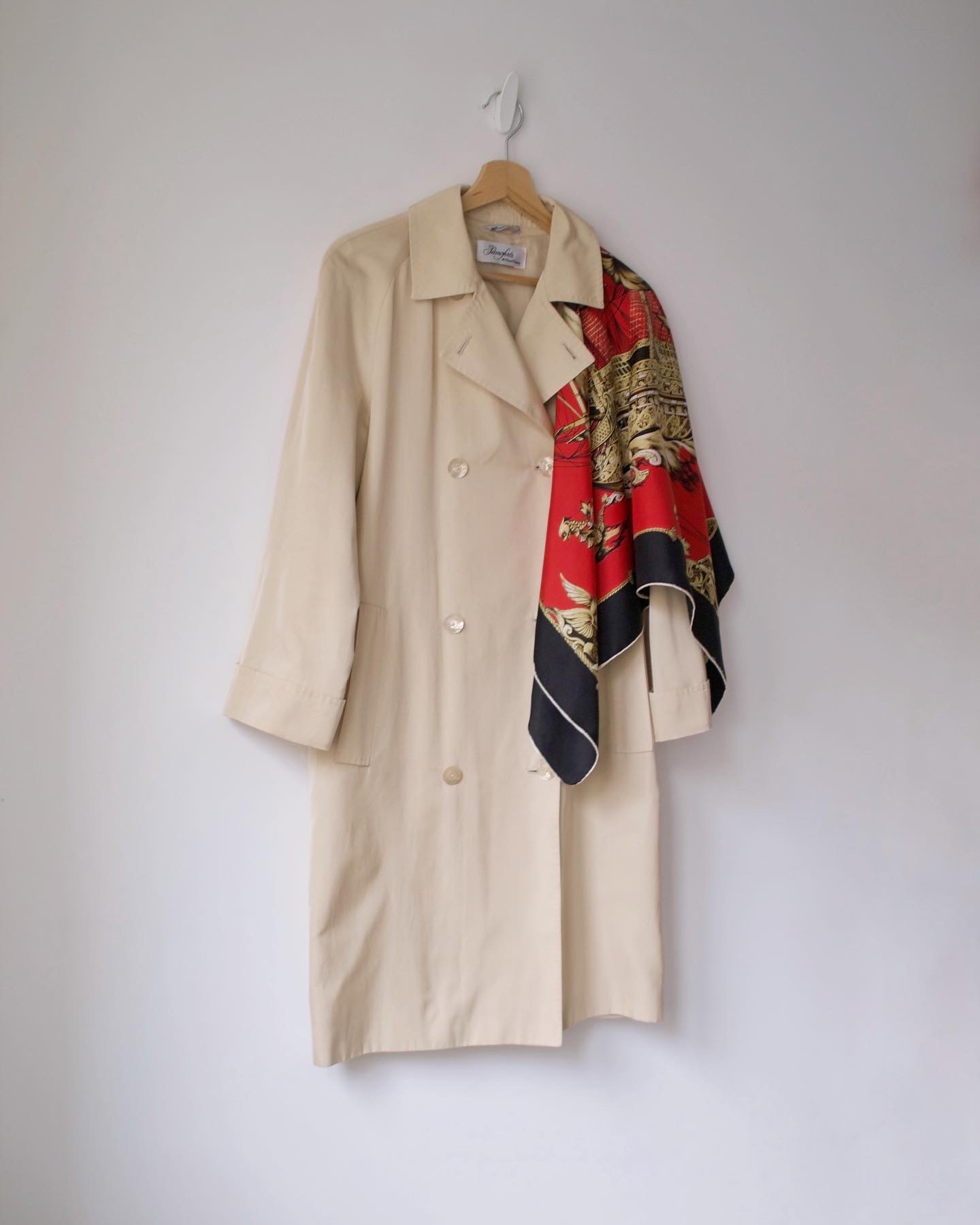 Płaszcz luksusowej marki Max Mara, wyprodukowany we Włoszech. Linia Pianoforte dla rynku japońskiego. Materiał w złocistym kolorze, o delikatnym połysku. Zapinany na guziki z naturalnej muszli. Luźny fason. Po czyszczeniu chemicznym.