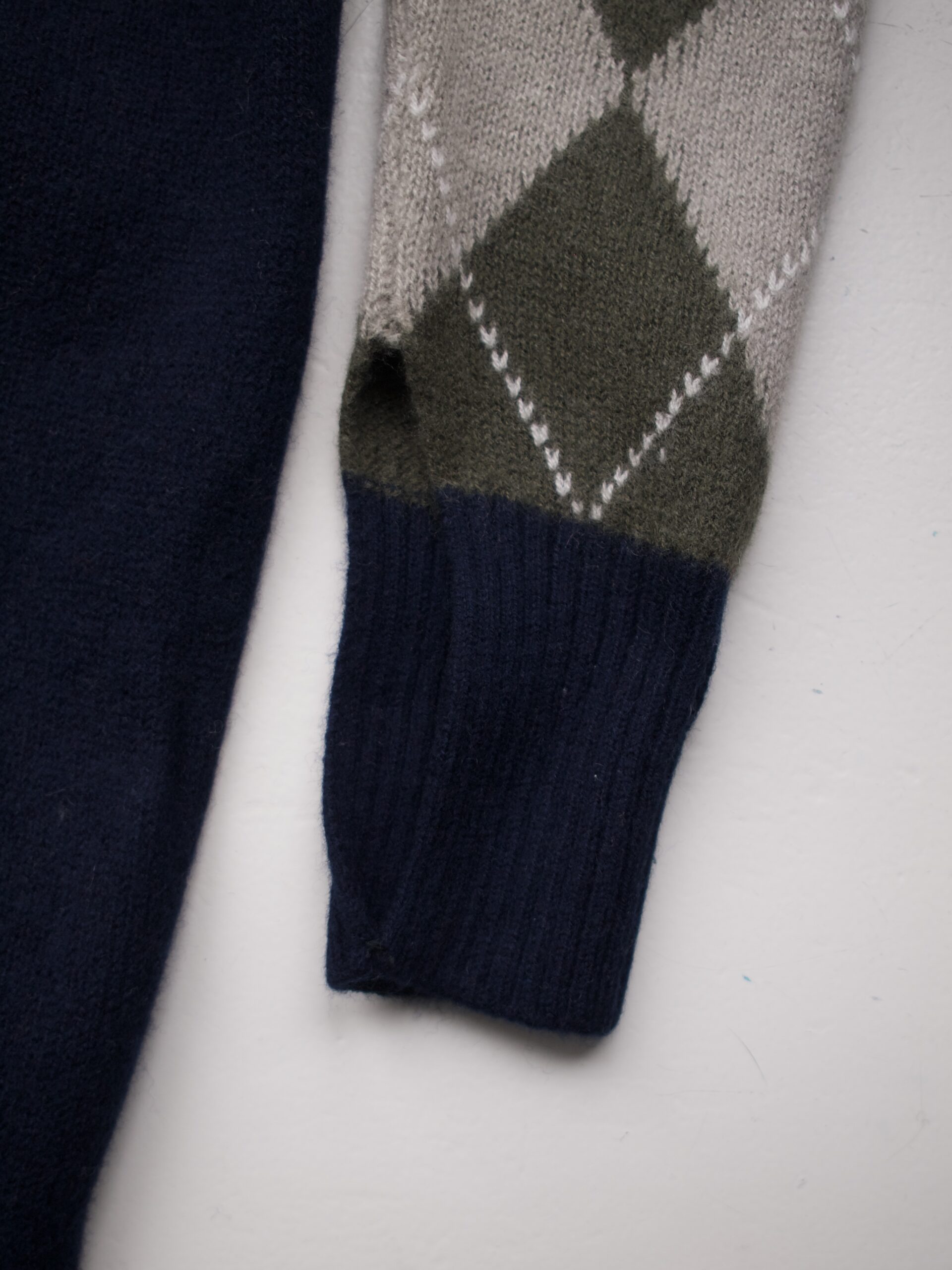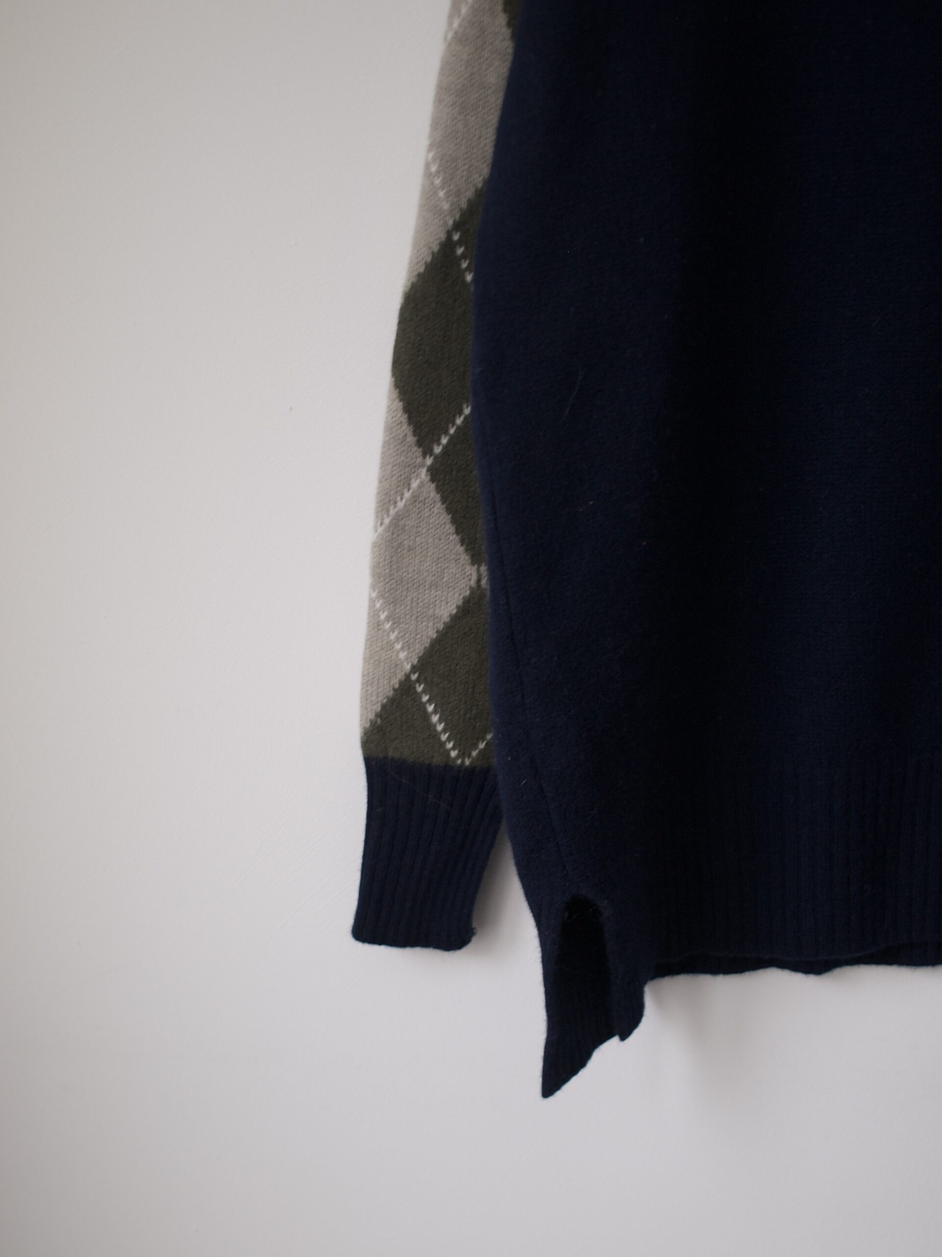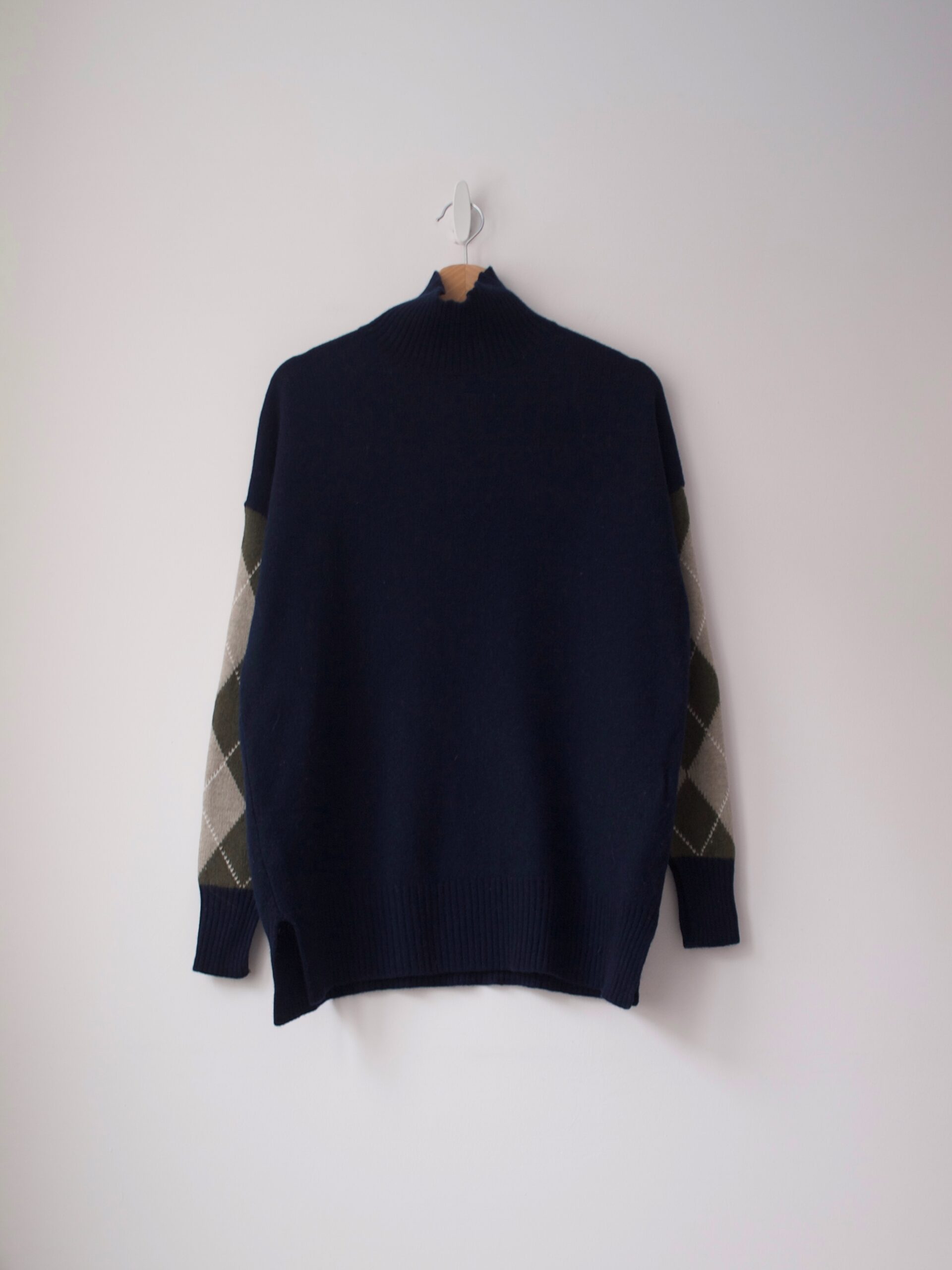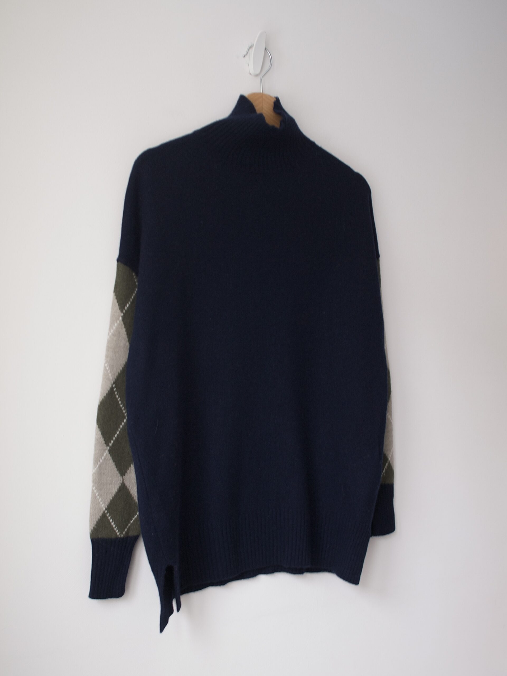 Sweter luksusowej marki Pringle of Scotland. Rękaw z rozcięciem na palec. Kolor ciemny granatowy.