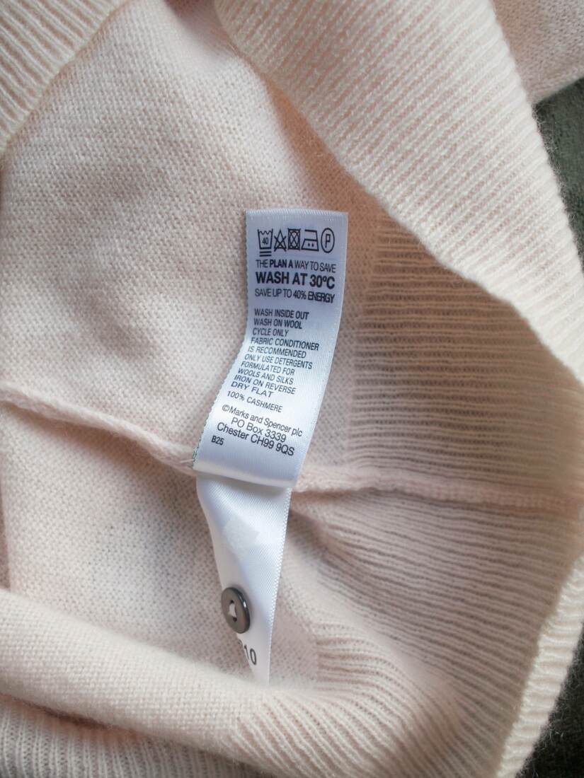 Klasyczny sweter M&S z dekoltem w serek. Skład to 100% kaszmir, bardzo dobry stan, jest minimalnie sfilcowany, nie jest to zauważalne, po prostu jest trochę sztywniejszy.
