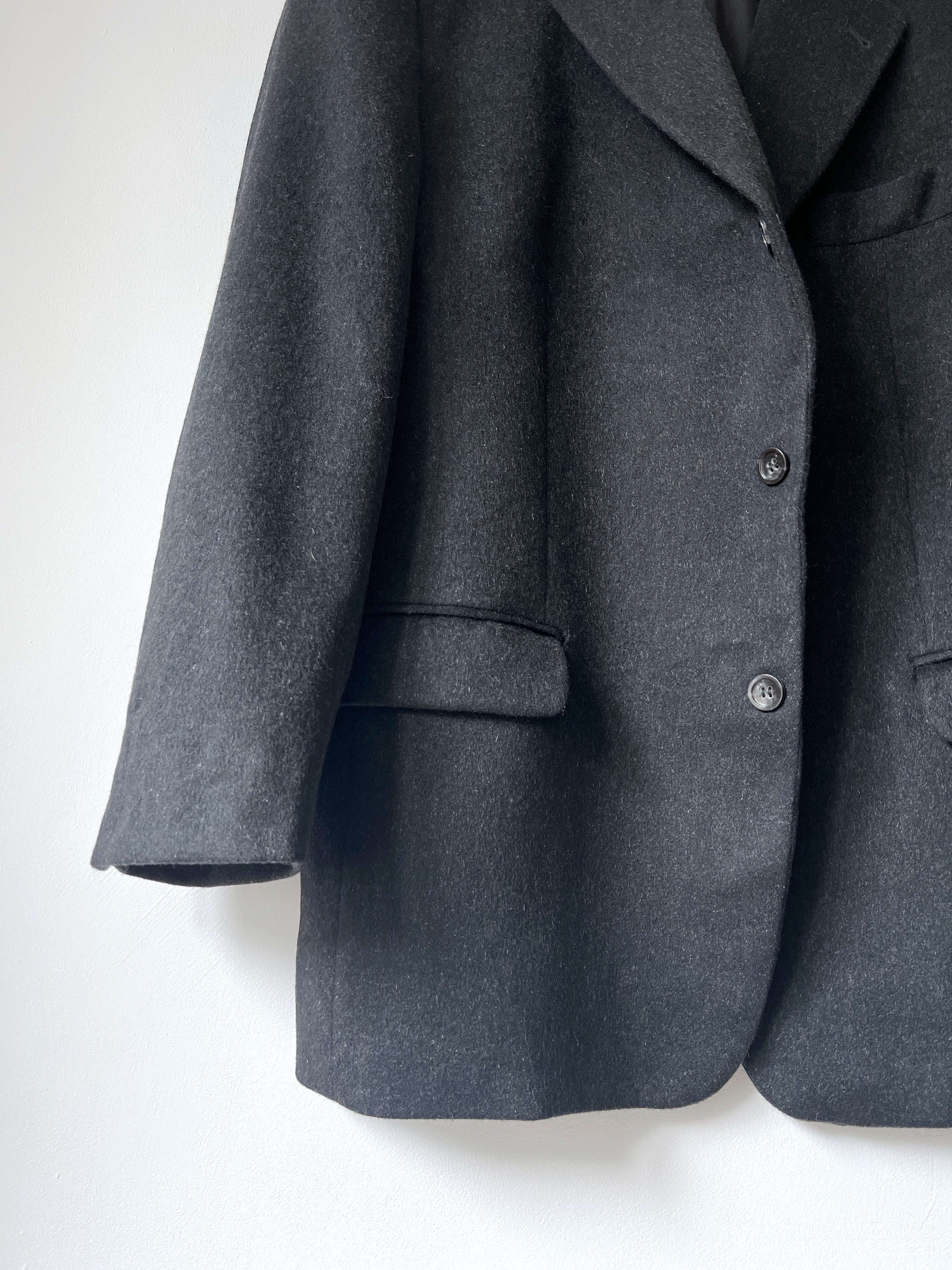 Minimalistyczny kaszmirowy sweter o pudełkowym kroju. Sweter bardzo miękki i przyjemny, ma dwie małe zacerowane dziurki, nie widoczne w noszeniu, poza tym brak mankamentów. Wymiary poniżej.