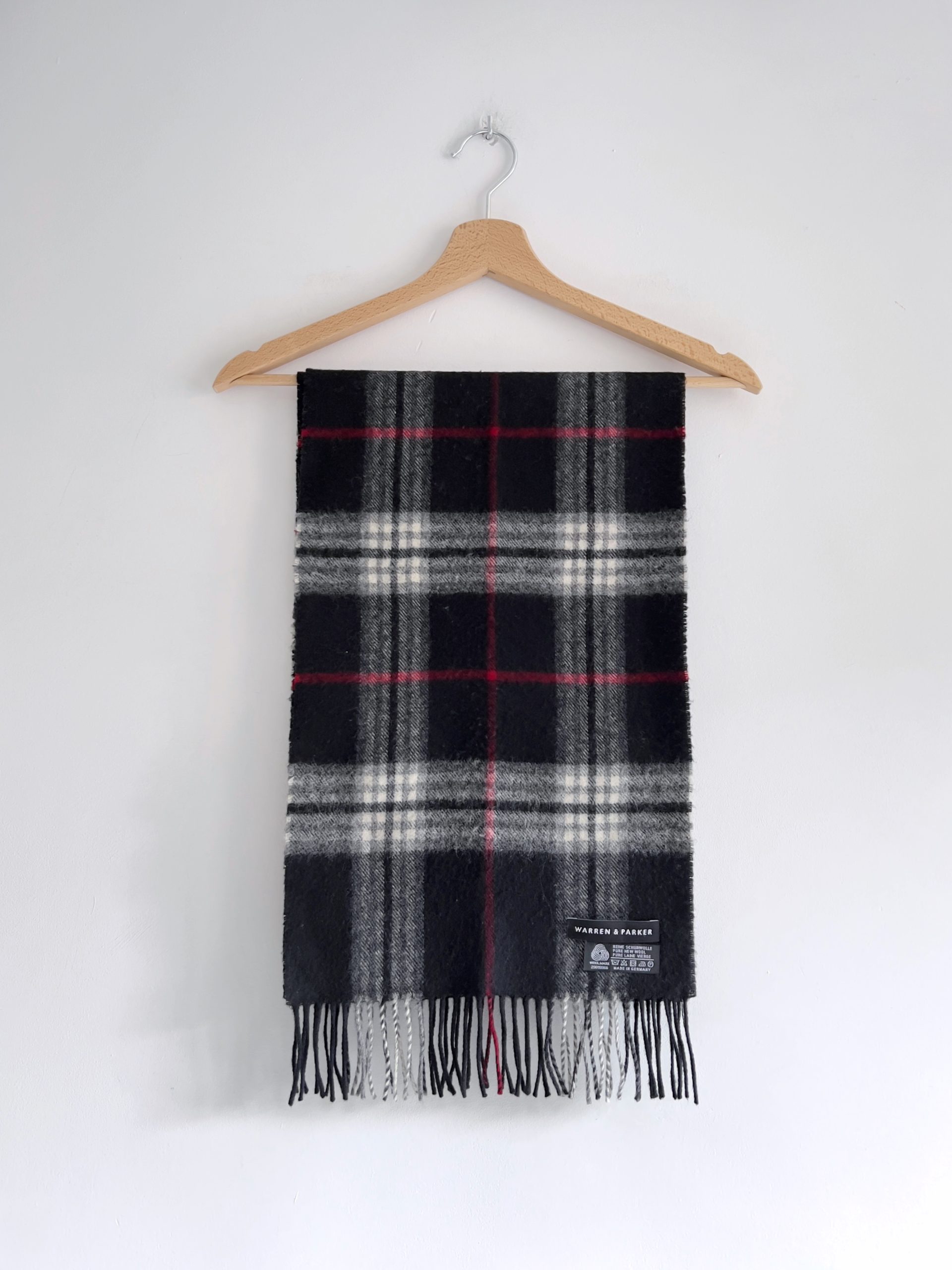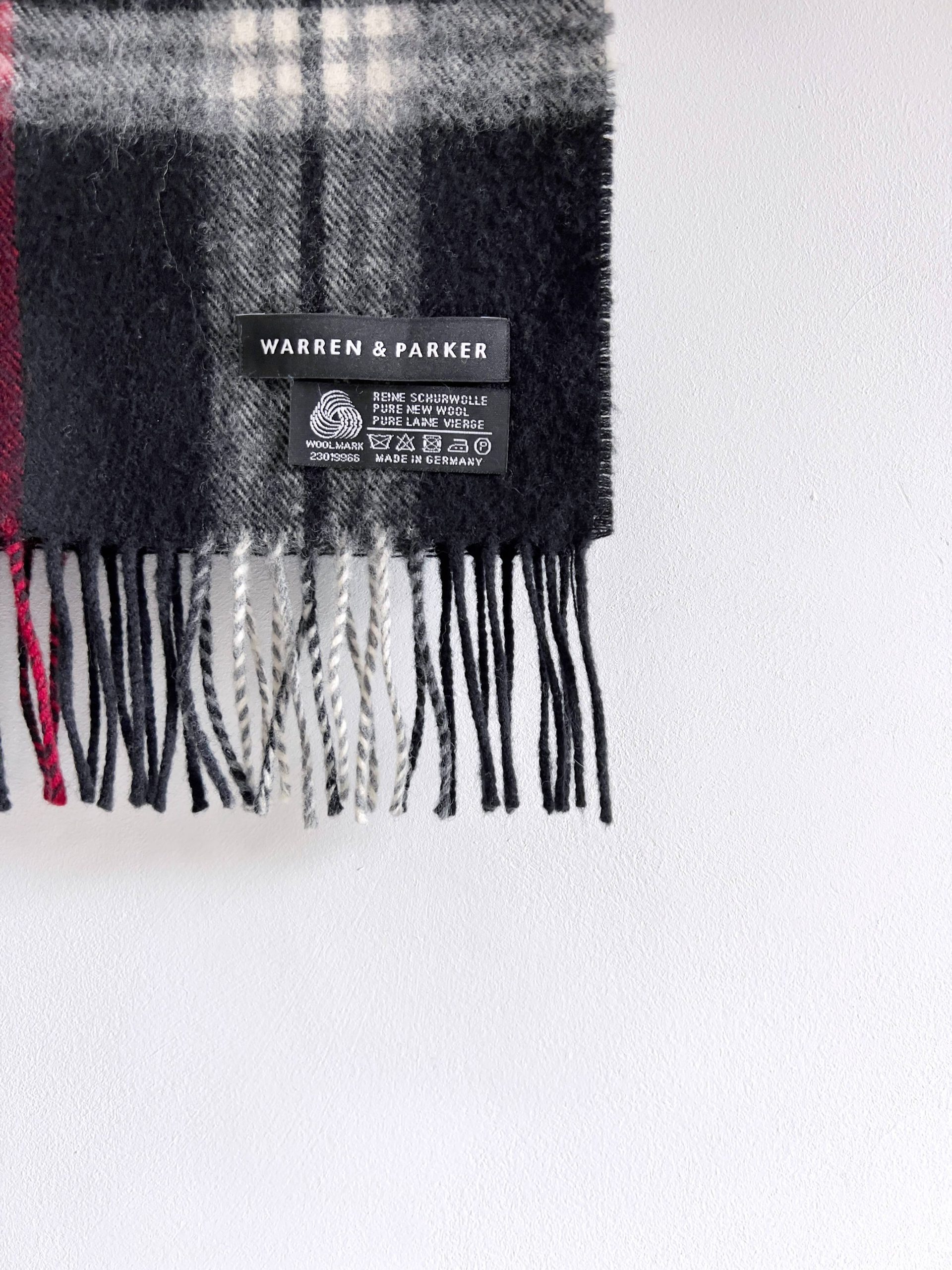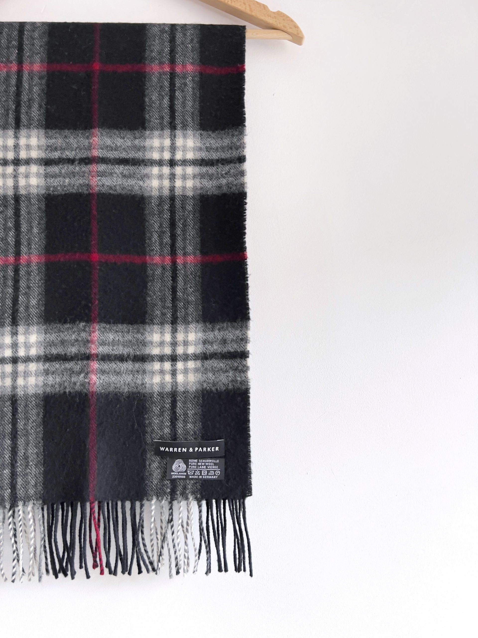 Szalik vintage w kratę. Wyprodukowany w Niemczech, 100% wełna dziewicza. Bardzo dobry stan. Wymiary bez frędzli: 160*30 cm