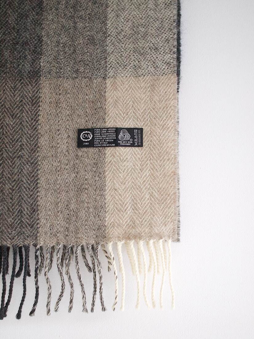 Klasyczny wełniany szalik w kratę z frędzlami. Bez wad. Wymiary bez frędzli 153*25 cm, frędzli ok 7 cm.