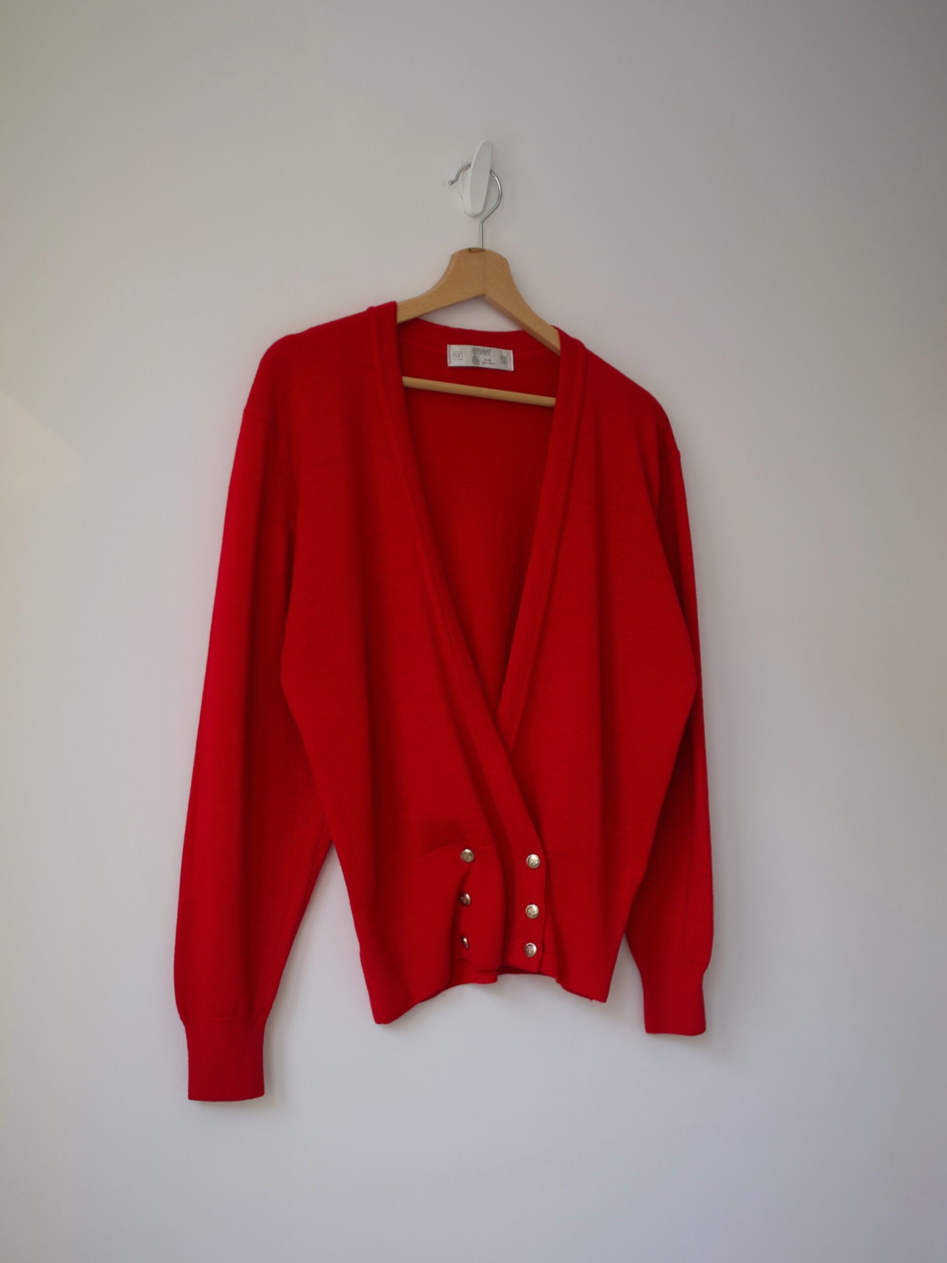 Minimalistyczny kardigan o luźnym kroju. Kardigan nie ma żadnych metek, przypuszczam, że był szyty ręcznie, lub na zamówienie. Materiał przyjemny w dotyku, nie gryzie. Wymiary poniżej.