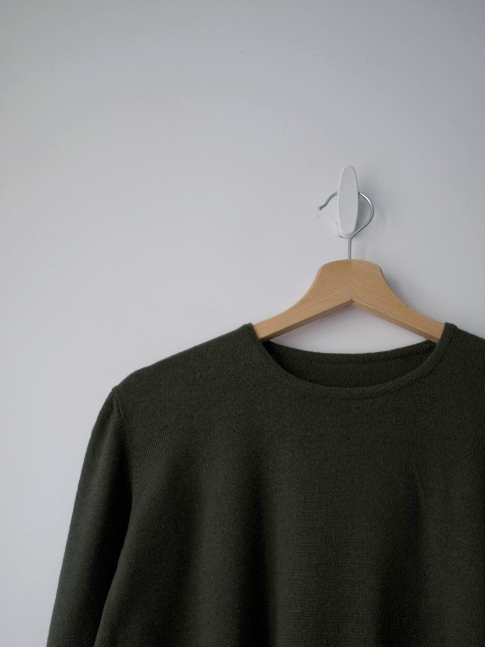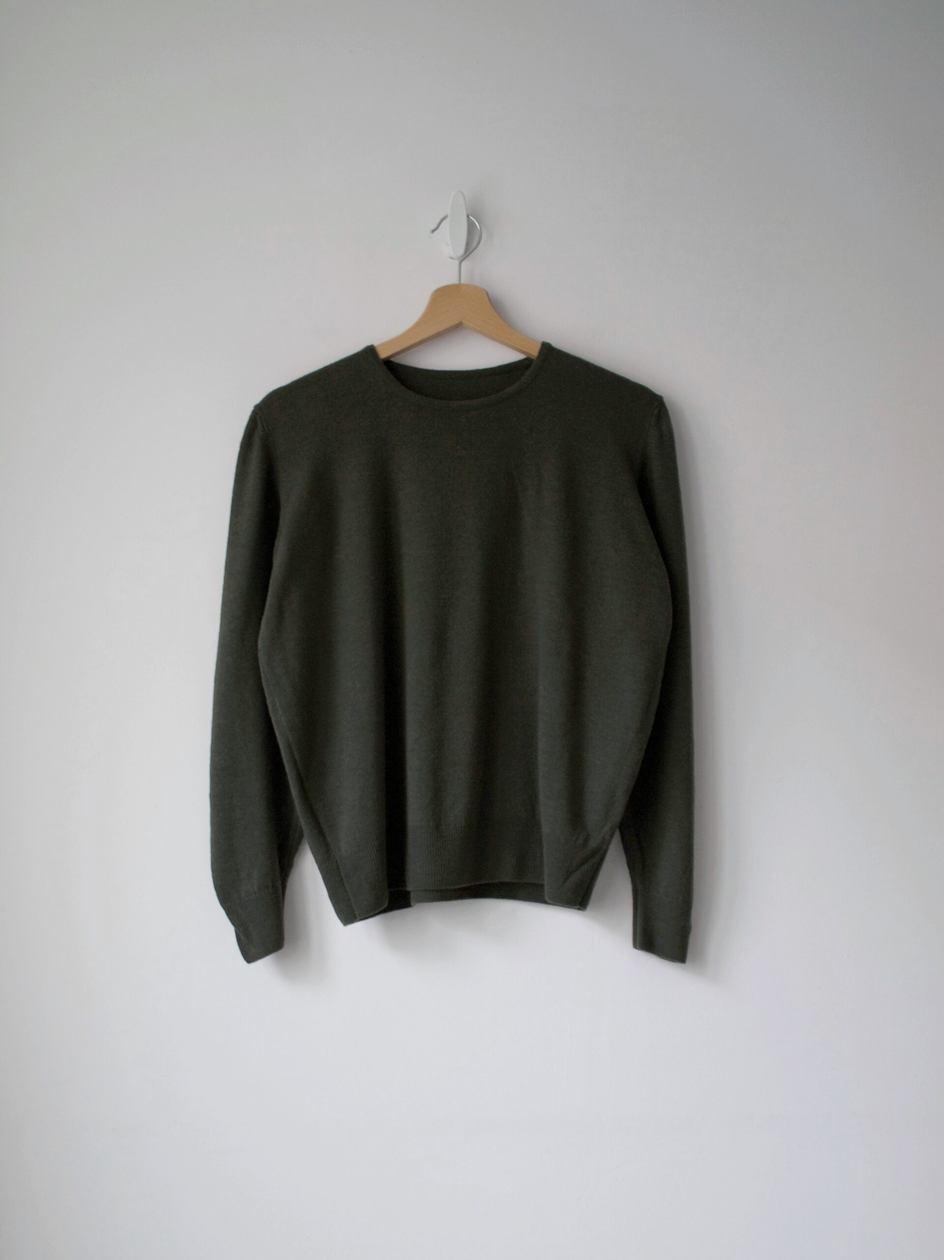 Sweter w kolorze khaki, w 100% wykonany z gładkiej niegryzącej wełny.
