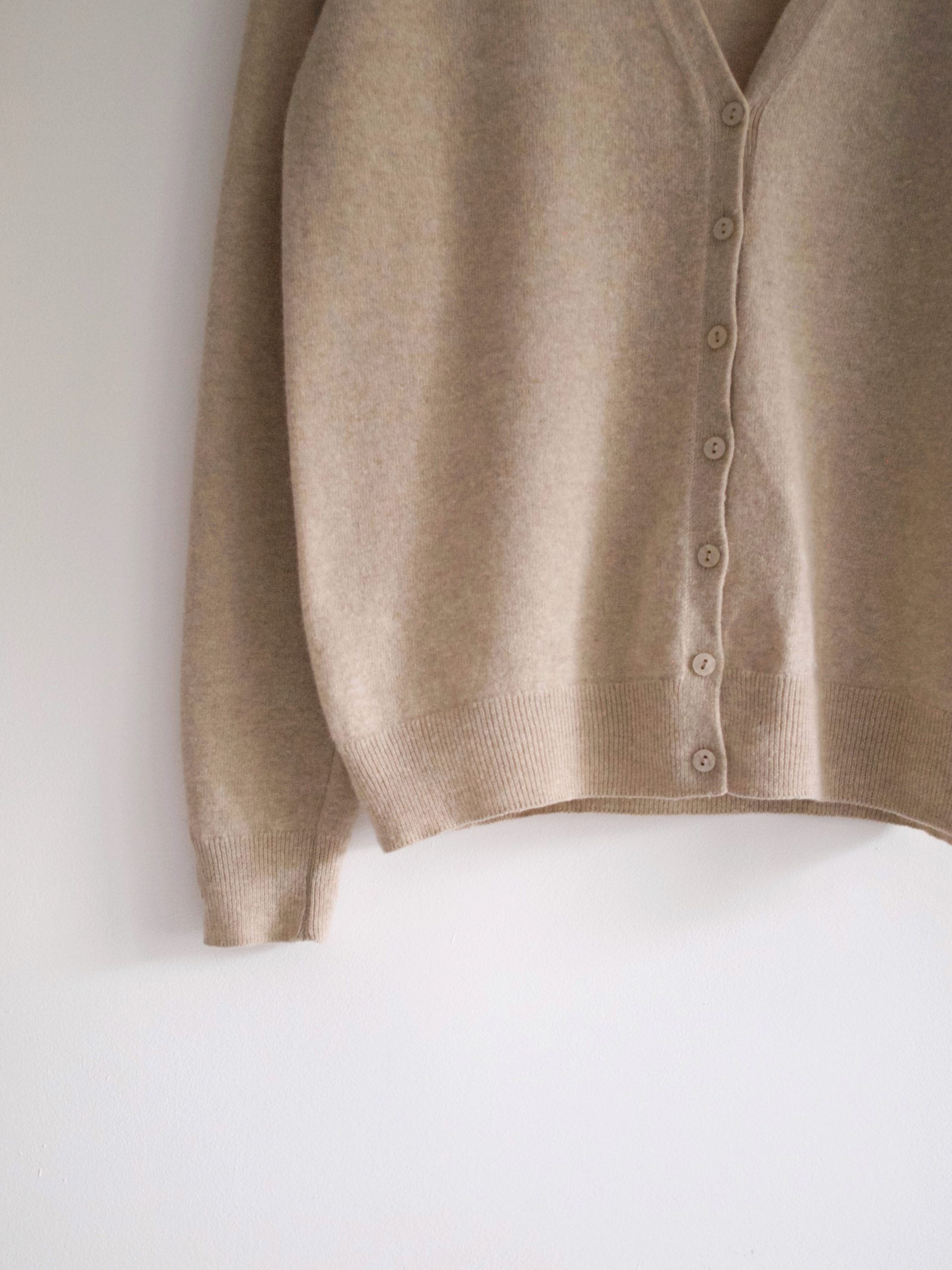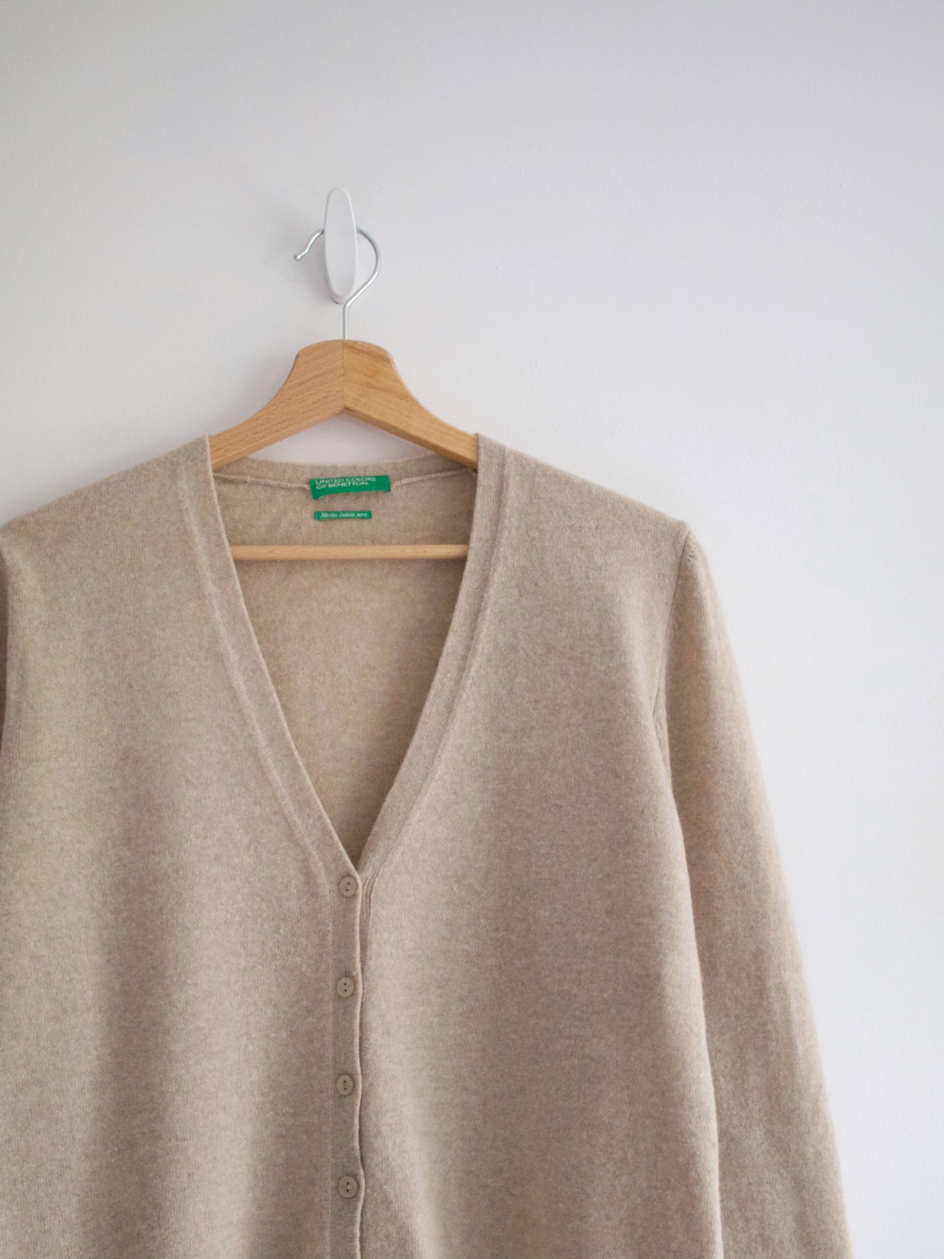 Beżowy kardigan marki Benetton, w 100% wykonany z wełny merino. Rozmiar z metki: M Skład: 100% wełna Stan: bardzo dobry Szerokość w klatce 48 cm Długośćcałkowita 59 cm