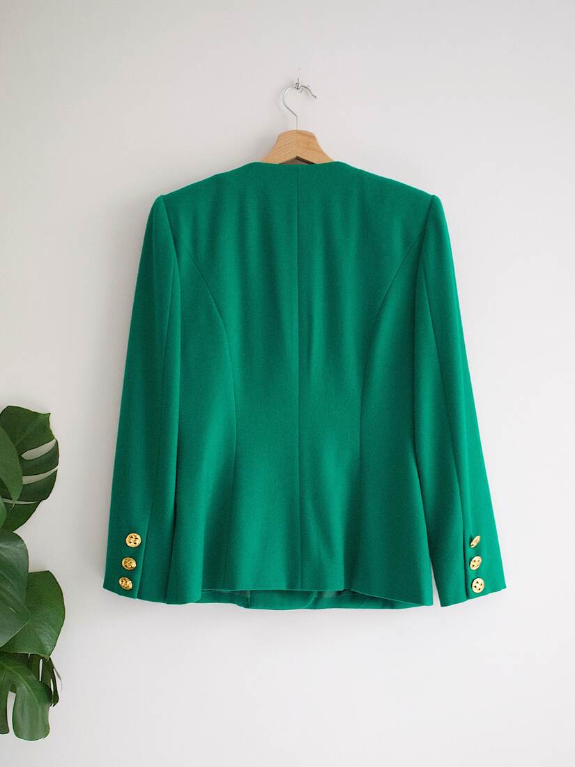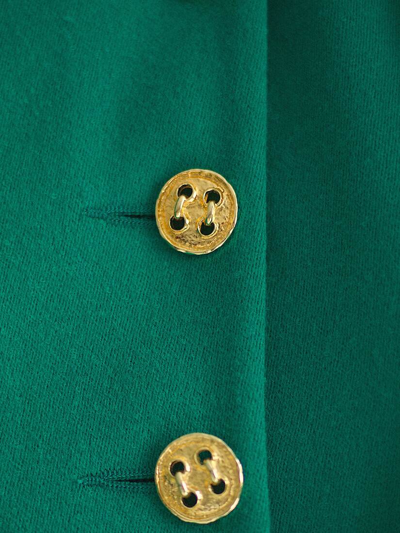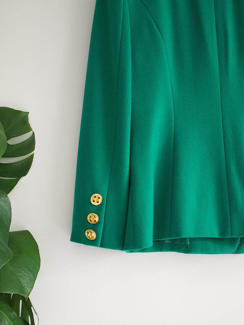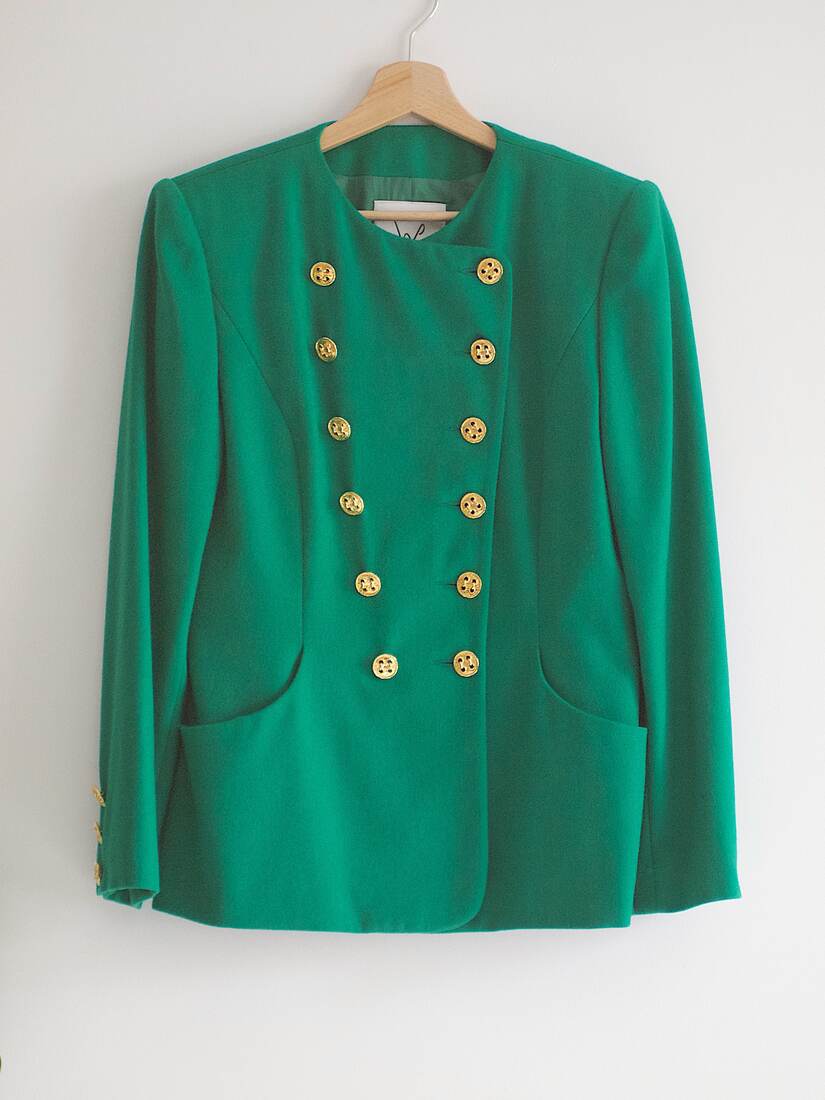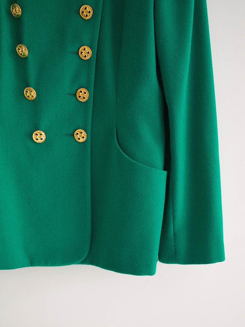 Unikatowa marynarka vintage wyprodukowana we Francji. Prosty fason, ozdobiona metalowymi guzikami. Materiał wierzchni 100% czysta, żywa wełna, podszewka acetat. Rozmiar z metki M, dla luźniejszego dopasowania polecam na XS-S . Bez wad, po czyszczeniu.