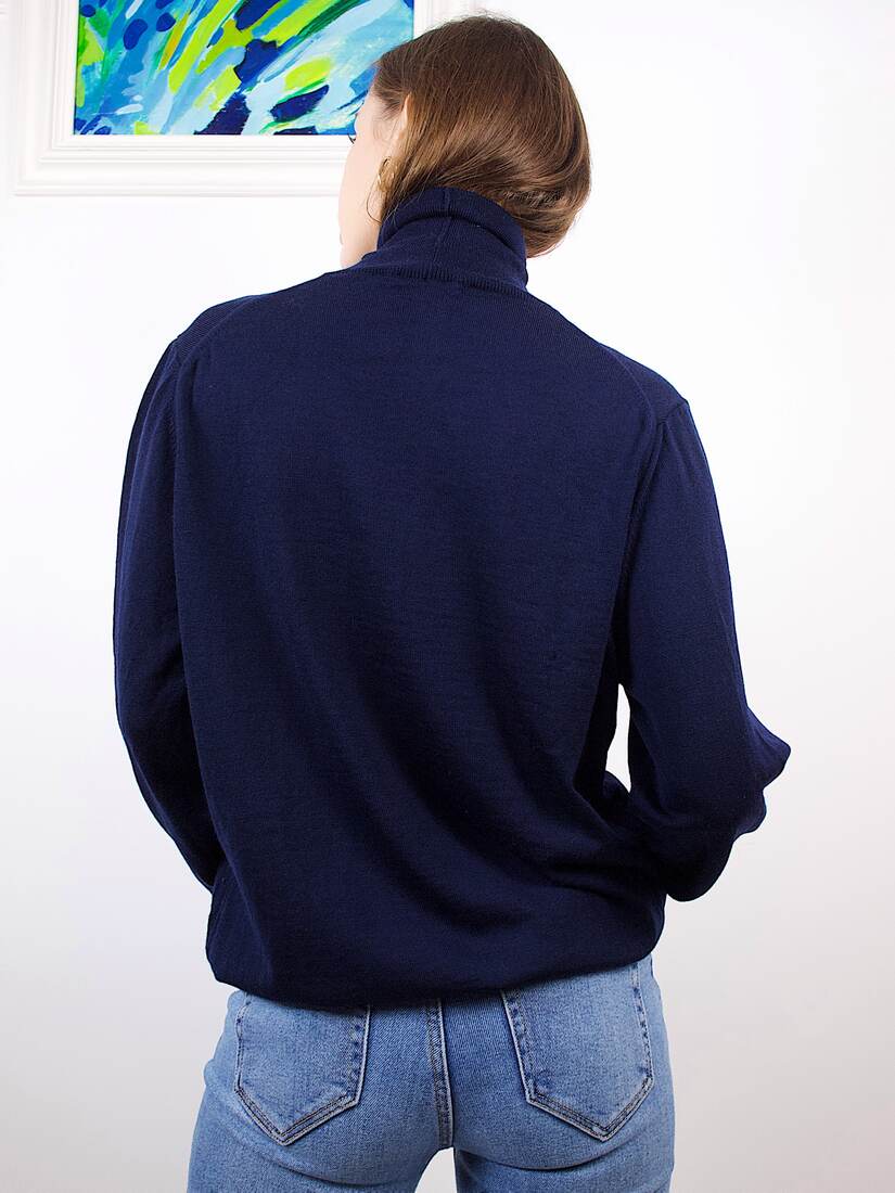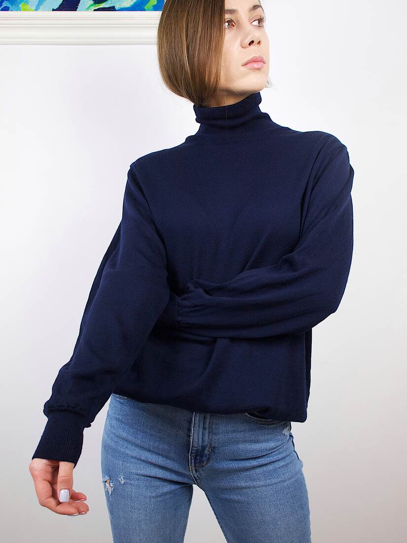 Wełniany golf vintage w granatowym kolorze. Polecam na L, modelka ma 165 cm wzrostu i nosi rozmiar XS-S. Bez wad.