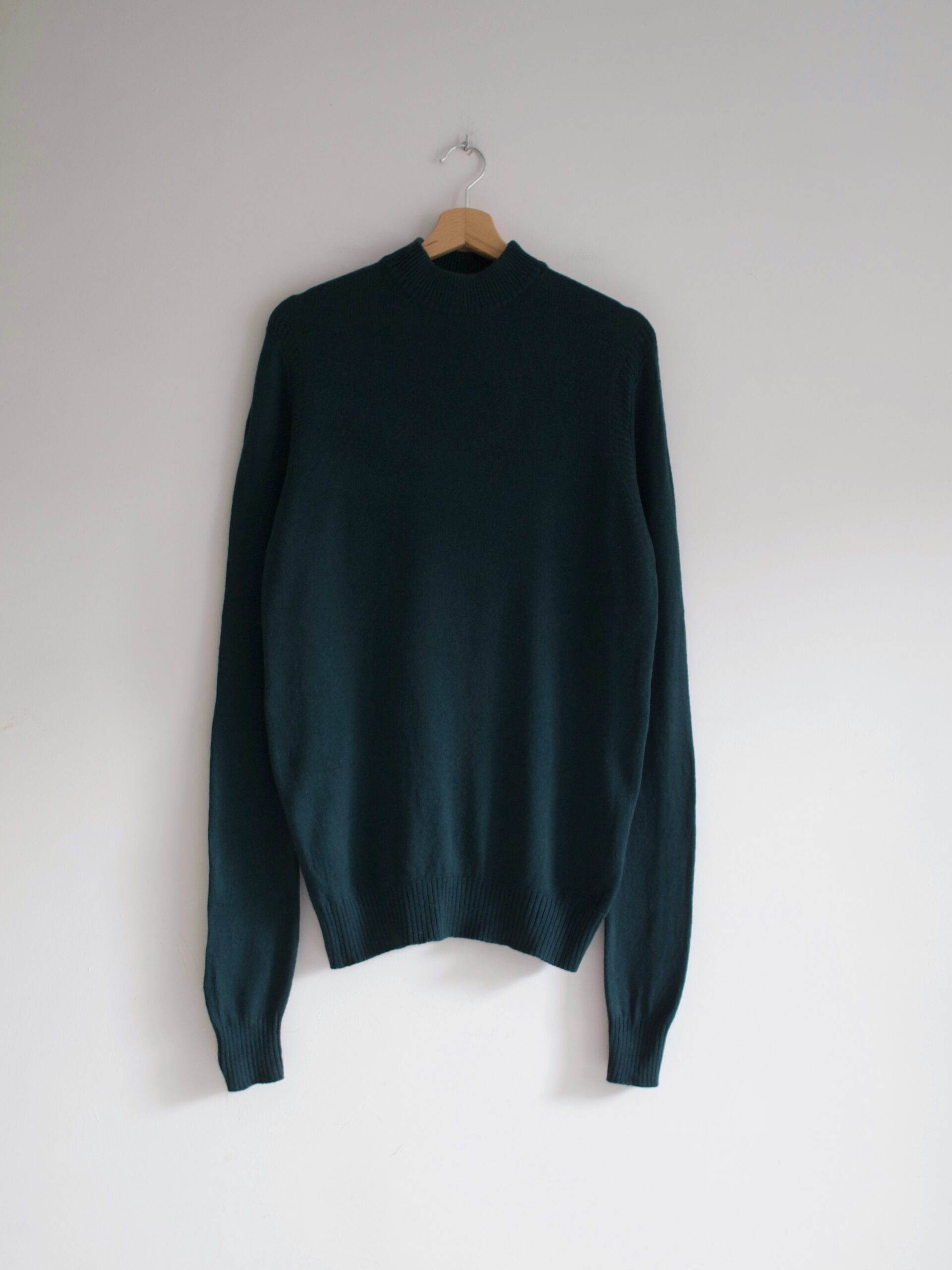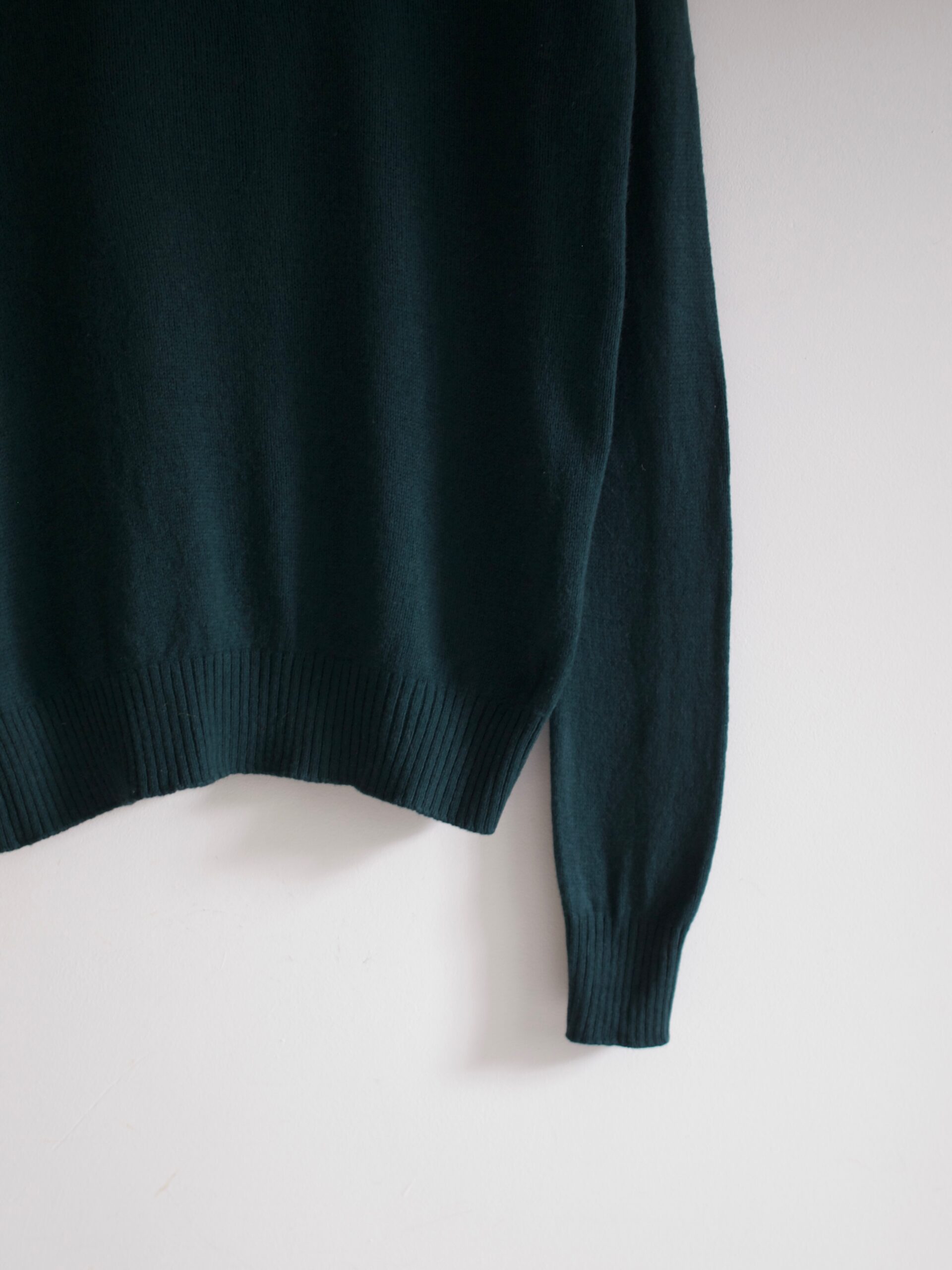 Sweter w 100% wykonany z wełny z jaka. Wełna z jaka w dotyku przypomina kaszmir, jest niegryząca i przyjemna do ciała. Kolor ciemnozielony.