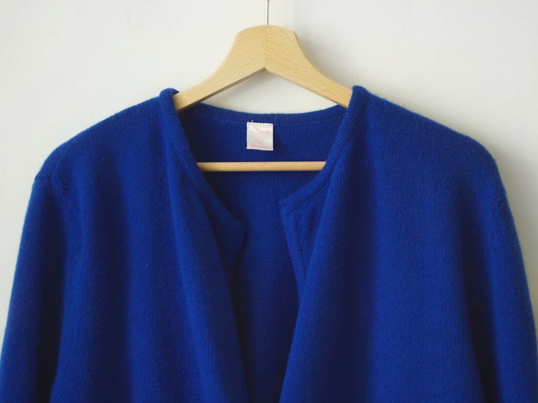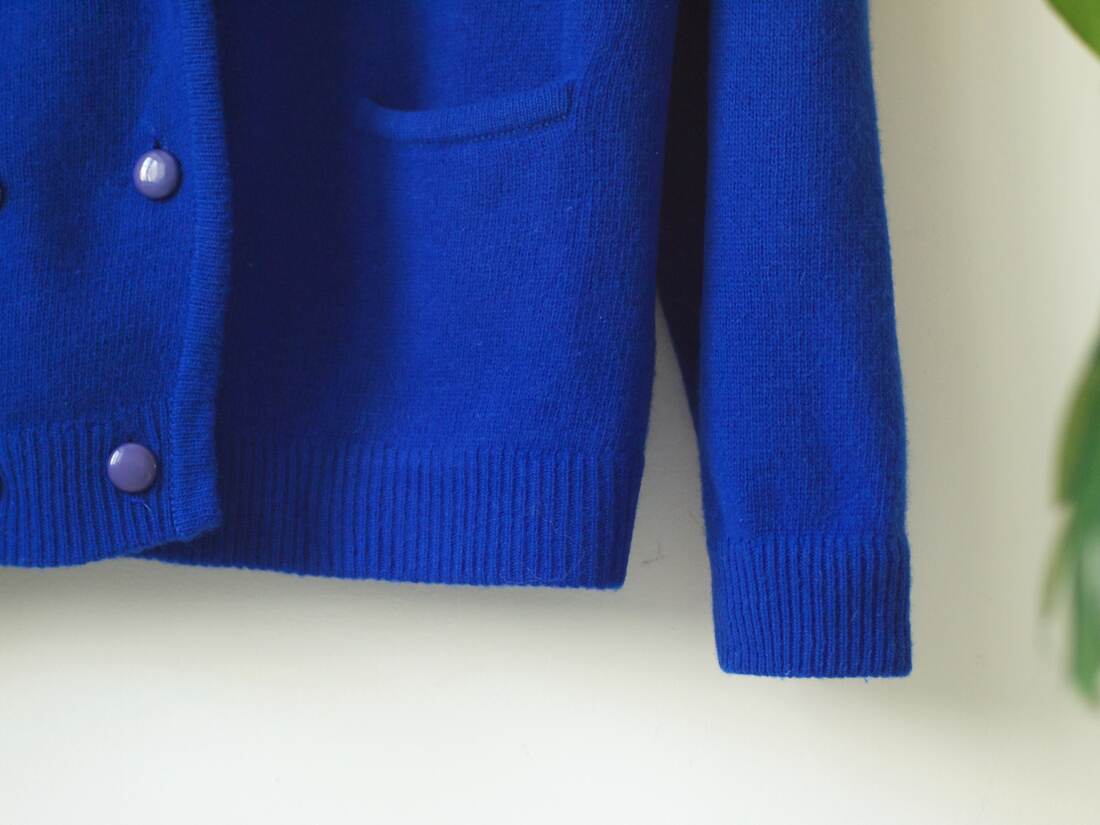 Wełniany kardigan vintage w pięknym szafirowym kolorze. Dwurżędowe zapięcie, dwie kieszenie, obniżona linia ramion. Rozmiar z metki M, wymiary poniżej. Bez wad.