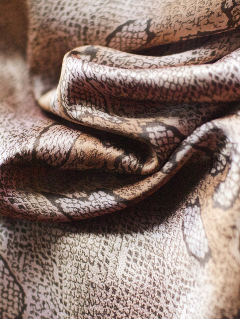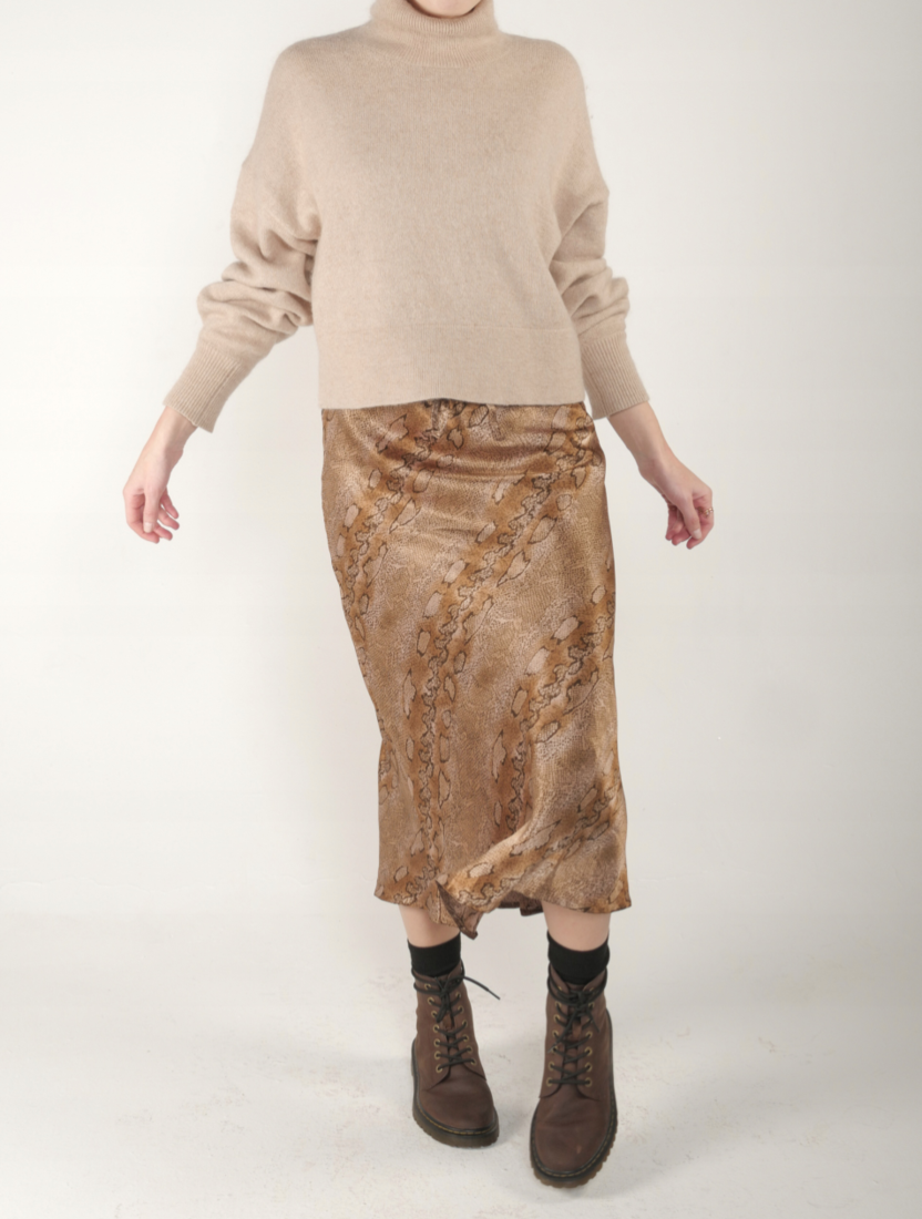 Spódnica midi w kształcie litery A, uszyta z przyjemnej w dotyku tkaniny o satynowym połysku. W pasie jest gumka, więc rozmiar dość uniwersalny, wymiary poniżej. Idealny stan.