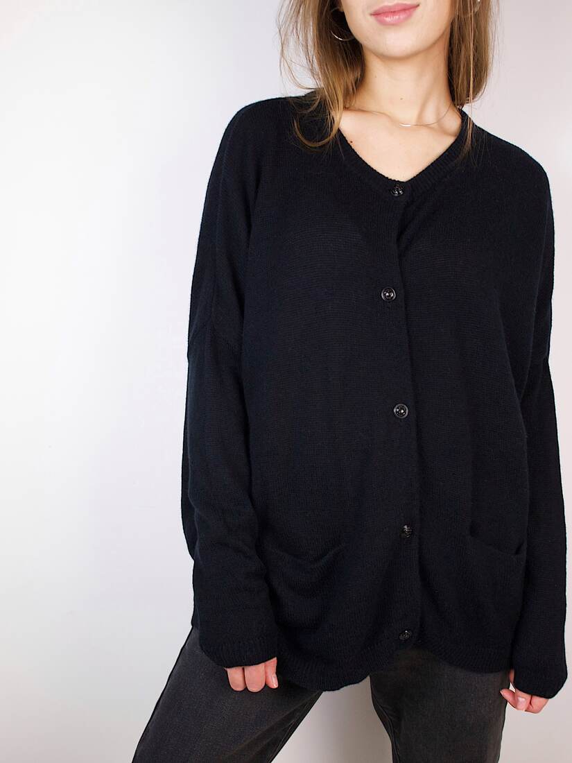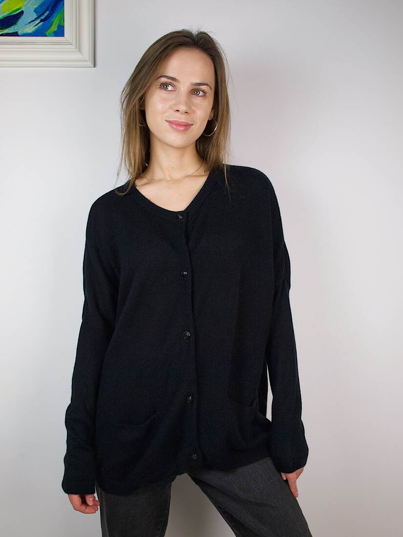 Wełniany kardigan zapinany na ozdobne guziki. Rozmiar z metki S/M, jest dość oversizowy, więc będzie pasować również na L. Bez wad.