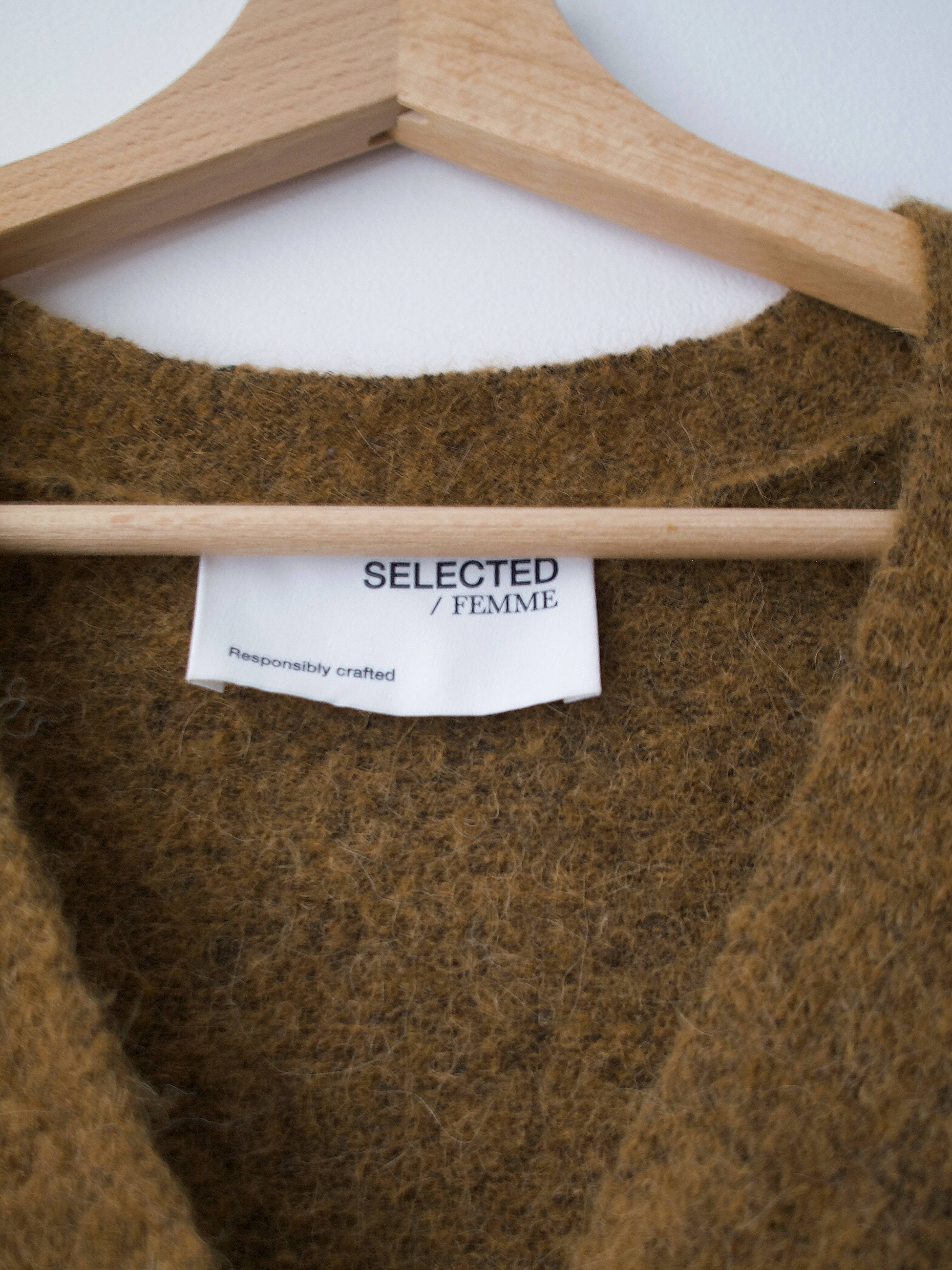 Puszysty kardigan skandynawskiej marki Selected. Zapinany na guziki powlekane tkaniną.
