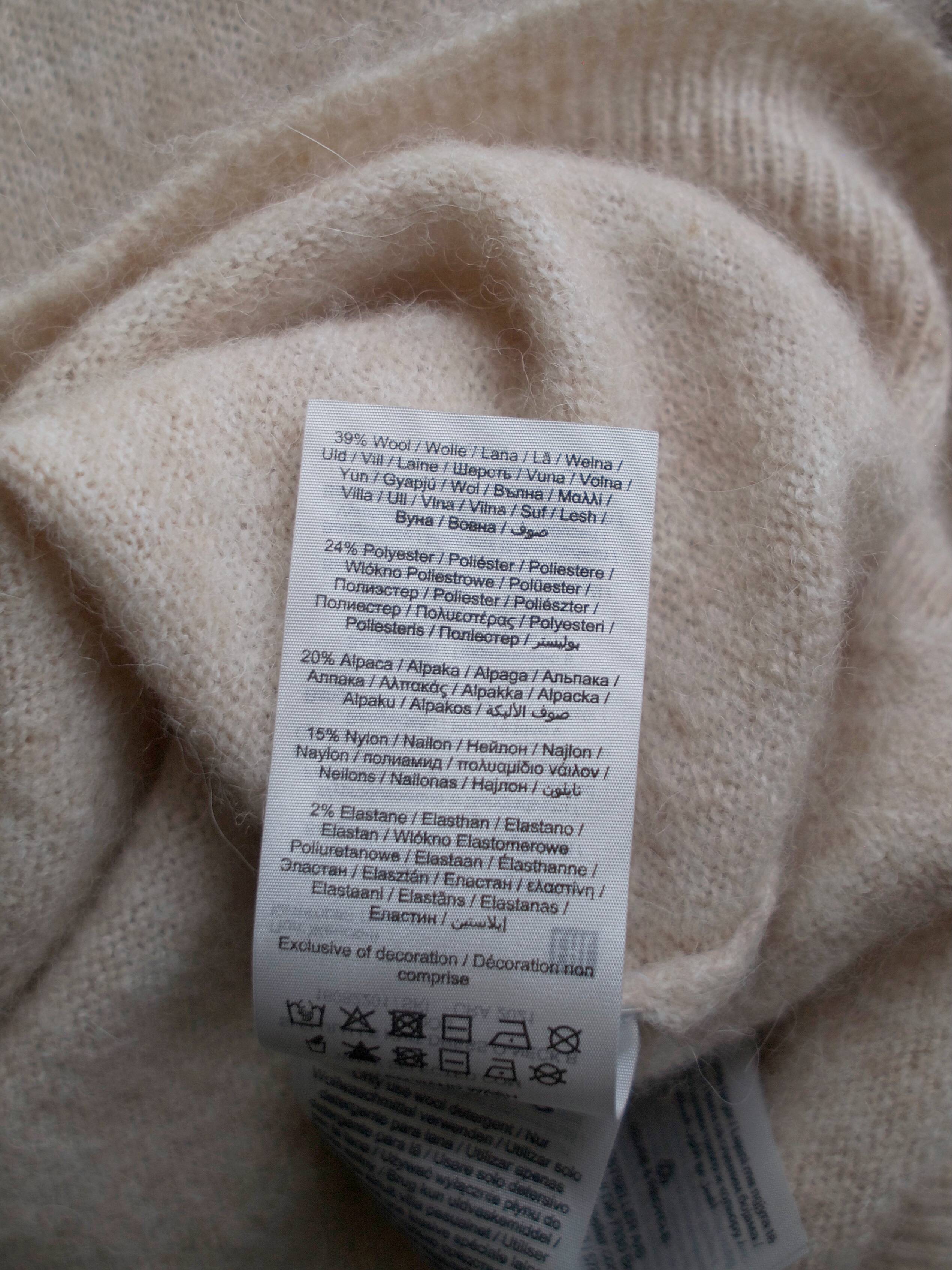 Skład: 39% wełna, 20% alpaka, 24% poliester, 15% nylon, 2% elastan
