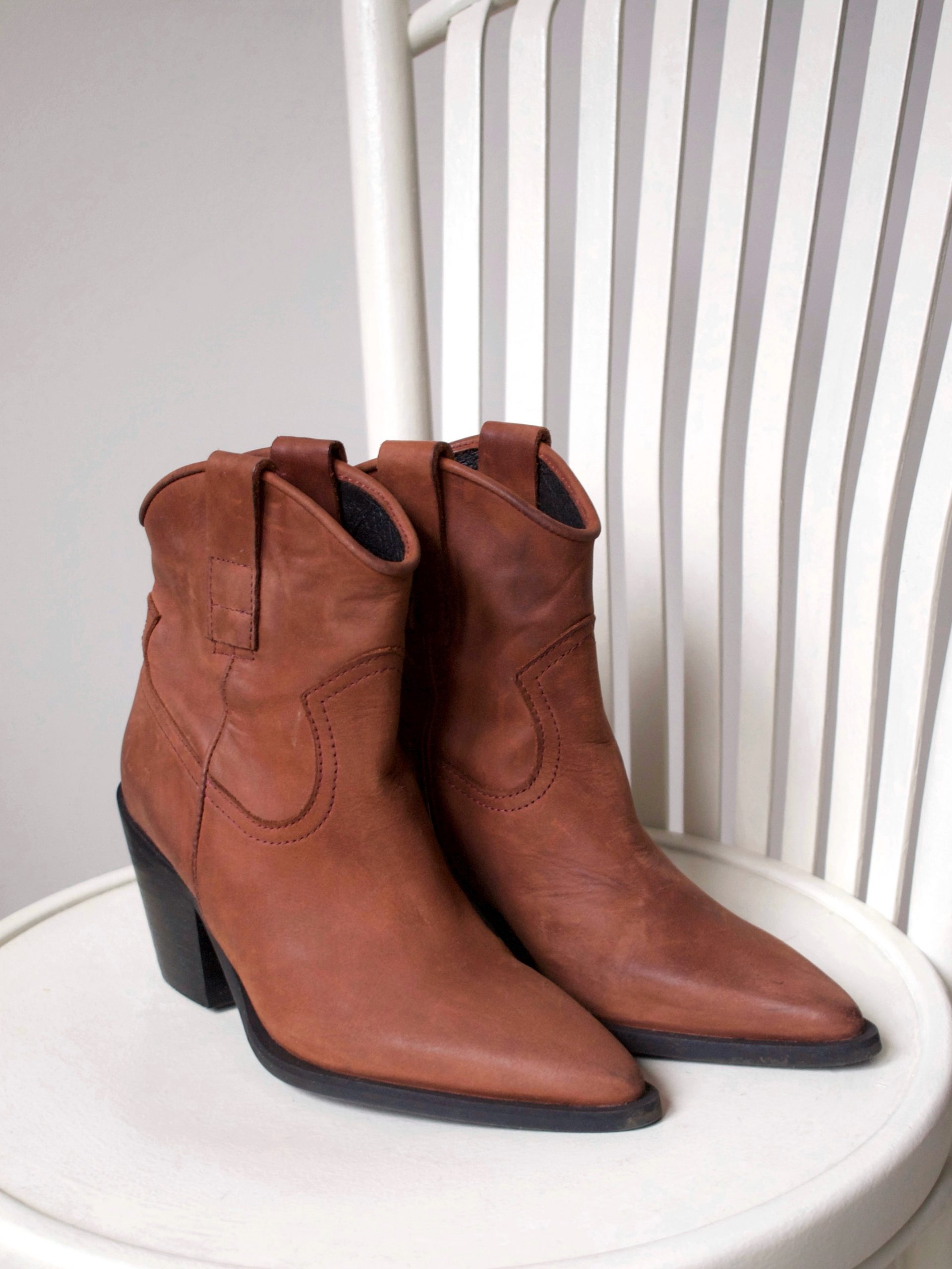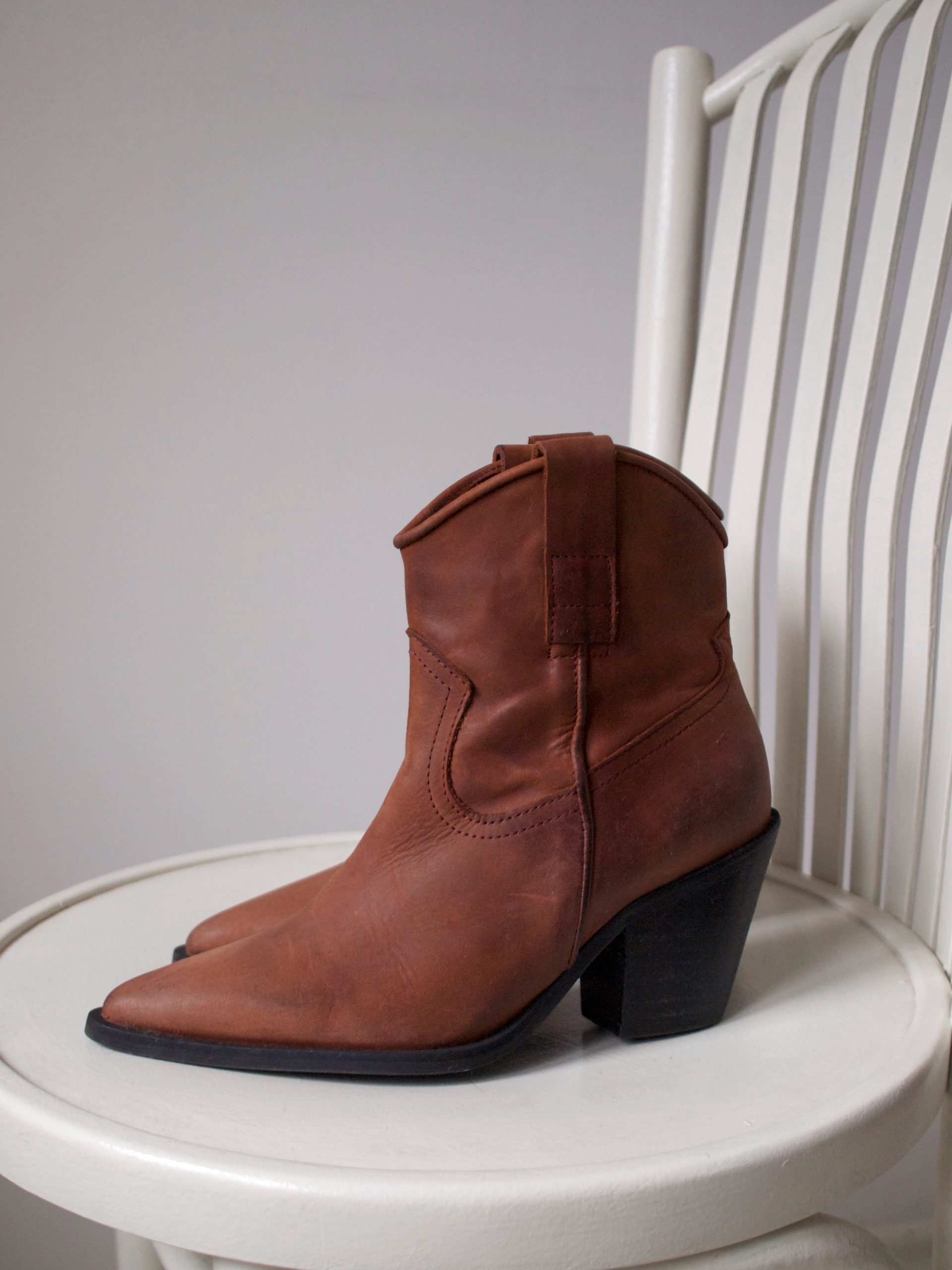 Krótkie kozaki duńskiej marki Shoe Biz Copenhagen, model Mona. Cena katalogowa: 1 499 DKK (ponad 800 zł). Wykonane z gładkiej skóry naturalnej (nubuk). Rozmiar 37, stan bardzo dobry