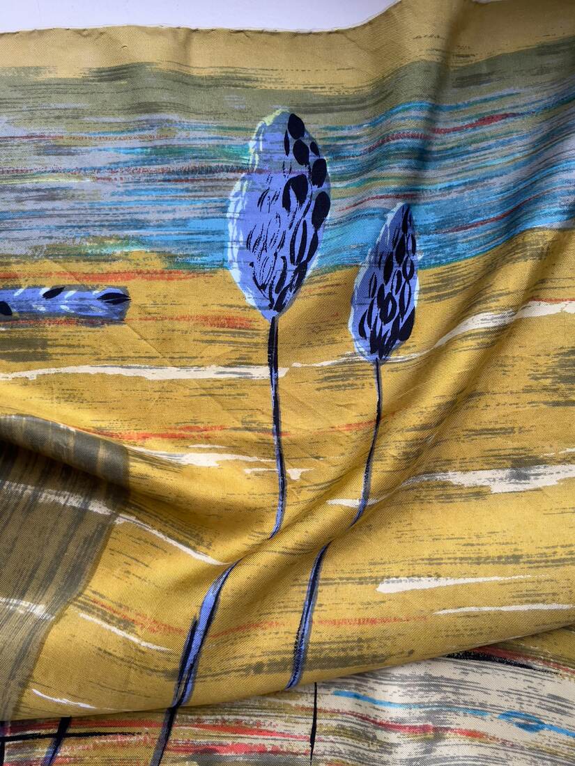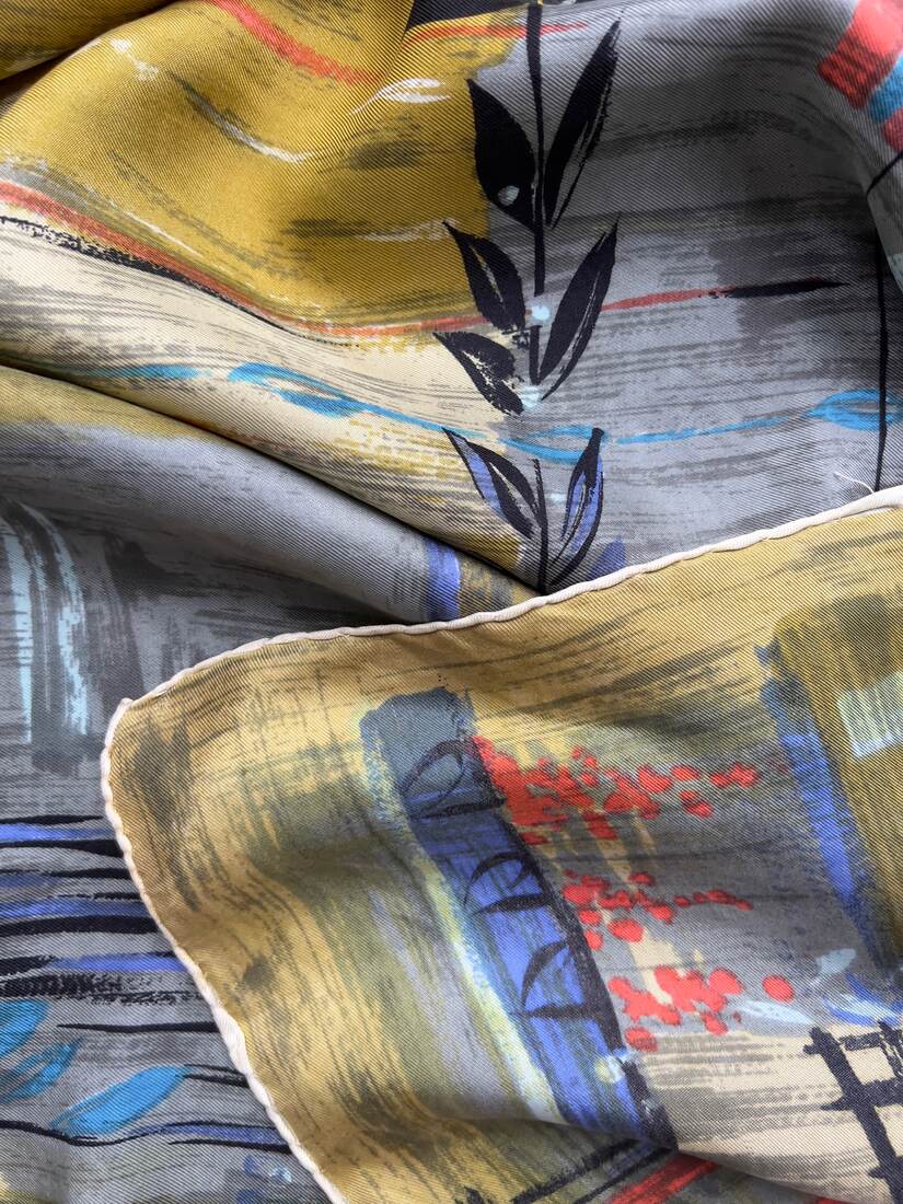 Unikatowa apaszka vintage od projektanta JIM THOMPSON wykonana w 100% z gęstego jedwabiu (thai silk), ręcznie rolowana , logowana. Absolutnie idealny stan, jak nowa.