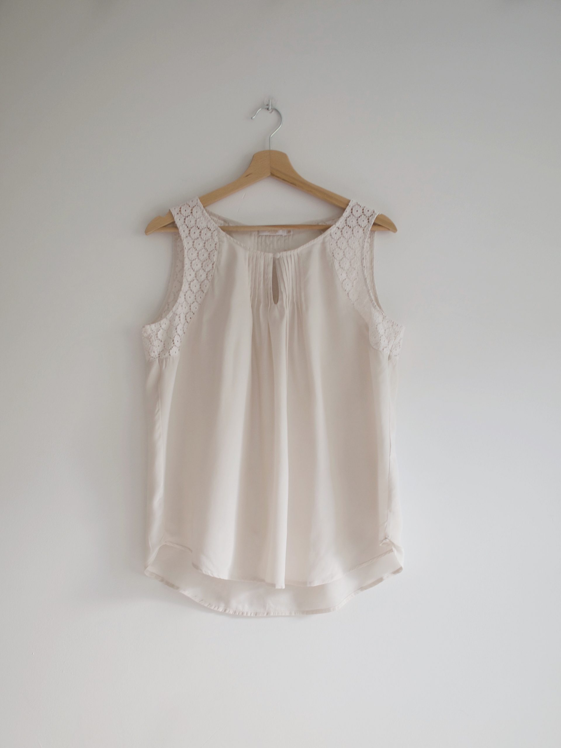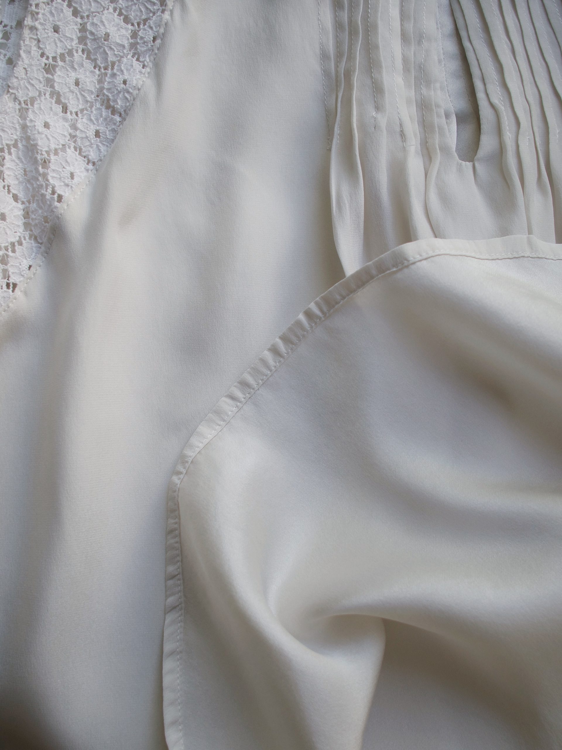 Rozmiar z metki: 44 Skład: 100% jedwab, koronka: bawełna/poliamid Stan: bez wad Szerokość w klatce 54 cm Długość całkowita 67 cm