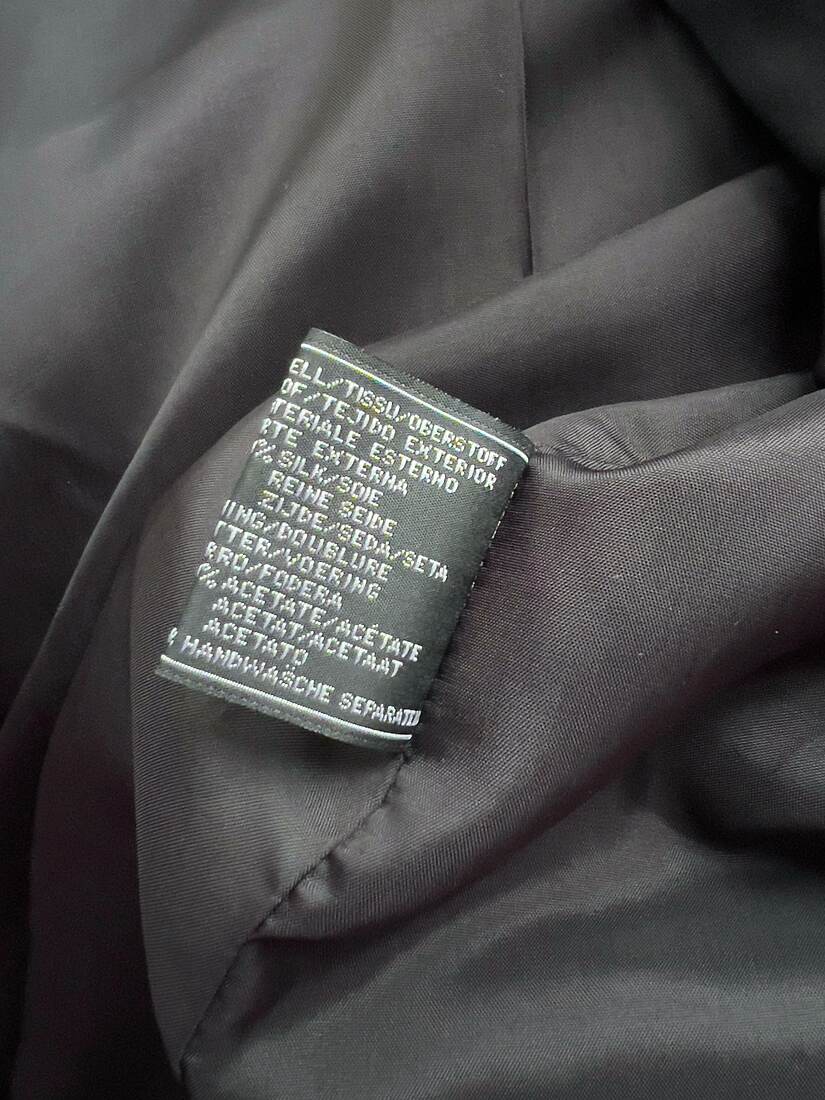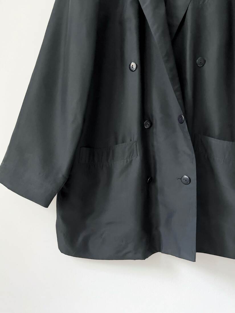 Dwurzędowa marynarka vintage. Materiał wierzchni to 100% gładki jedwab, podszewka 100% acetat. Fason jest dość luźny, polecam na L-XL, lub jako mocny oversize. Bez wad.