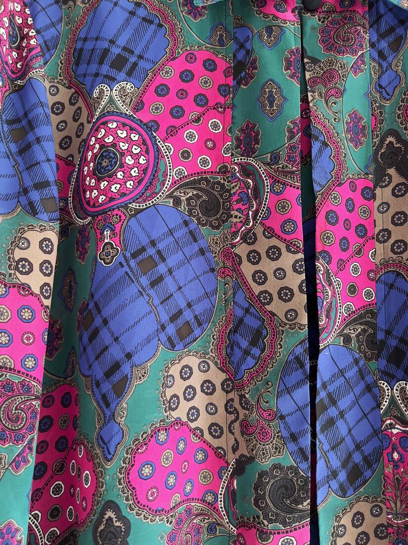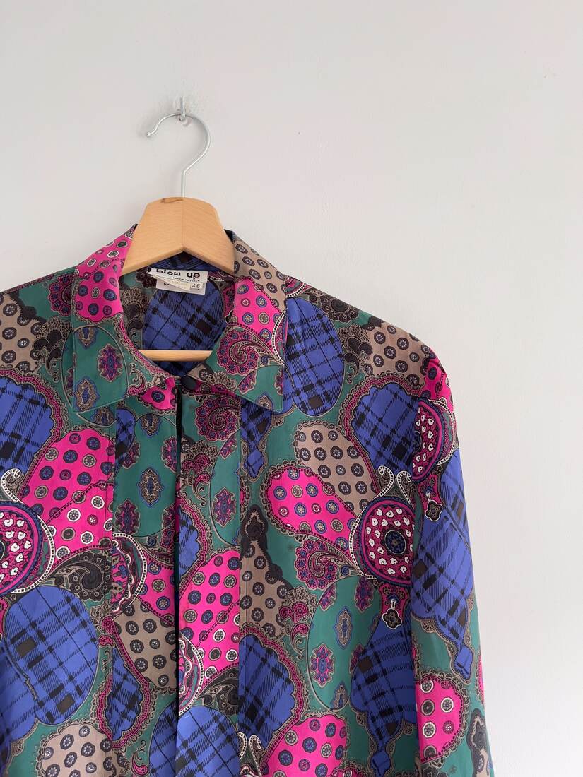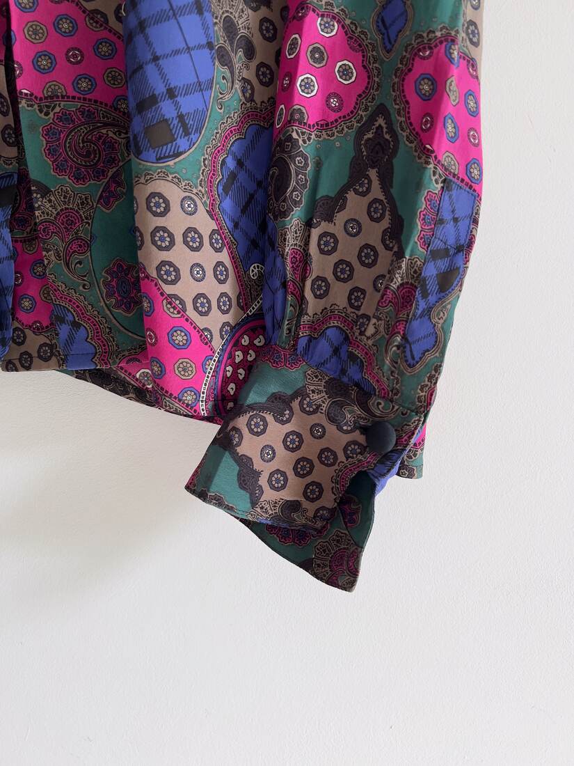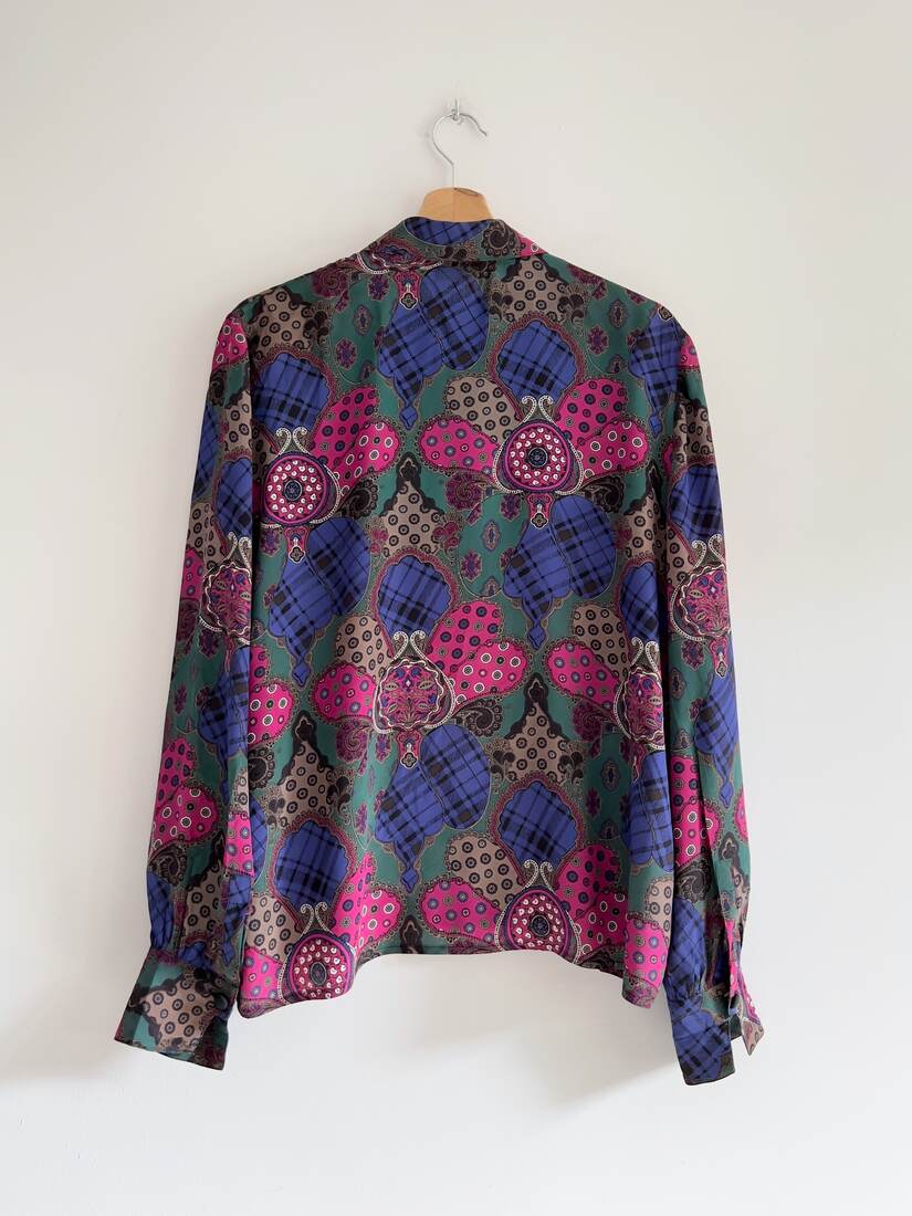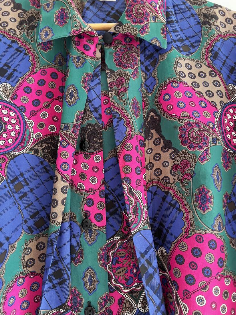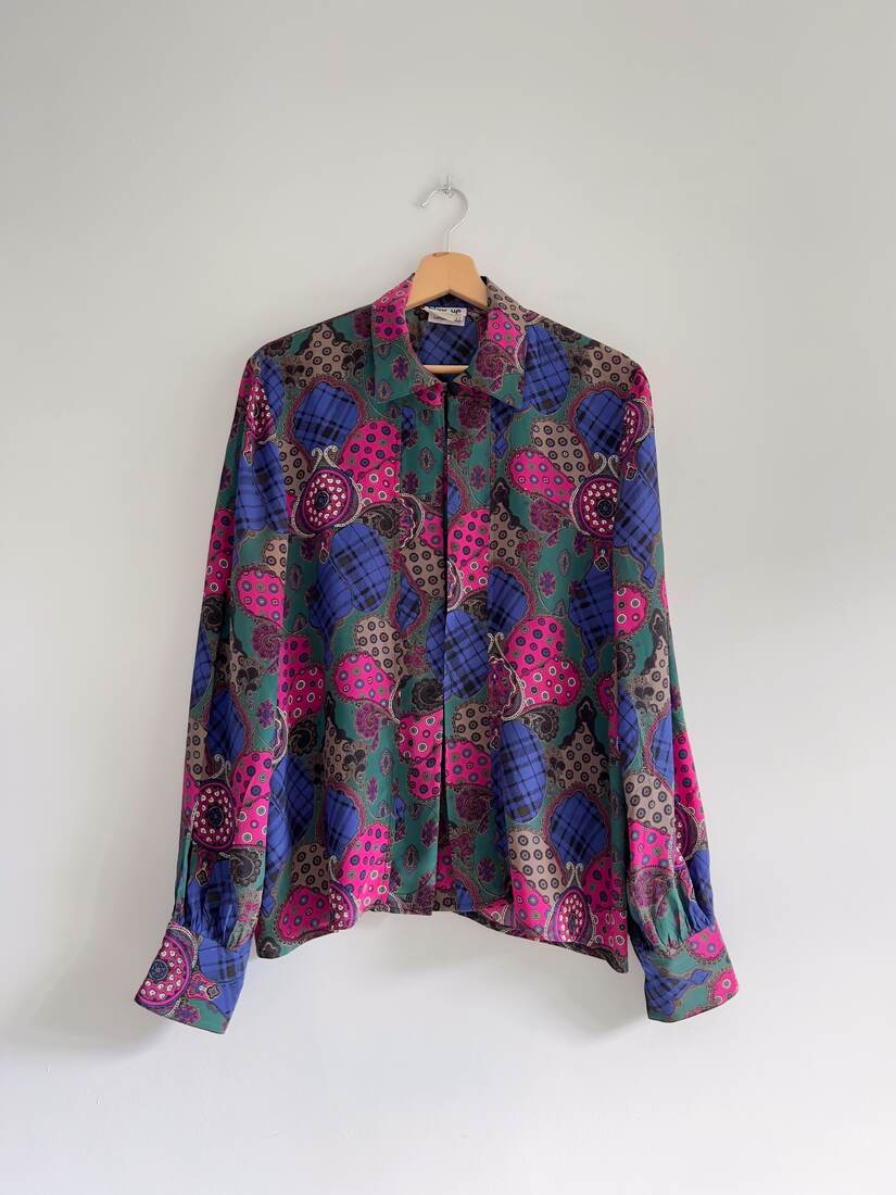Unikatowa koszula vintage, wyprodukowana we Włoszech. Jest wykonana z gładkiego, miłego w dotyku materiały zawierającego jedwab. Rozmiar z metki 46, bardzo dobry stan.
