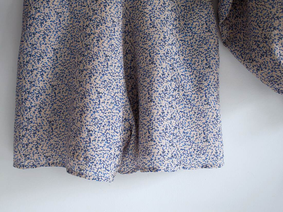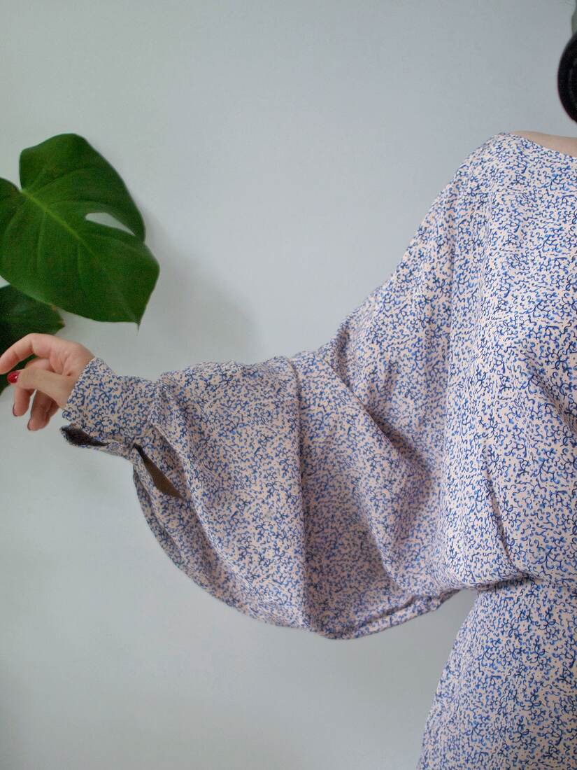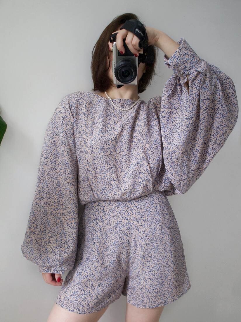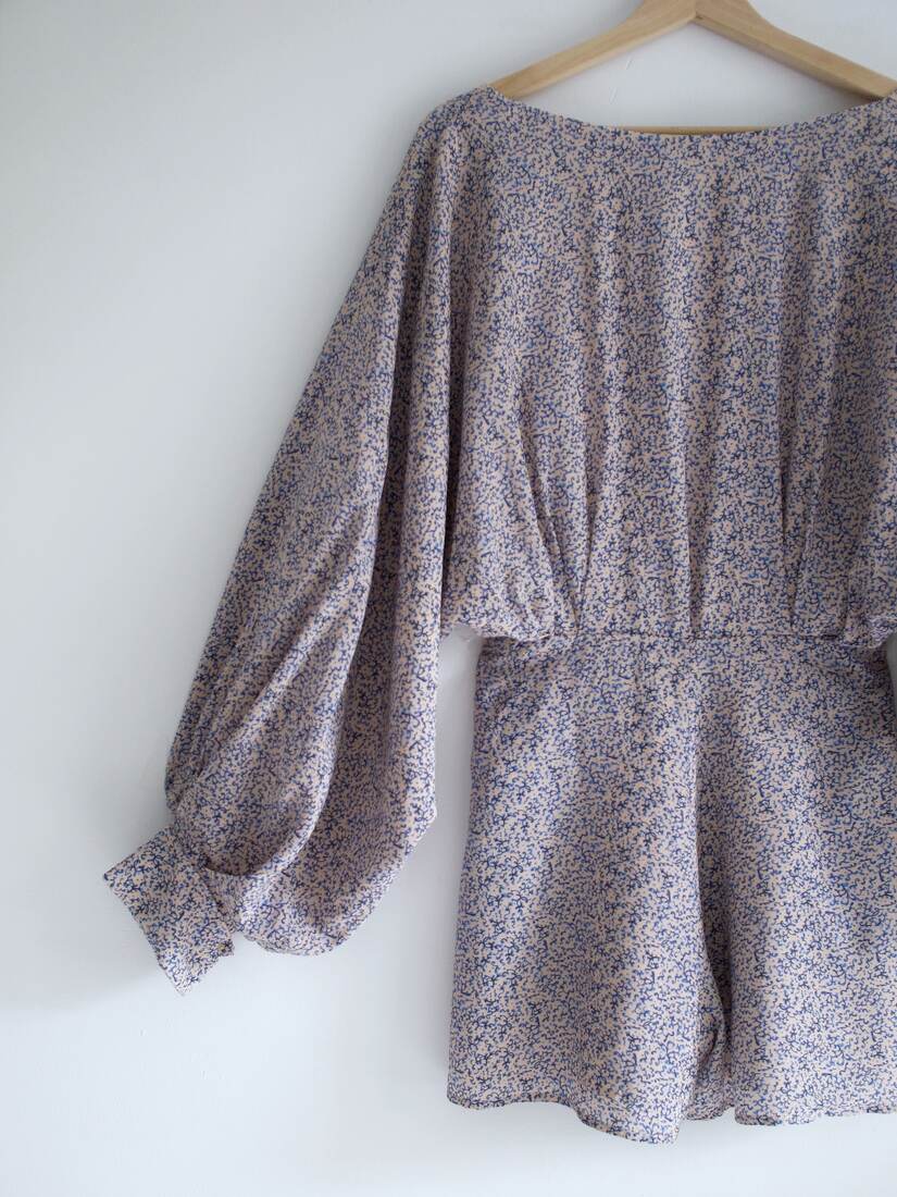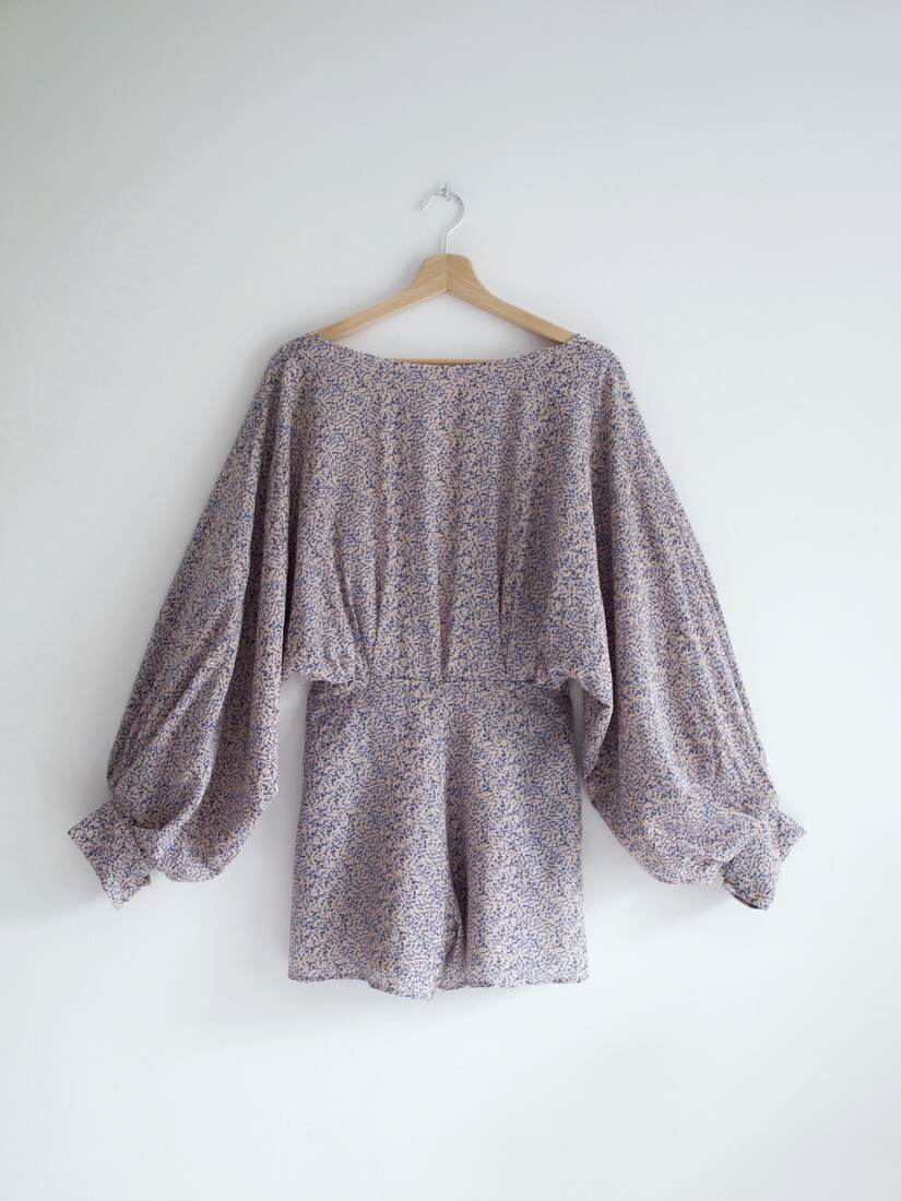 Unikatowy kombinezon, prawdopodobnie szyty na zamówienie. Bardzo szerokie rękawy są wykończone długim mankietem, z guzikami powlekanymi tkaniną, z tyłu większy dekolt i wycięcie, zapinane na guzik. Spodenki z kieszeniami, z tyłu zapinane na suwak. Kombinezon nie posiada żadnych metek, materiał wyglądem oraz w dotyku bardzo przypomina jedwab, przy próbie ognia też zachowuje się jak jedwab. Najprawdopodobniej jest to jedwab, lub mieszanka jedwabiu i wiskozy. Polecam na rozmiar XS-S. Idealny stan.