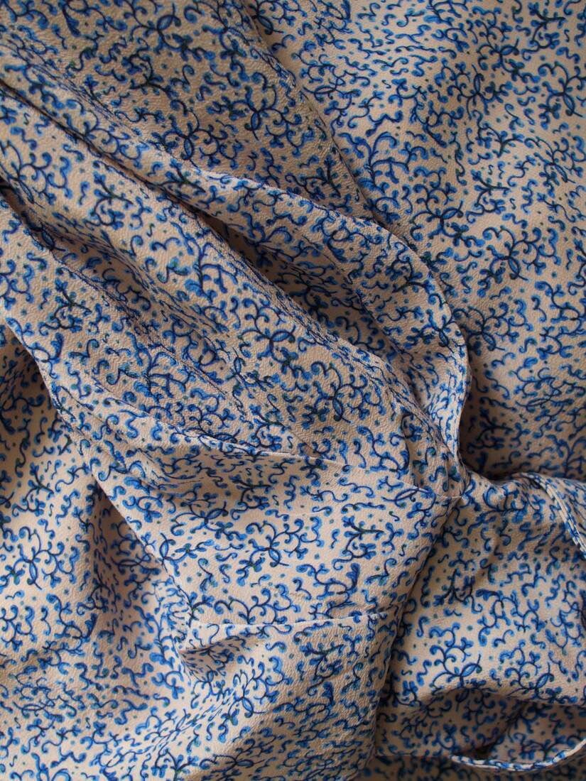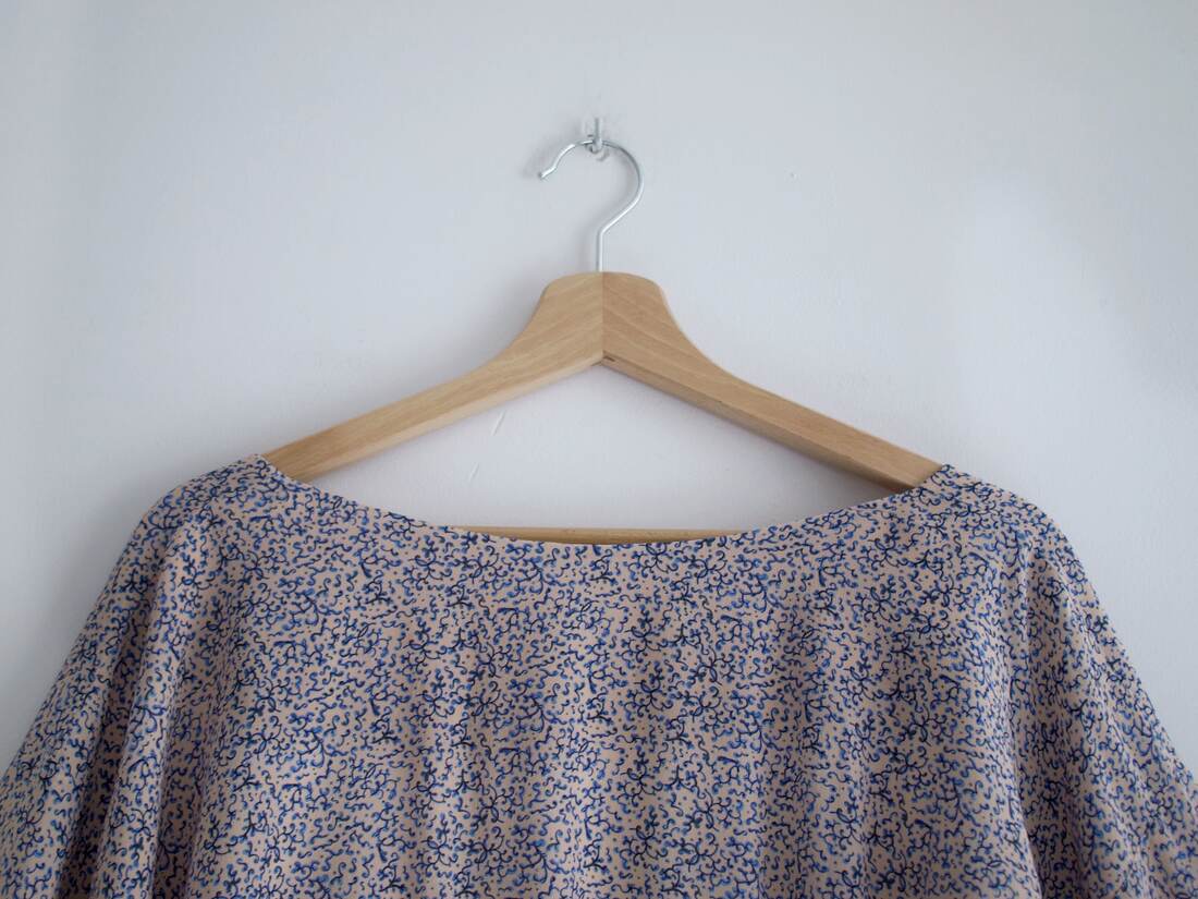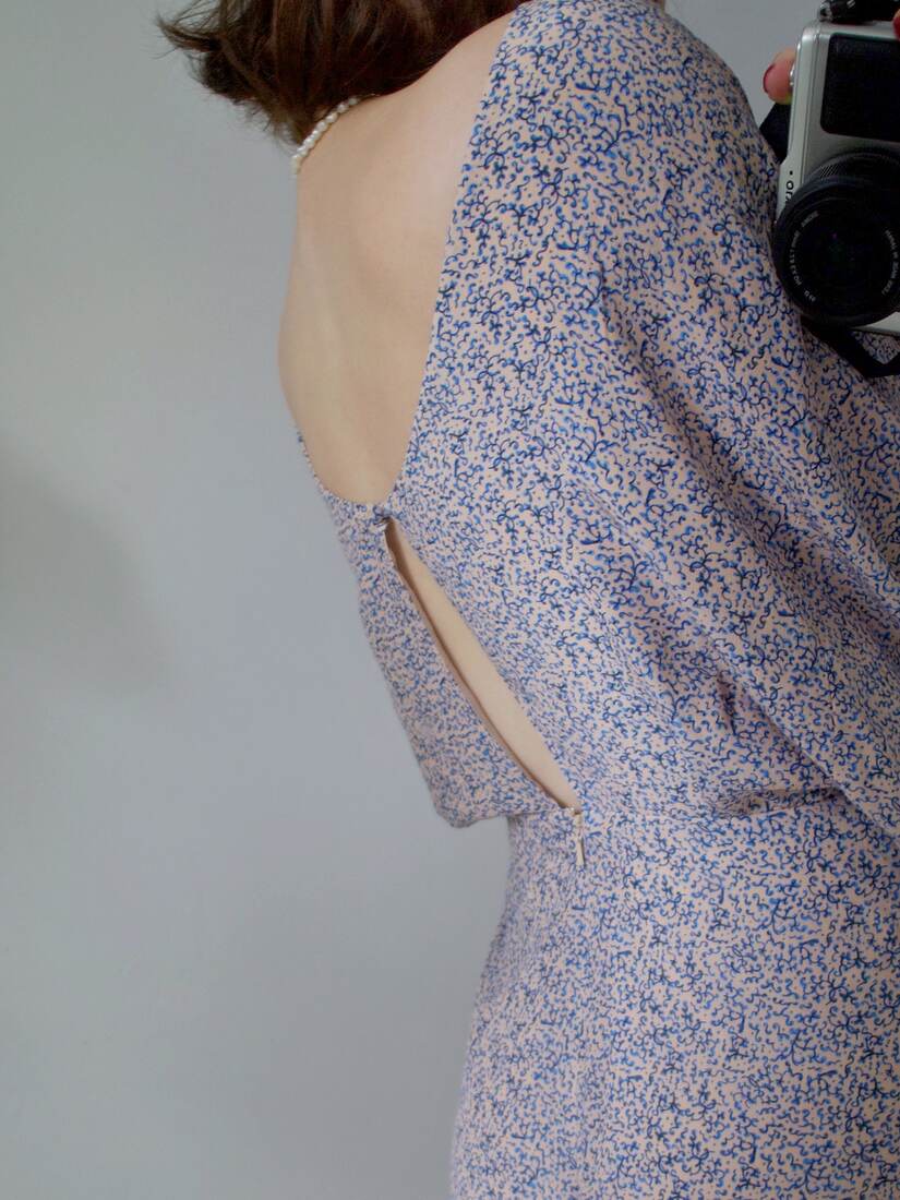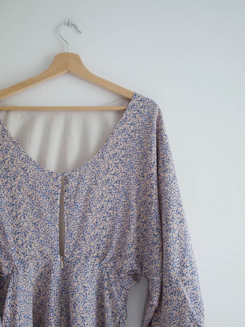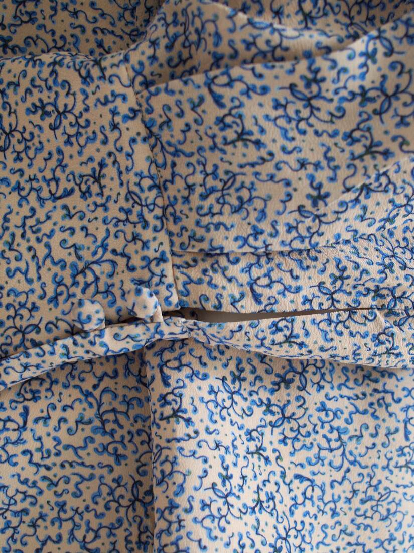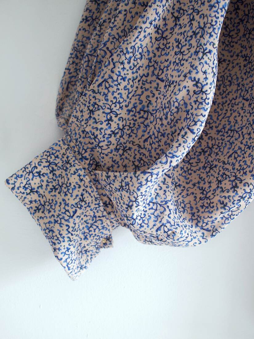 Unikatowy kombinezon, prawdopodobnie szyty na zamówienie. Bardzo szerokie rękawy są wykończone długim mankietem, z guzikami powlekanymi tkaniną, z tyłu większy dekolt i wycięcie, zapinane na guzik. Spodenki z kieszeniami, z tyłu zapinane na suwak. Kombinezon nie posiada żadnych metek, materiał wyglądem oraz w dotyku bardzo przypomina jedwab, przy próbie ognia też zachowuje się jak jedwab. Najprawdopodobniej jest to jedwab, lub mieszanka jedwabiu i wiskozy. Polecam na rozmiar XS-S. Idealny stan.