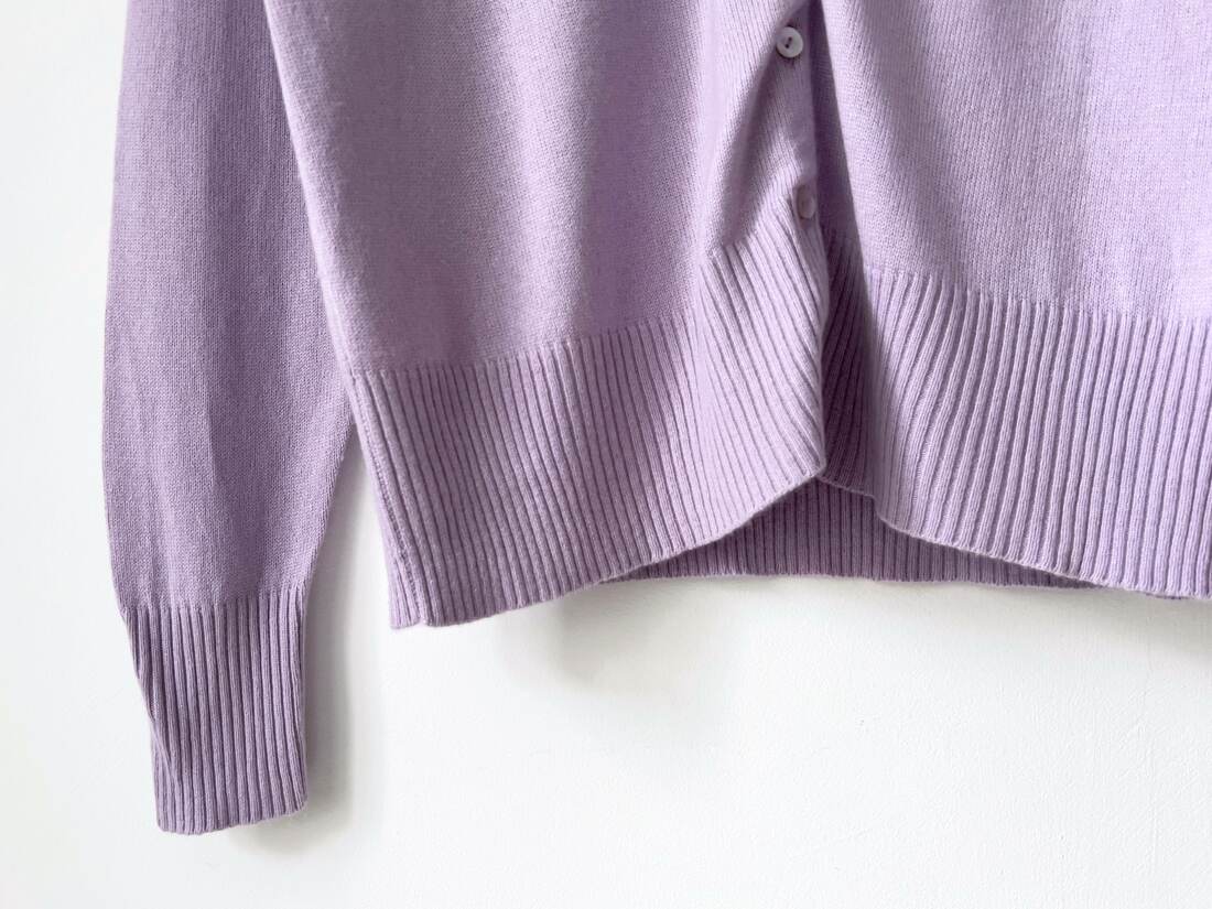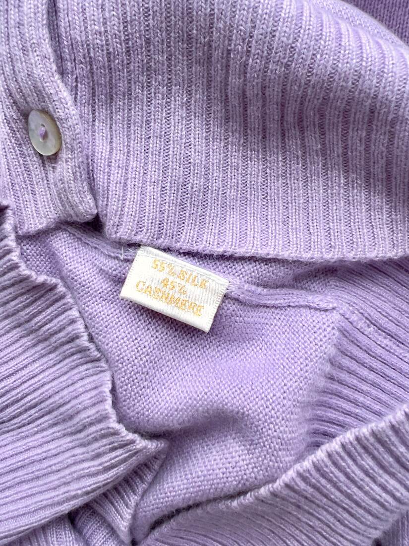 Rozpinany liliowy sweter, wykonany z mięciutkiej mieszanki jedwabiu i kaszmiru. Rozmiar z metki M, bez wad.