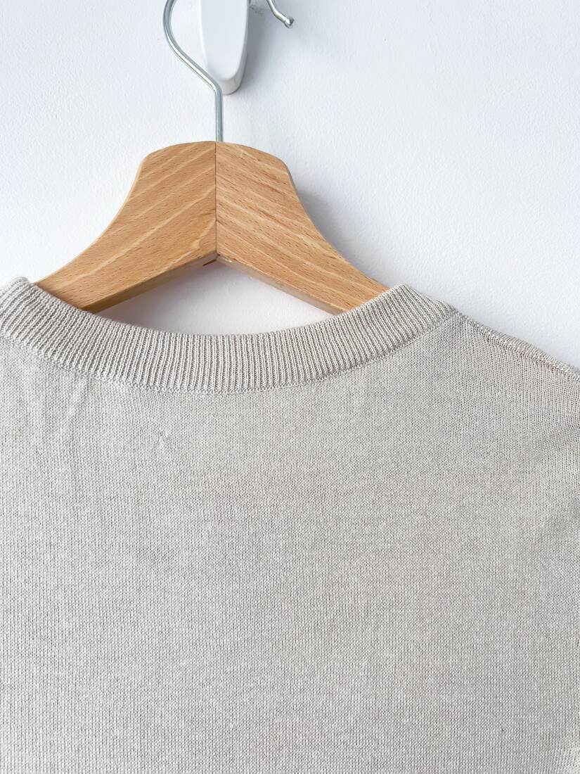 Dzianinowa bluzka, wykonana z bardzo miłej w dotyku mieszanki jedwabiu oraz kaszmiru. Rozmiar z metki M, będzie pasować również na S. Na plecach jest milimetrowe cerowanie, pokazane w zbliżeniu na zdjęciu. Nie jest widoczne w noszeniu. Poza tym bez wad.