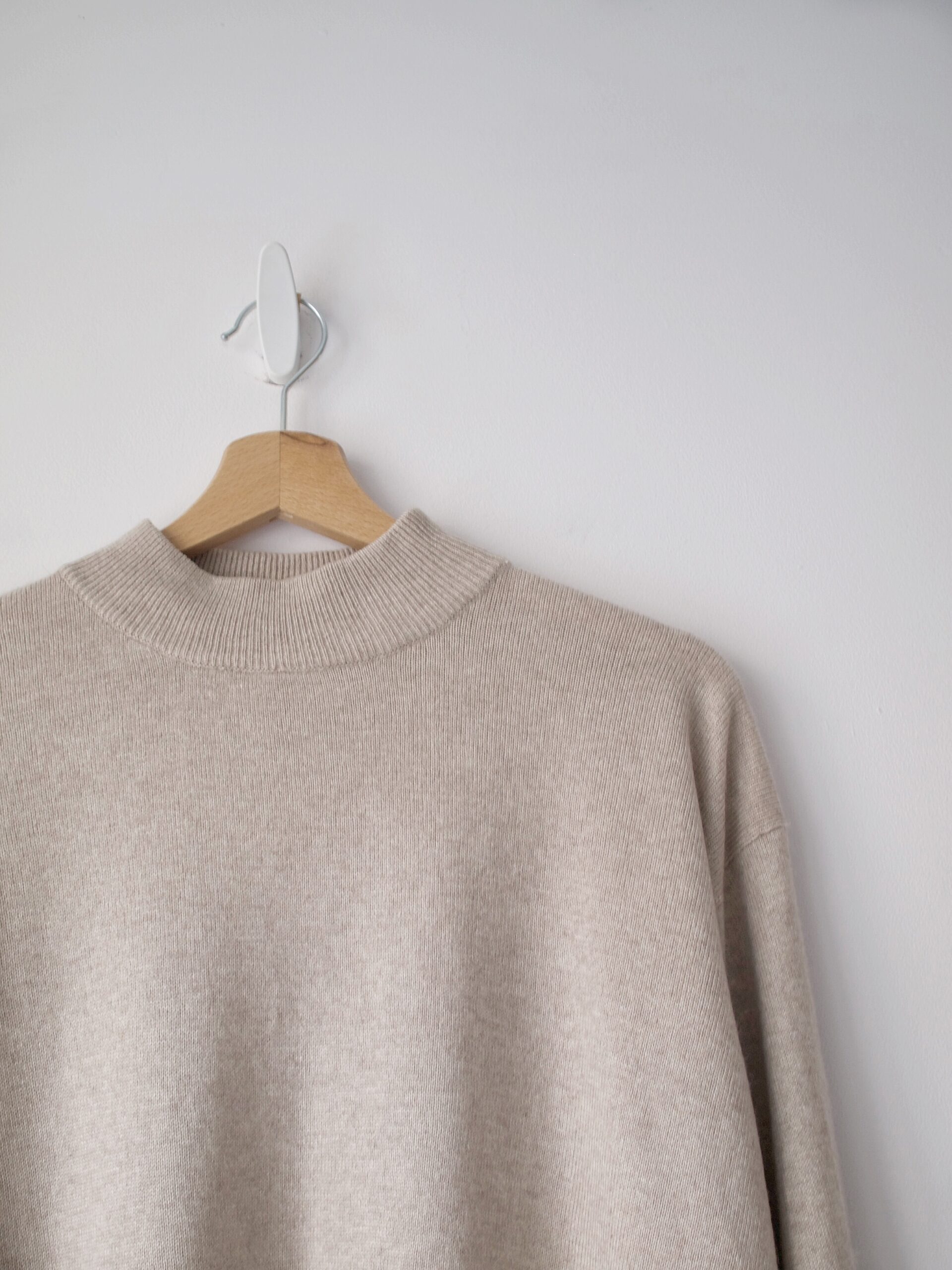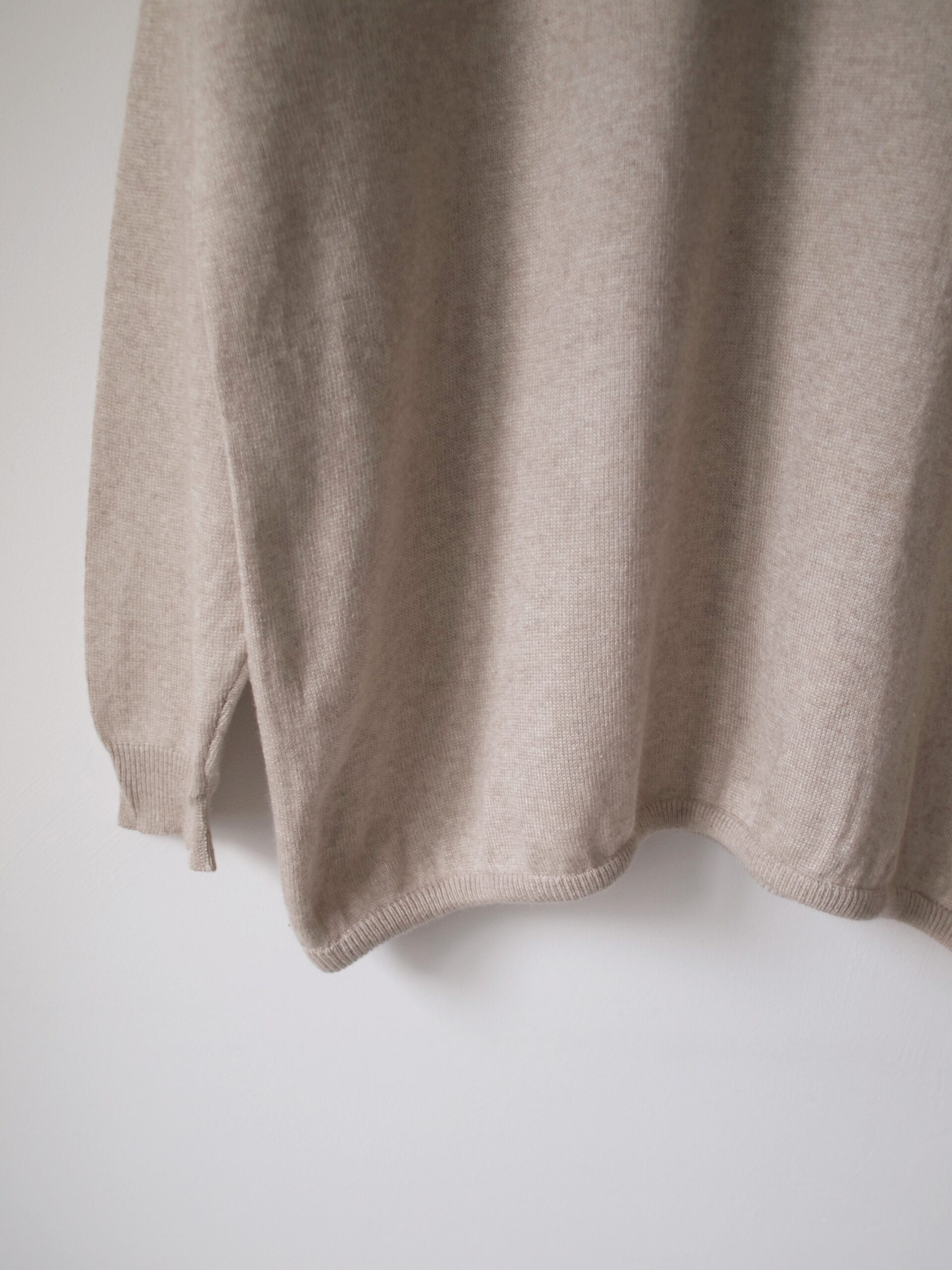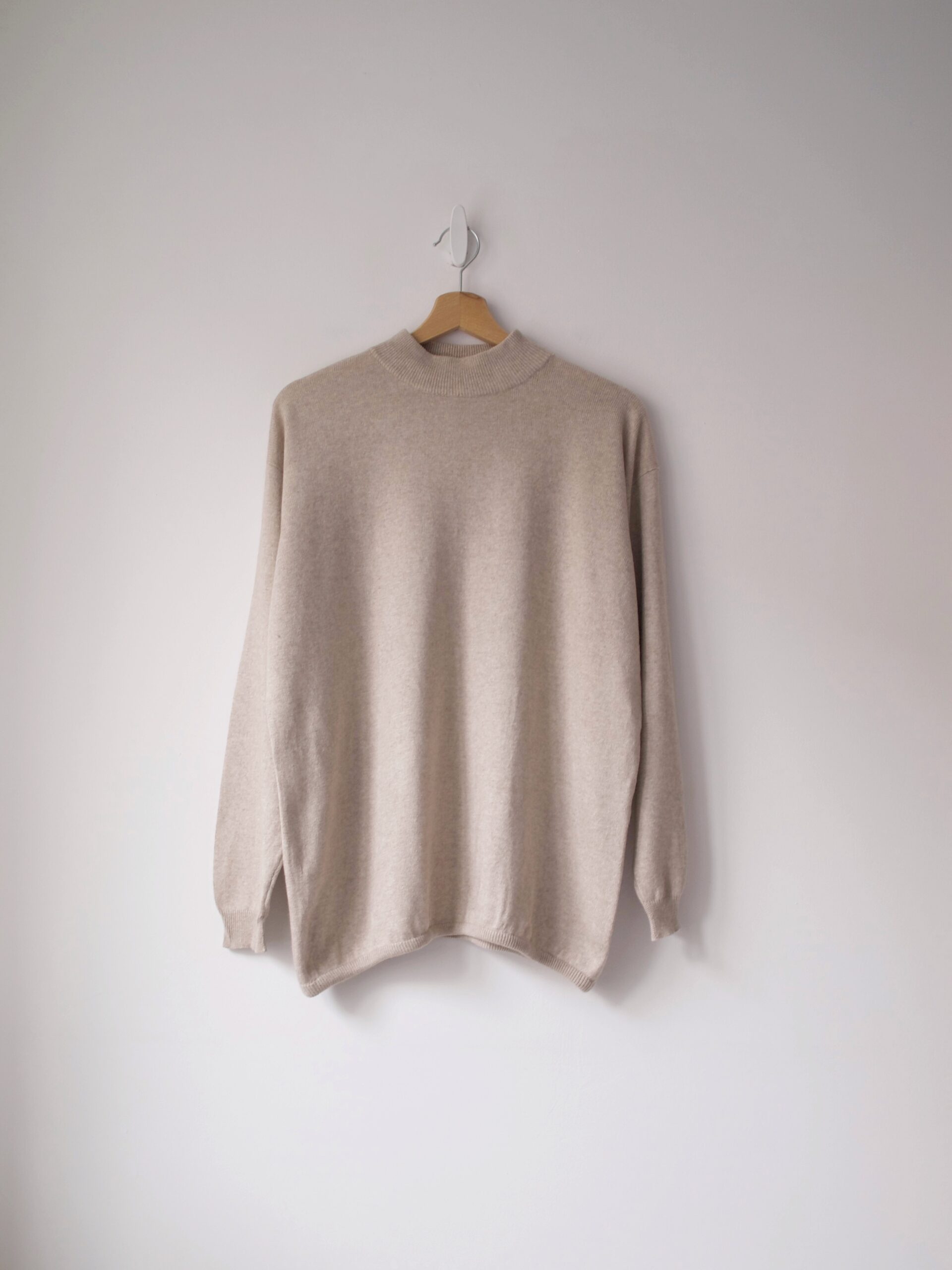 Minimalistyczny kaszmirowy sweter o pudełkowym kroju. Sweter bardzo miękki i przyjemny, ma dwie małe zacerowane dziurki, nie widoczne w noszeniu, poza tym brak mankamentów. Wymiary poniżej.
