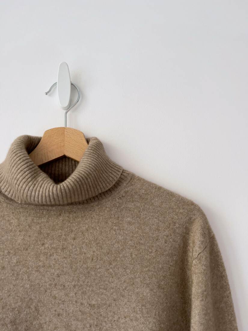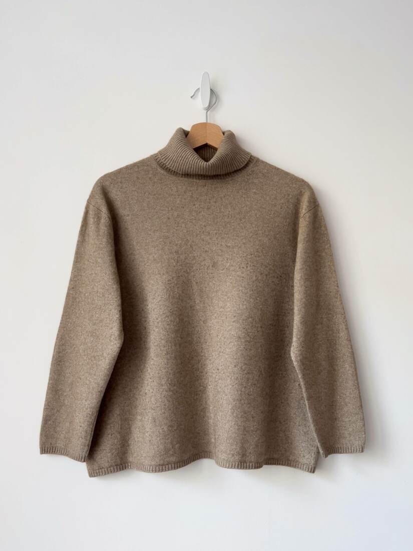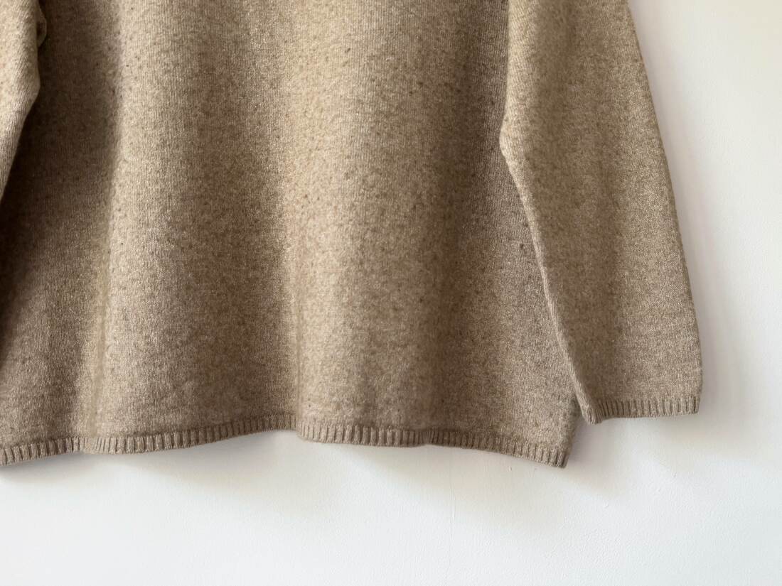 Sweter w kolorze ciepłego beżu. Wykonany z miłej w dotyku mieszanki jedwabiu i kaszmiru. Jest delikatnie sfilcowany, nie jest to widoczne i nie przeszkadza w noszeniu, sweter jest puszysty i miękki. Rozmiar z metki 48, pudełkowy, krótszy fason, rękawy 3/4.