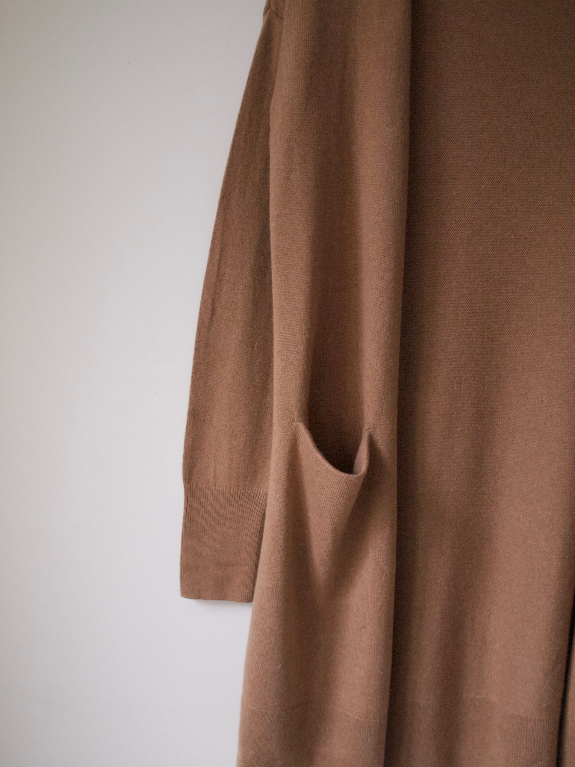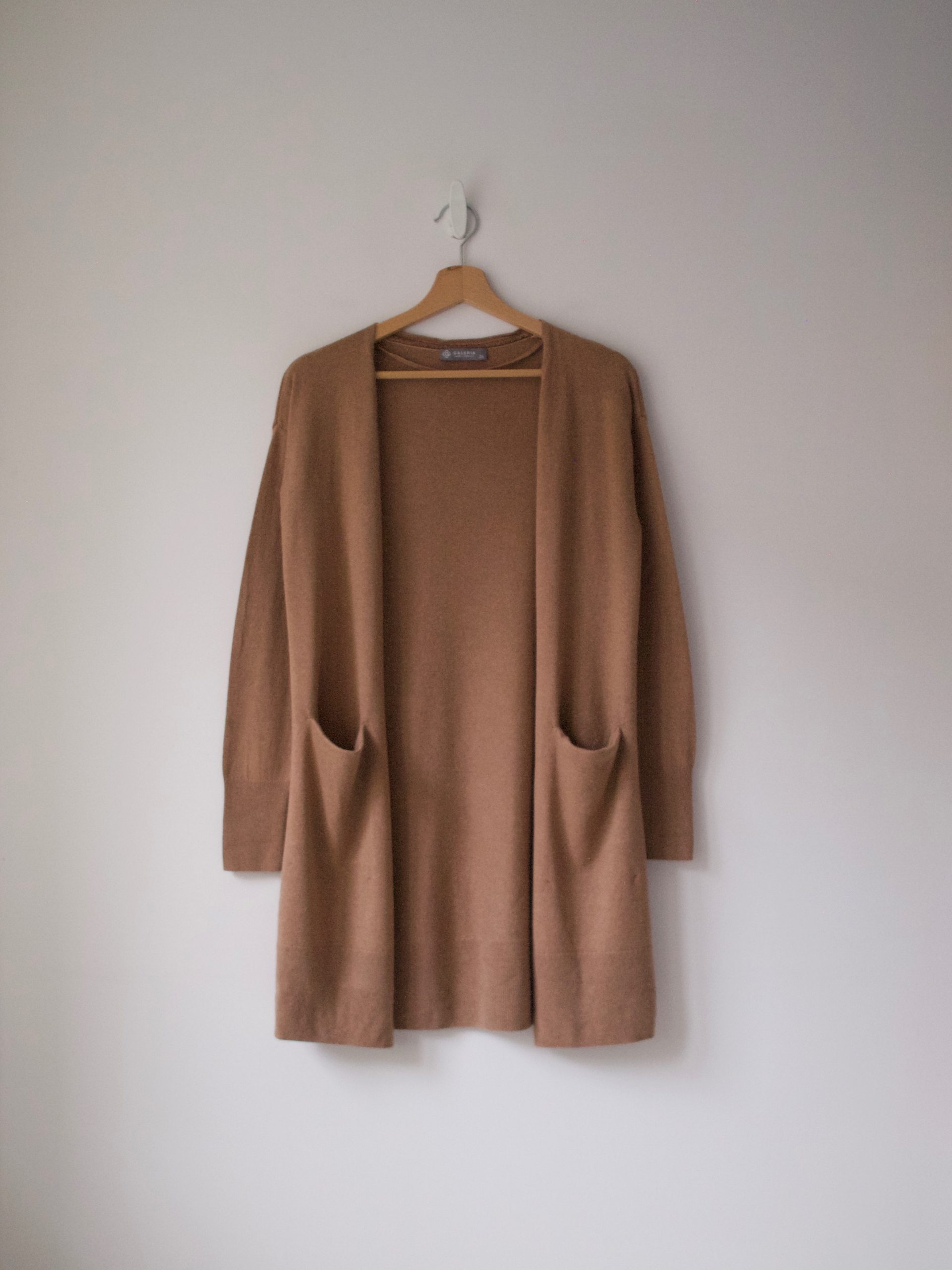Beżowy kardigan, wykonany z mieszanki jedwabiu oraz kaszmiru. Rozmiar z metki: 34 Skład: 65% jedwab, 35% kasmir Stan: idealny Szerokość w klatce 43 cm Długośćcałkowita 85 cm