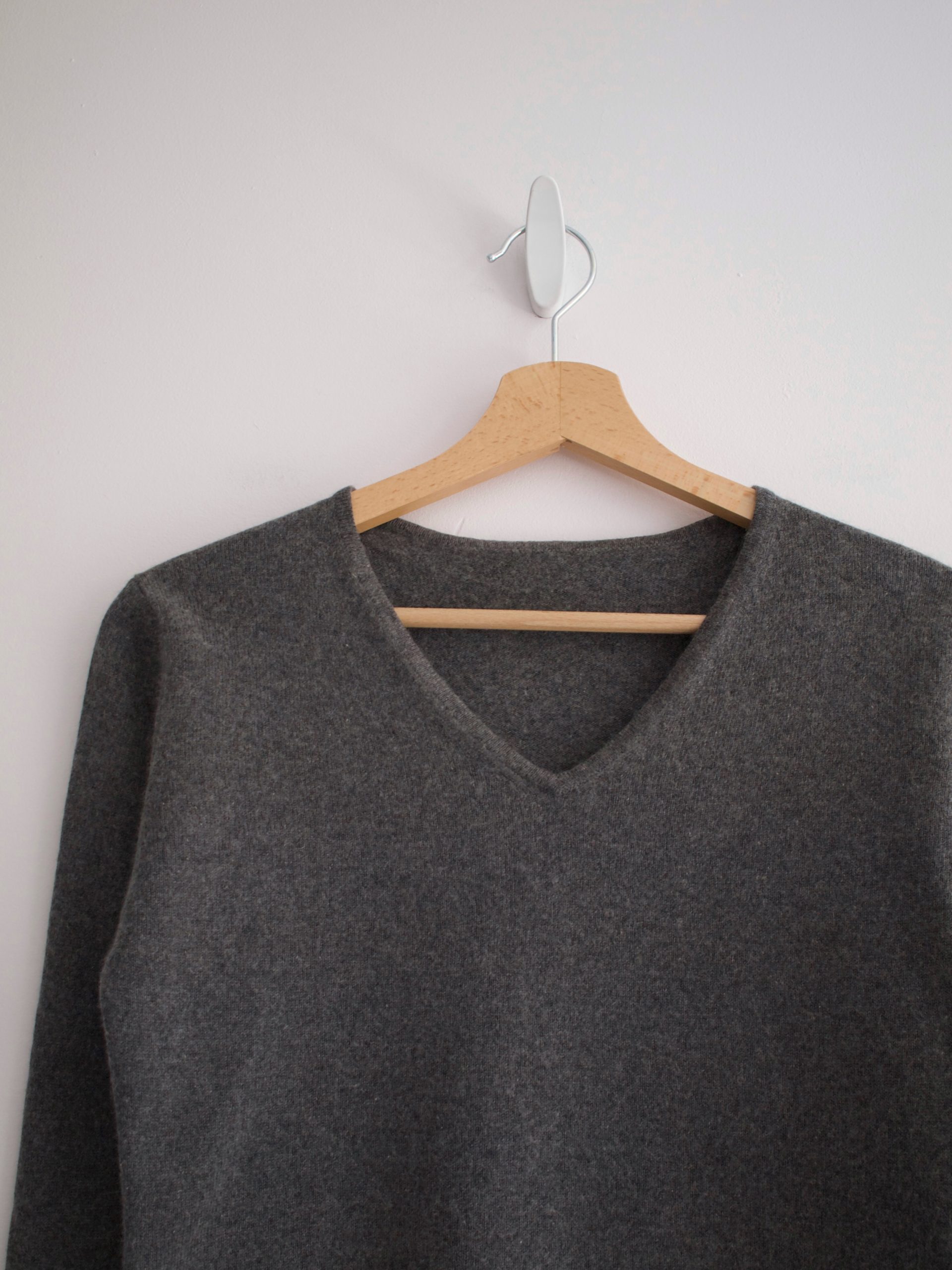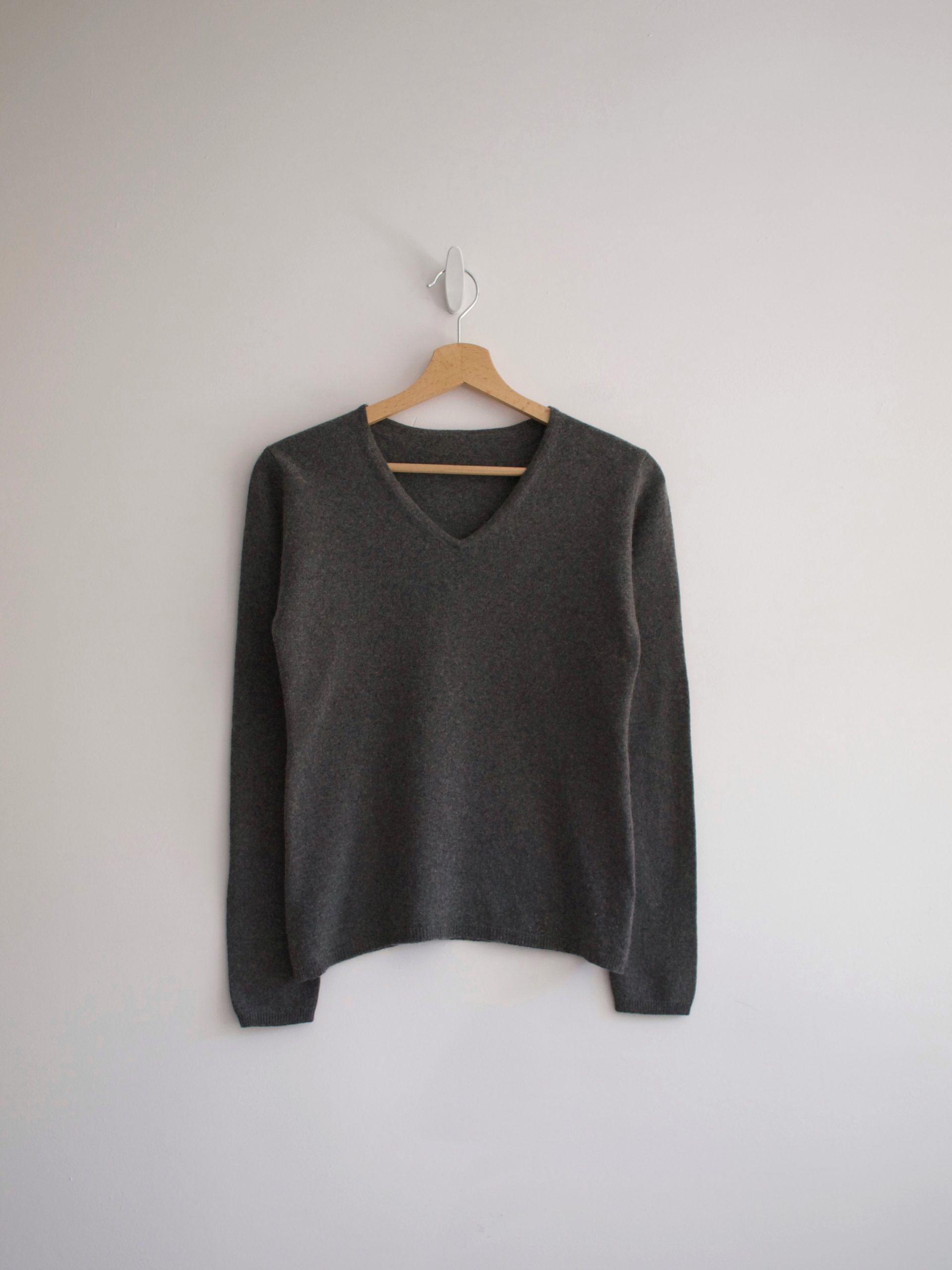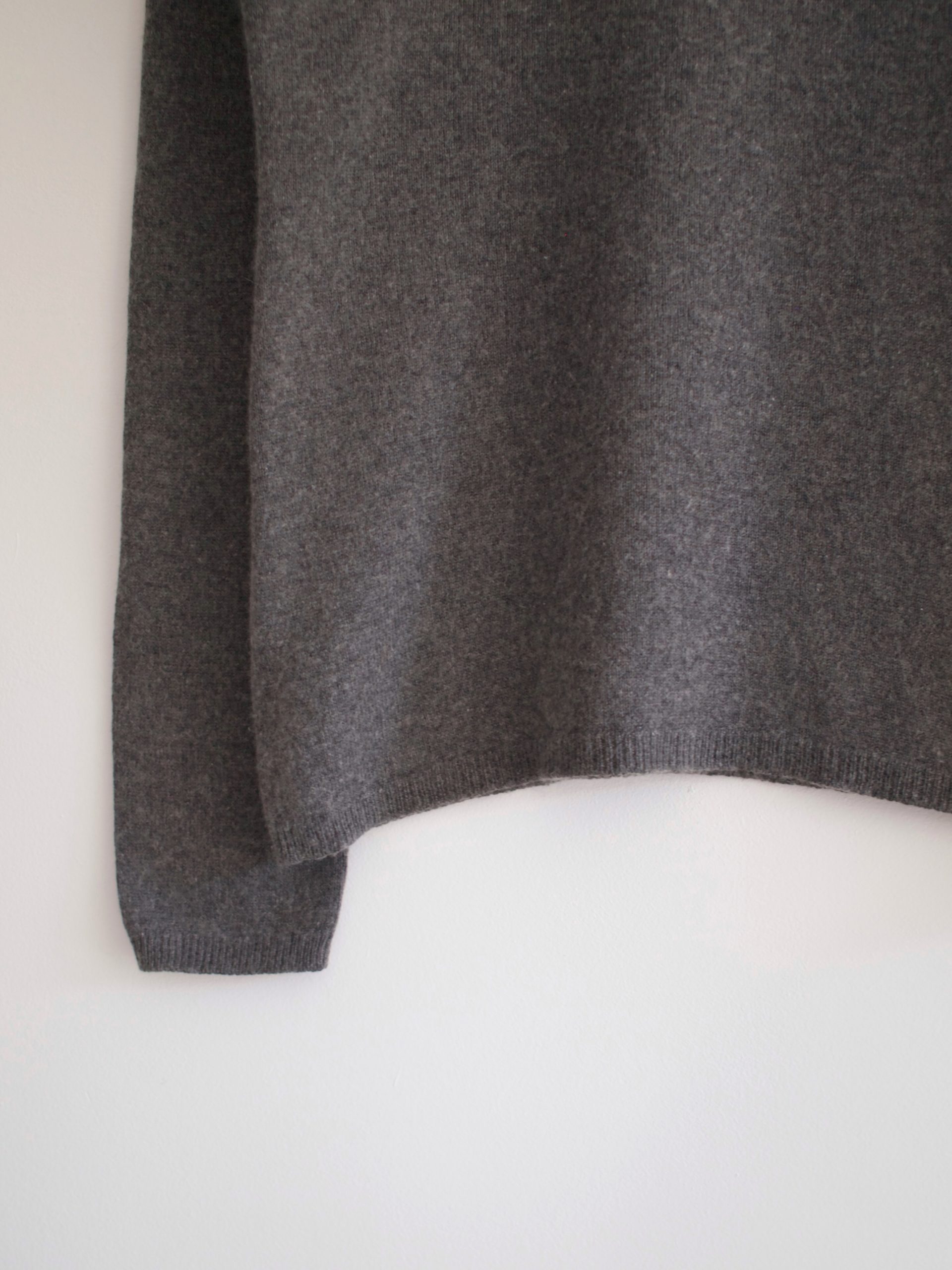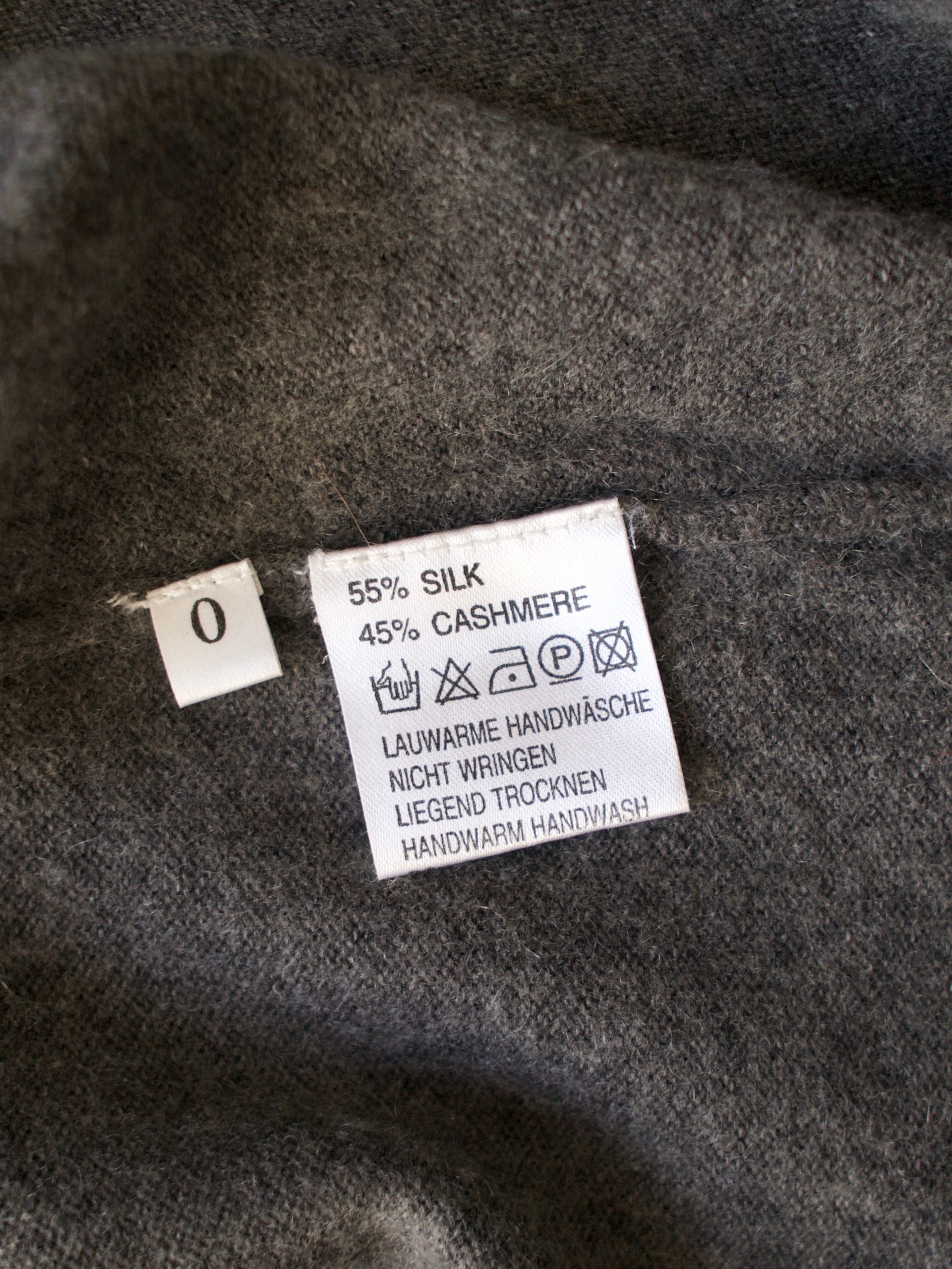 Basicowy sweter, wykonany z miłej w dotyku mieszanki jedwabiu oraz kaszmiru. Rozmiar z metki: 0 (XS) Skład: na zdjęciu Stan: bez wad Szerokość w klatce 42 cm Długośćcałkowita 53 cm