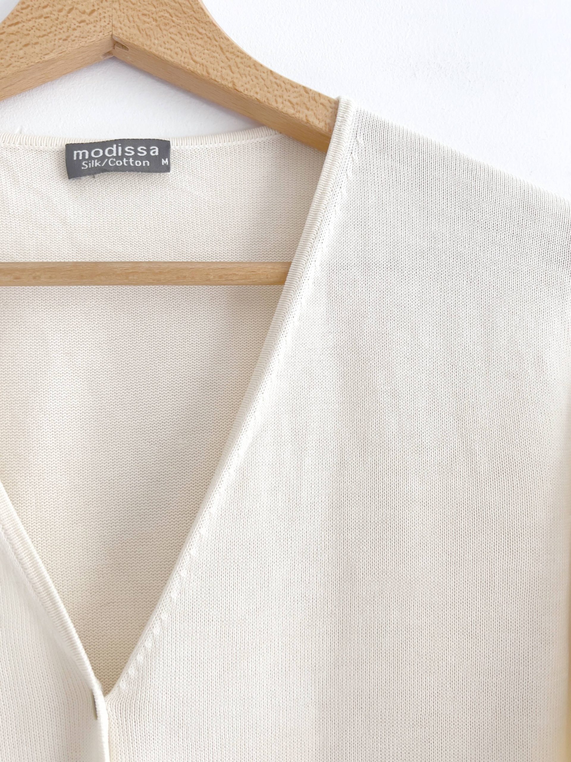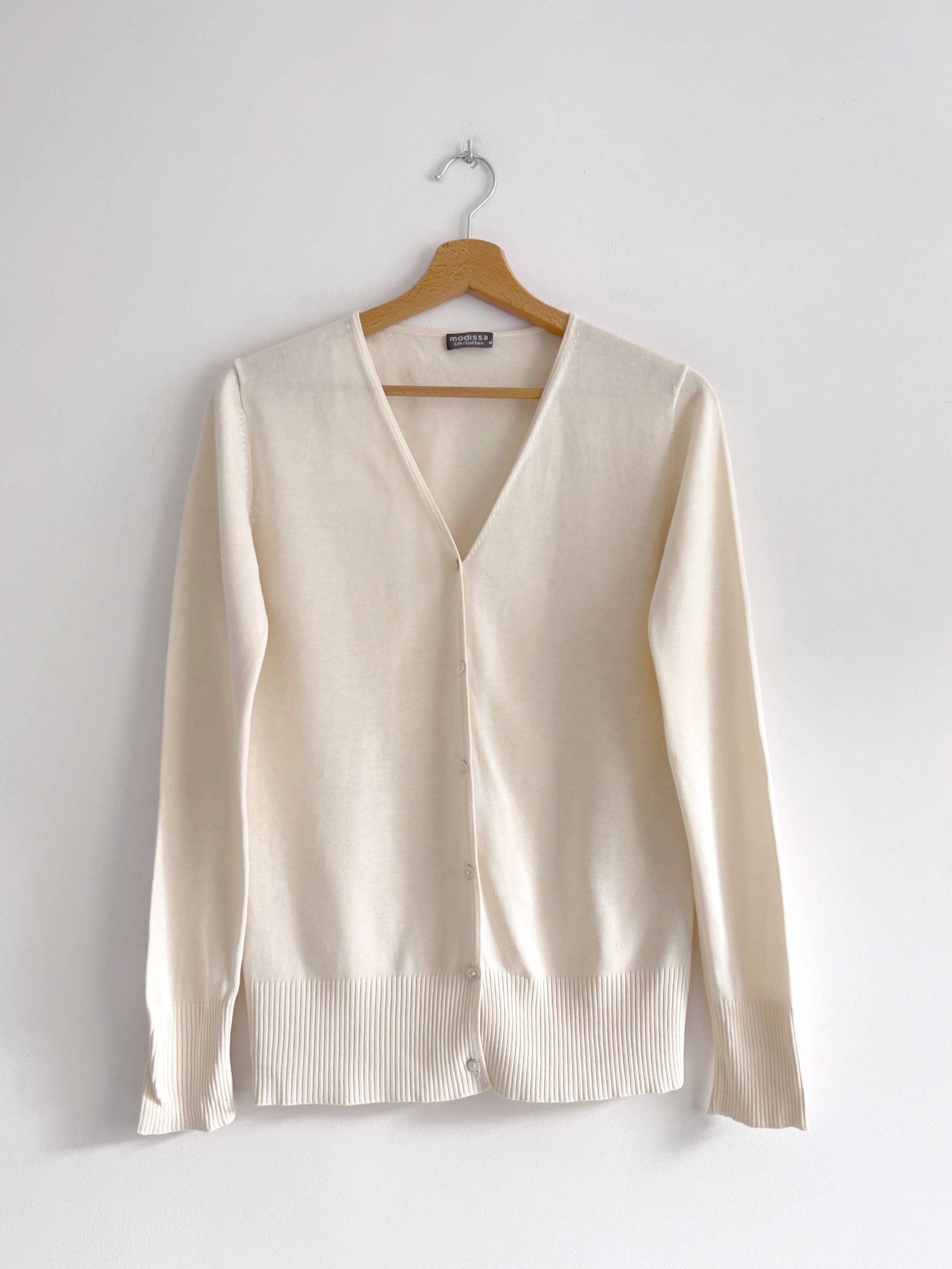 Kardigan vintage, wykonany z mieszanki jedwabiu i bawełny. Brak metki ze składem procentowym, przypuszczam że 70% jedwab i 30% bawełna. Polecam na S-M, bez wad.