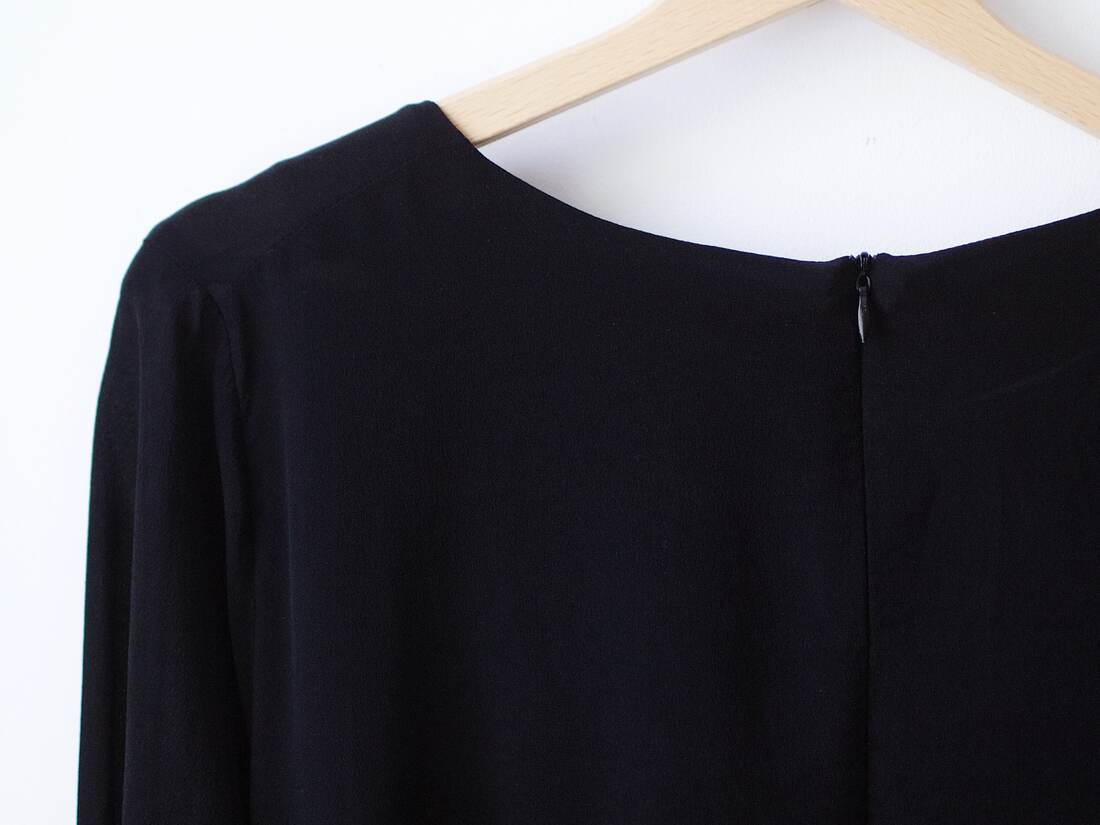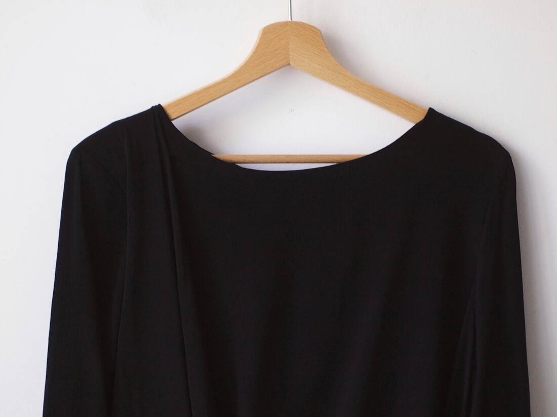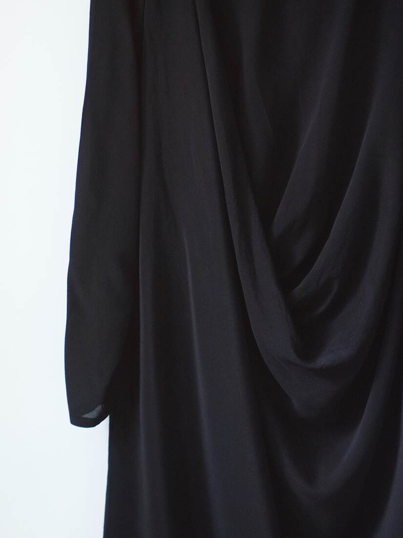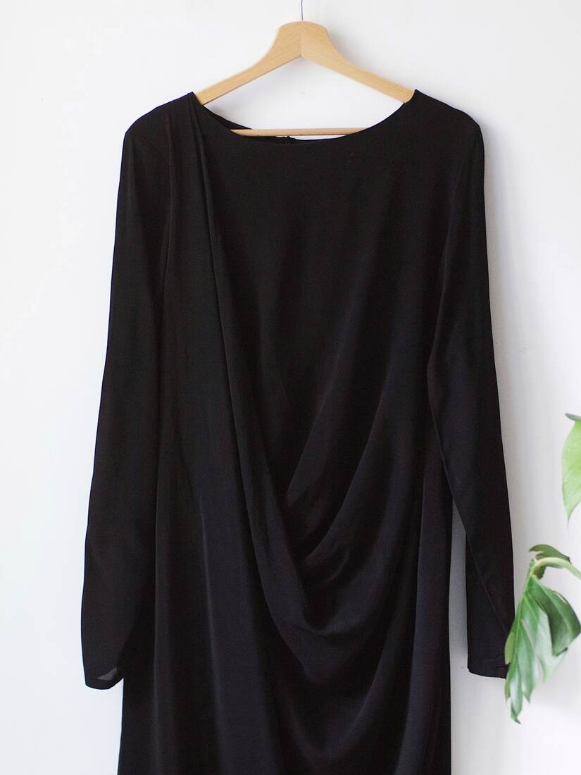 Jedwabna sukienka o niestandardowym, asymetrycznym kroju. Długie rękawy, dekolt w łódkę, bez podszewki. Rozmiar z metki L, na mniejszych rozmiarach też pięknie wygląda. Bez wad.