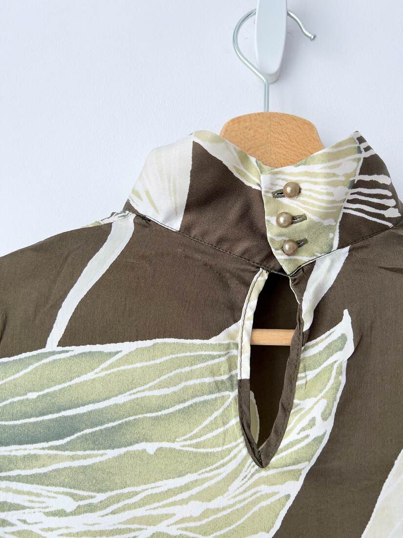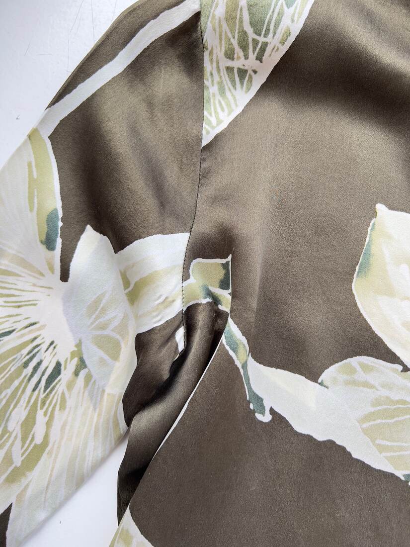 Jedwabna sukienka o kroju A-line. Bez podszewki. Polecam na rozmiar XS. Pod pachą jest delikatne rozciągnięcie materiału, pokazane na zdjęciu w zbliżeniu. Nie jest widoczne w noszeniu. Poza tym bez wad.
